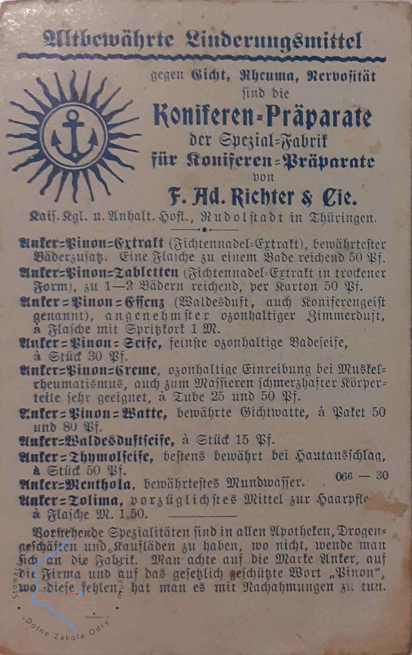 CHOJNA, Gotycka Brama Świecka na obrazku kolekcjonerskim firmy “F.Ad.Richter & Cie. in Rudolstadt”, producenta preparatów z roślin iglastych.