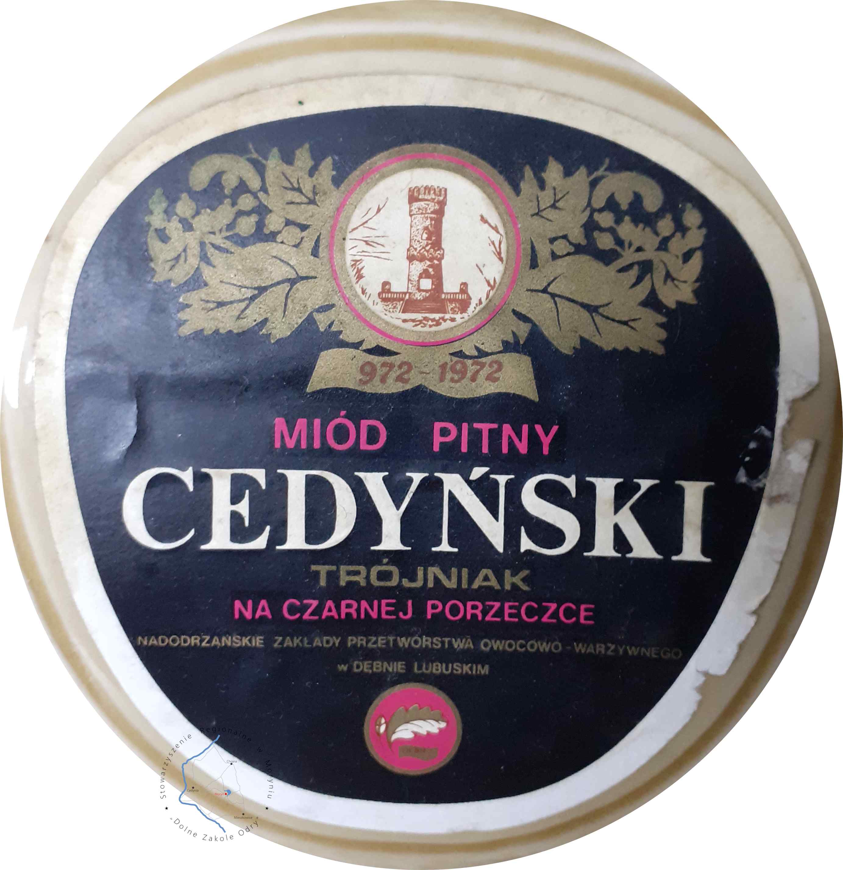 Butelka po Miodzie Pitnym, Trójniak Cedyński, Wyprodukowanego w nie istniejącym już Przedsiębiorstwie Owocowo-Warzywnym w Dębnie, na 1000-lecie bitwy pod Cedynią.