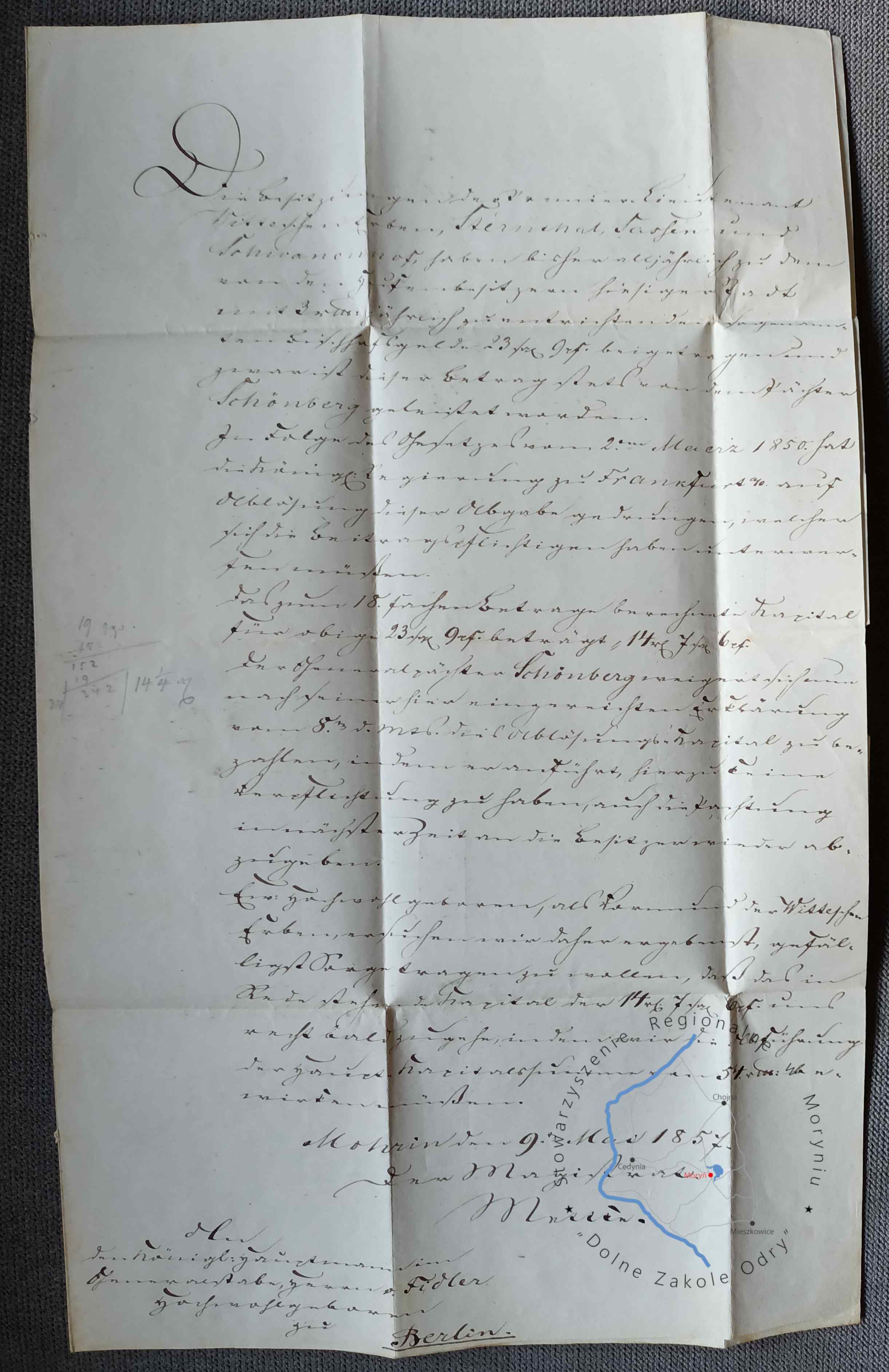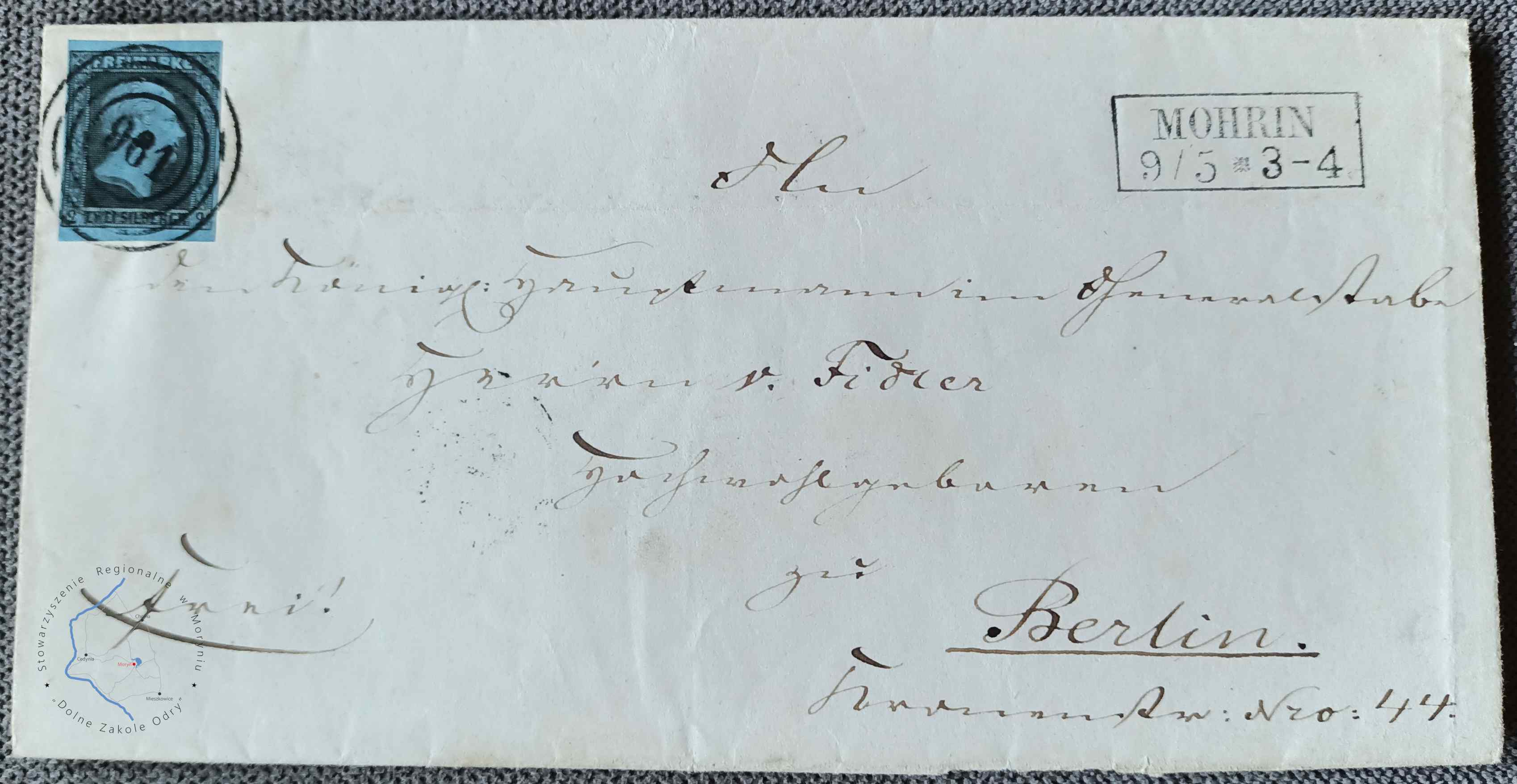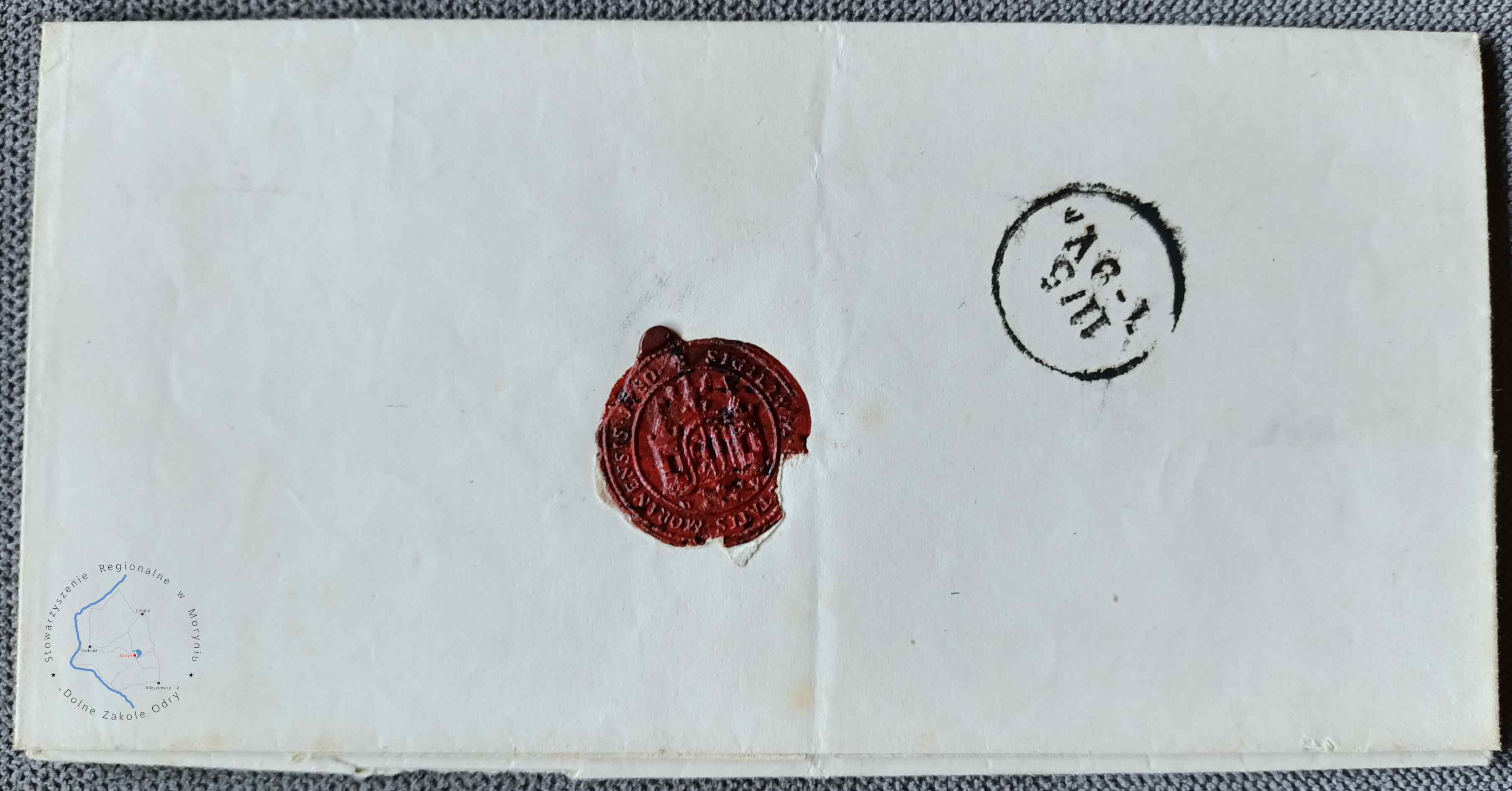 Pieczęć miejska miasta Moryń z 1780 roku na liście nadanym z Morynia do Berlina, ze znaczkiem skasowanym kasownikiem o numerze 961, przypisanym do urzędu pocztowego dla miejscowości Moryń. Kasownik został wprowadzony przez pocztę pruską od 15.11 1850 r. Stempel nadawczy ramkowy poczty (nazwa miejscowości w prostokątnej ramce) w miejscowości Moryń (Mohrin) typ IX wg Katalogu Specjalizowanego Znaków Pocztowych Ziem Polskich (KSZPZP), stosowany w okresie od 1847-1877, pierwsze cyfry w drugim wierszu oznaczają dzień i miesiąc nadania, 9 maja, kolejne godziny użycia stempla (pomiędzy 3 a 4). Datowanie listu 9 maja 1857 r.