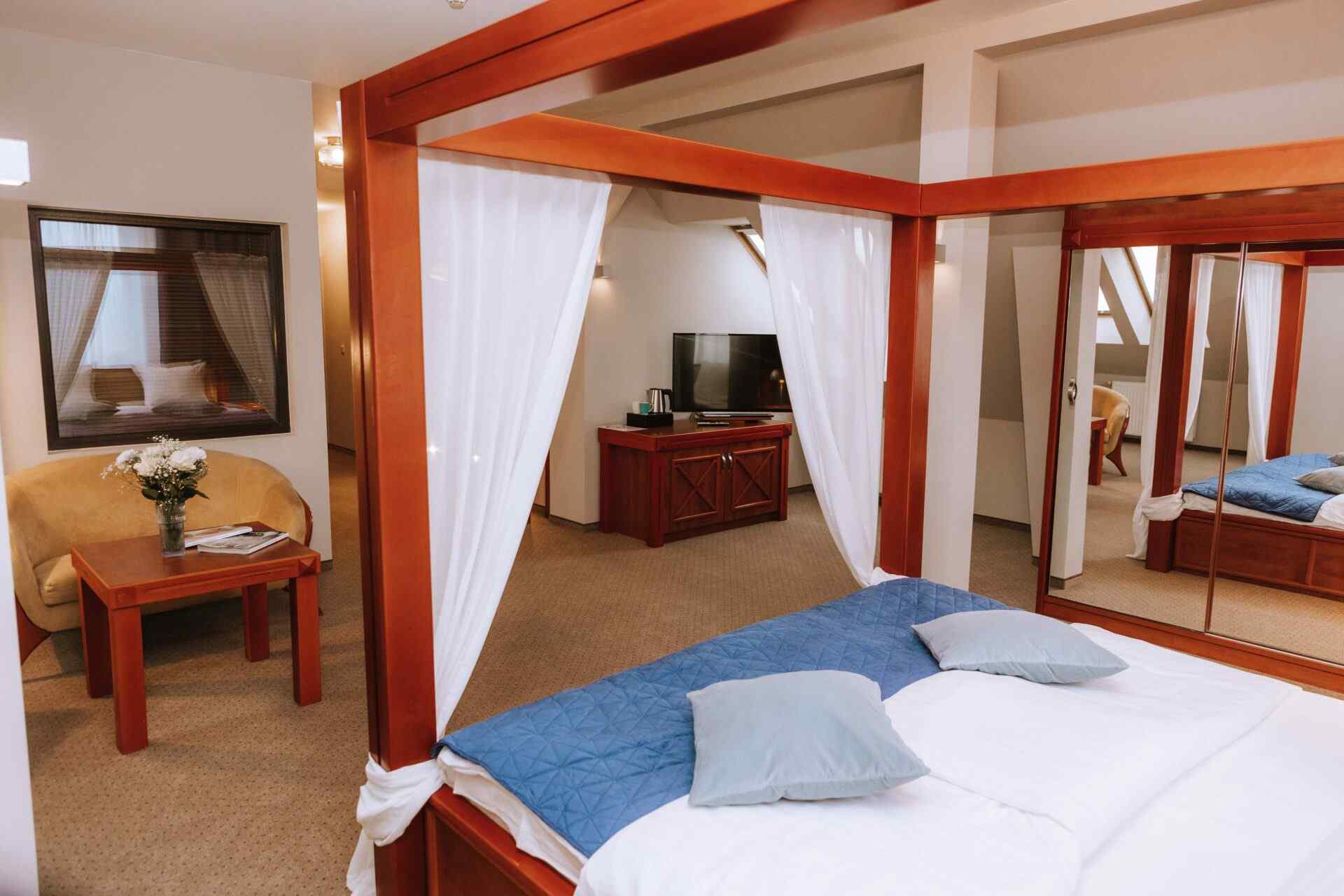 Dla naszych wyjątkowych gości przygotowany jest natomiast przytulny, a zarazem elegancki specjalny apartament z niespotykanym motywem architektonicznym (oknem pomiędzy pokojem i łazienką).