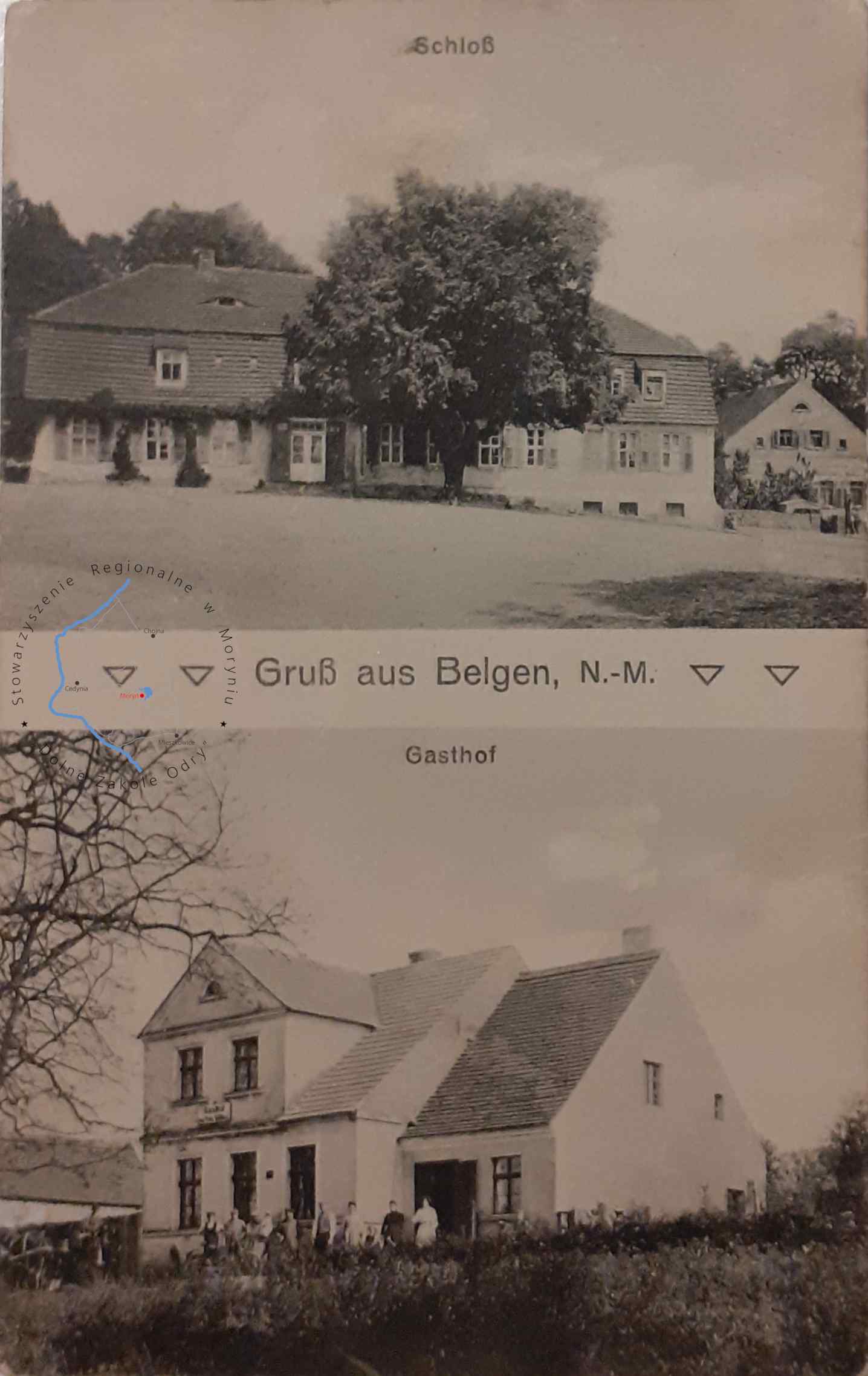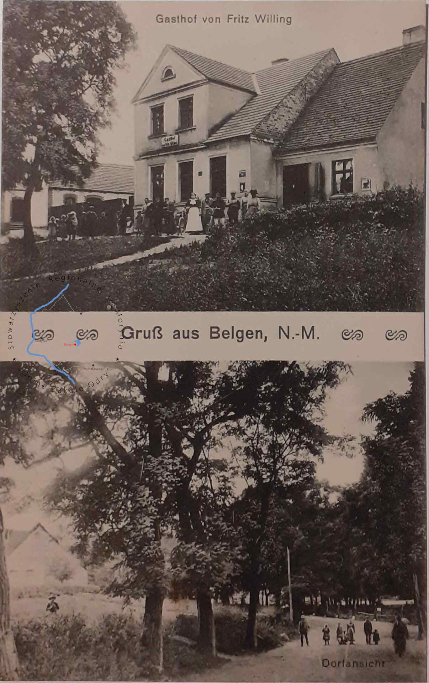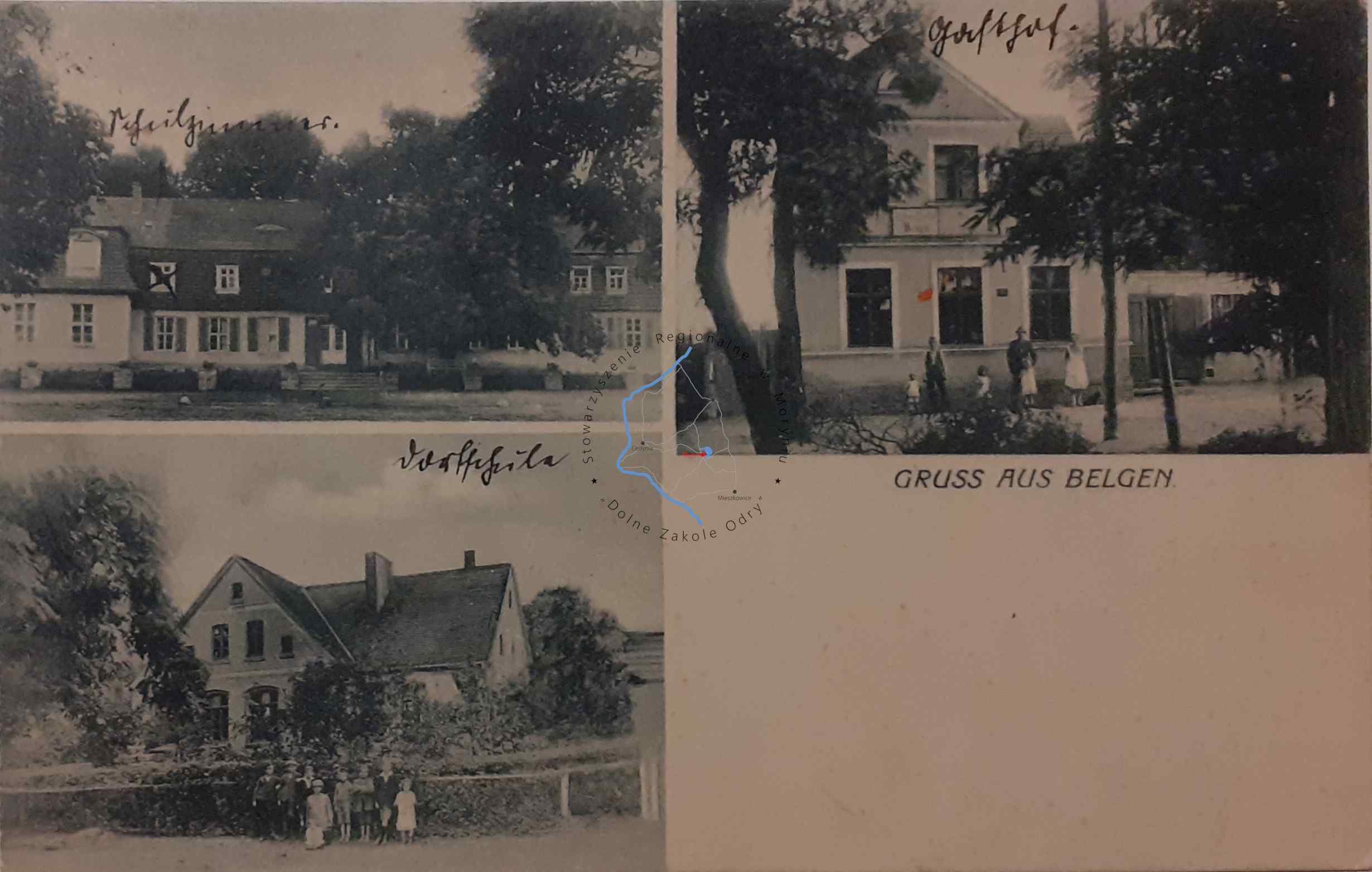 Pocztówka bez obieguWydawca: K. Kliem, Gollen N.-M. ( Jelenin ) BIAŁĘGI Dom gościnny Fritz Willing i Fragment wioski ...