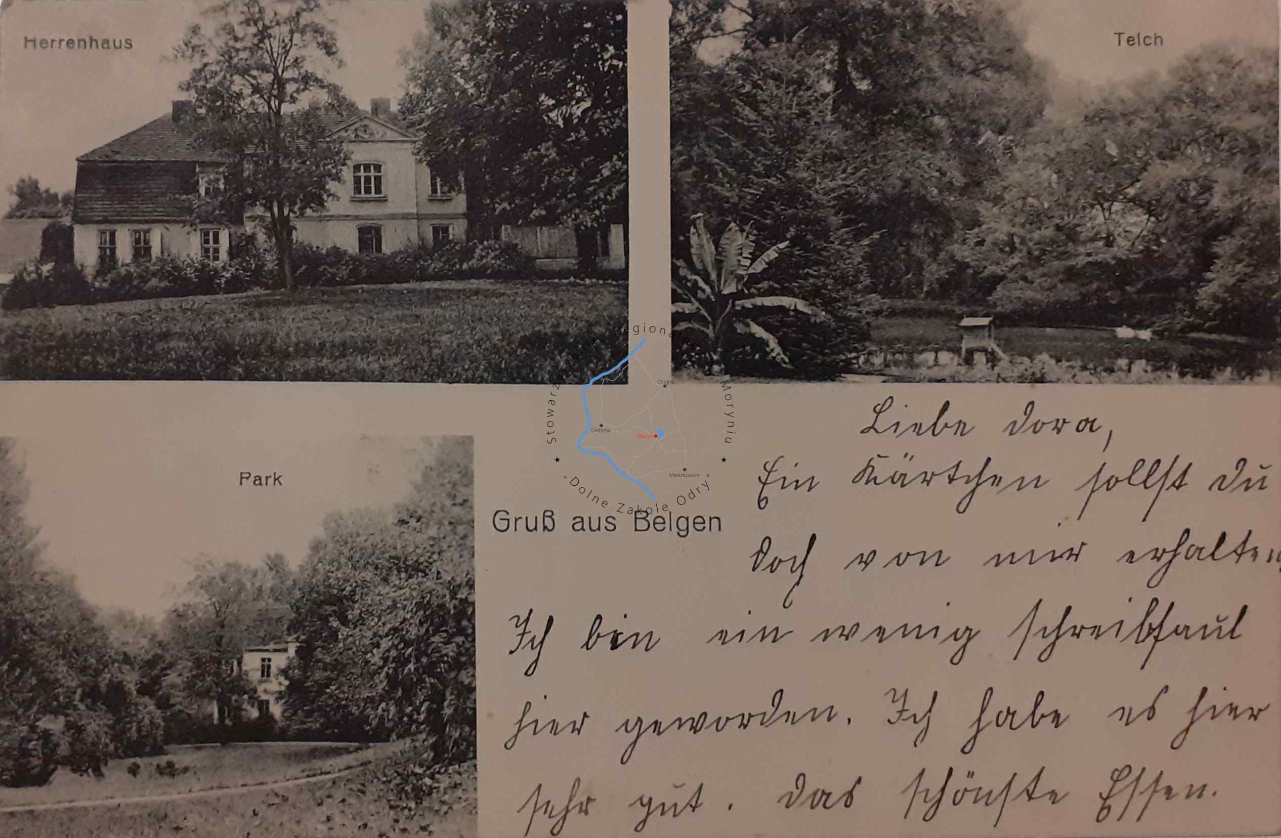 Pocztówka z obiegu, poczta Goszków 27. 7. 1917BIAŁĘGI Pocztówka wielowidokowa, - Dwór - Staw - Park ...