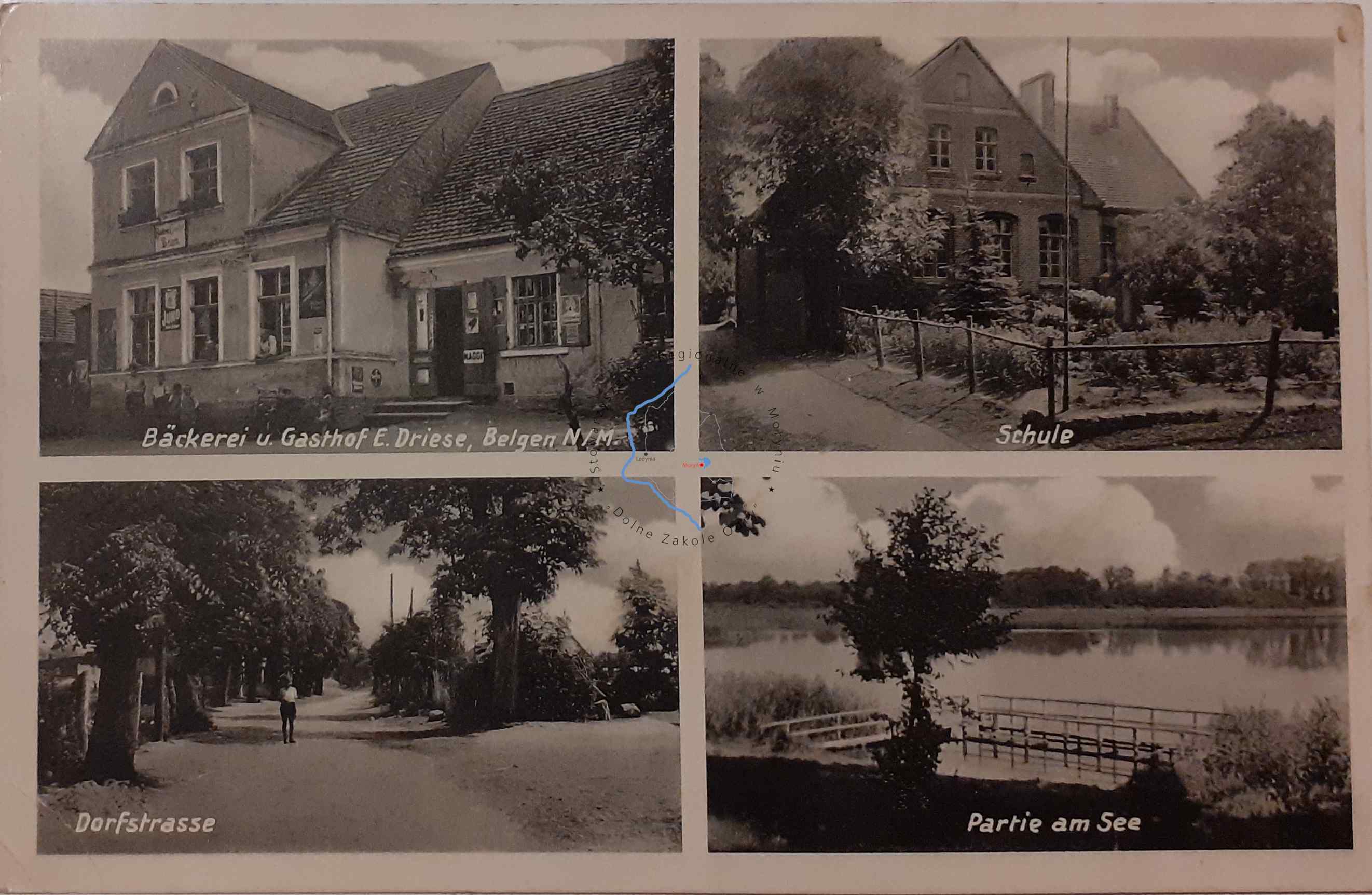 Pocztówka z obiegu, poczta Goszków Wydawca: H. Bensel, Landsberg Warthe ( Gorzów Wlkp. ) BIAŁĘGI Pocztówka wielowidokowa, - Piekarnia...