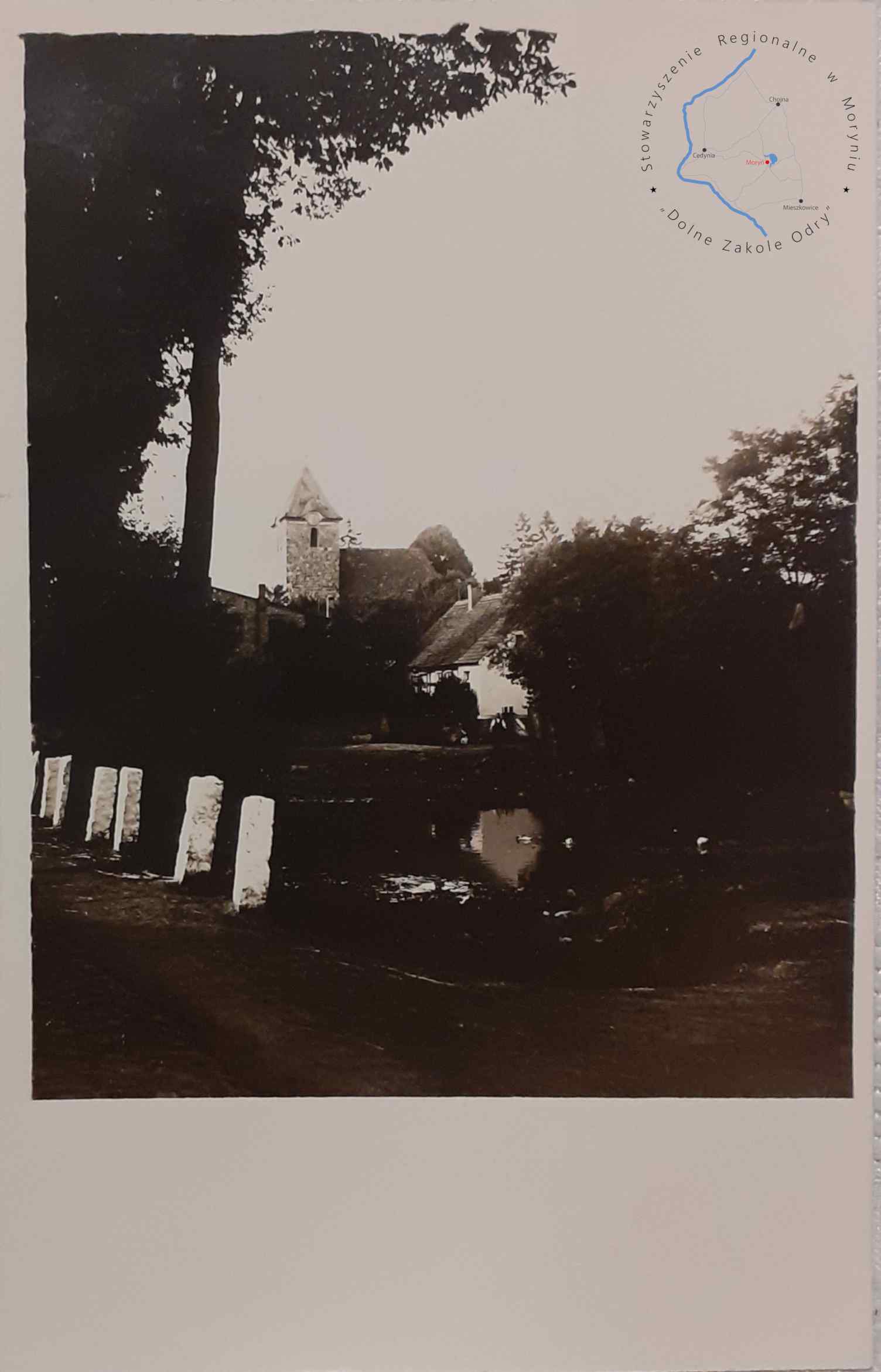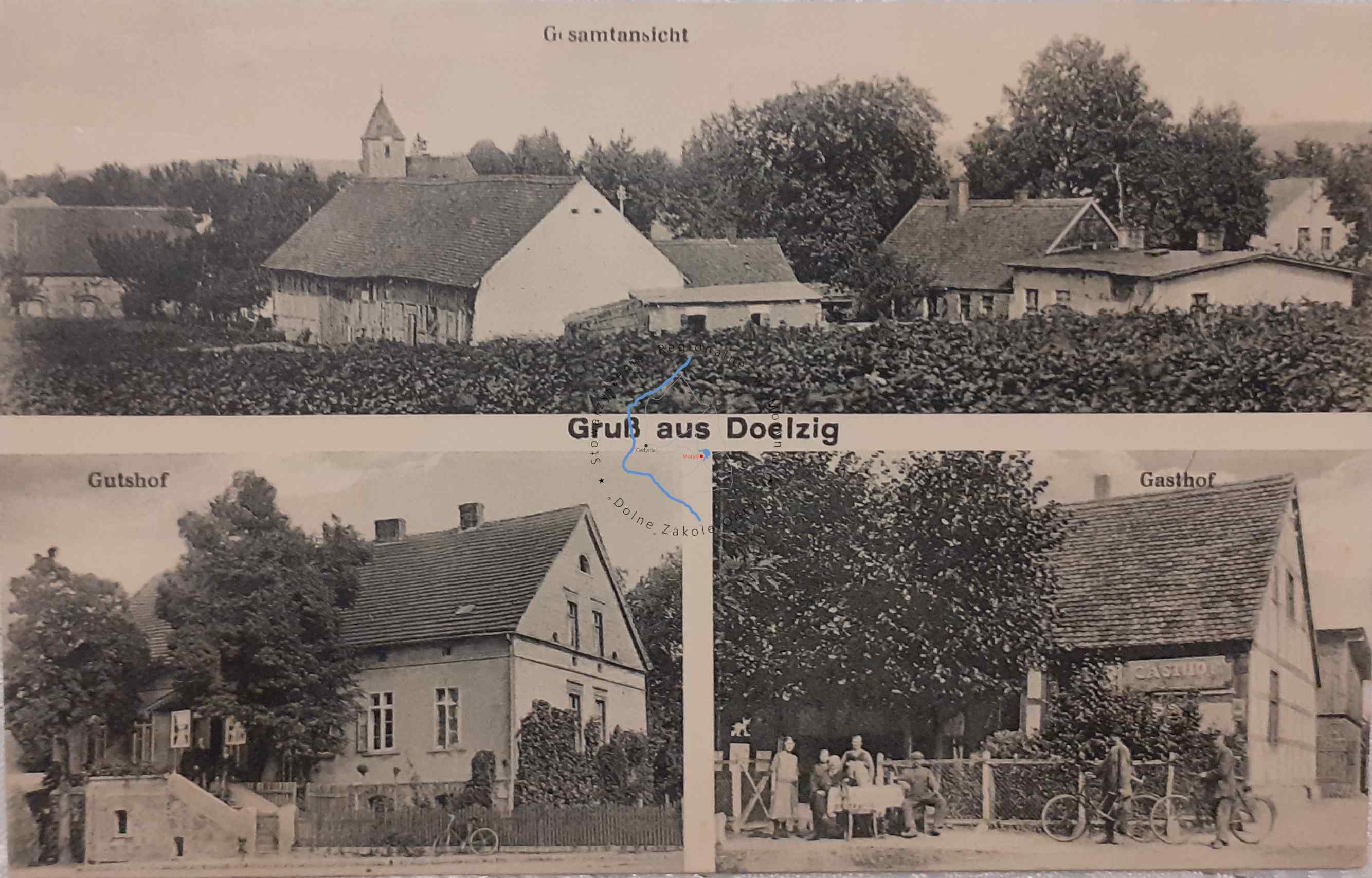 Pocztówka z obiegu, poczta Mętno 13. 9. 1938Wydawca: M. Koock, Fotograf, Mohrin, N.-M. (Moryń)DOLSKO Pocztówka wielowidokowa, Widok na staw wiejski i ...
