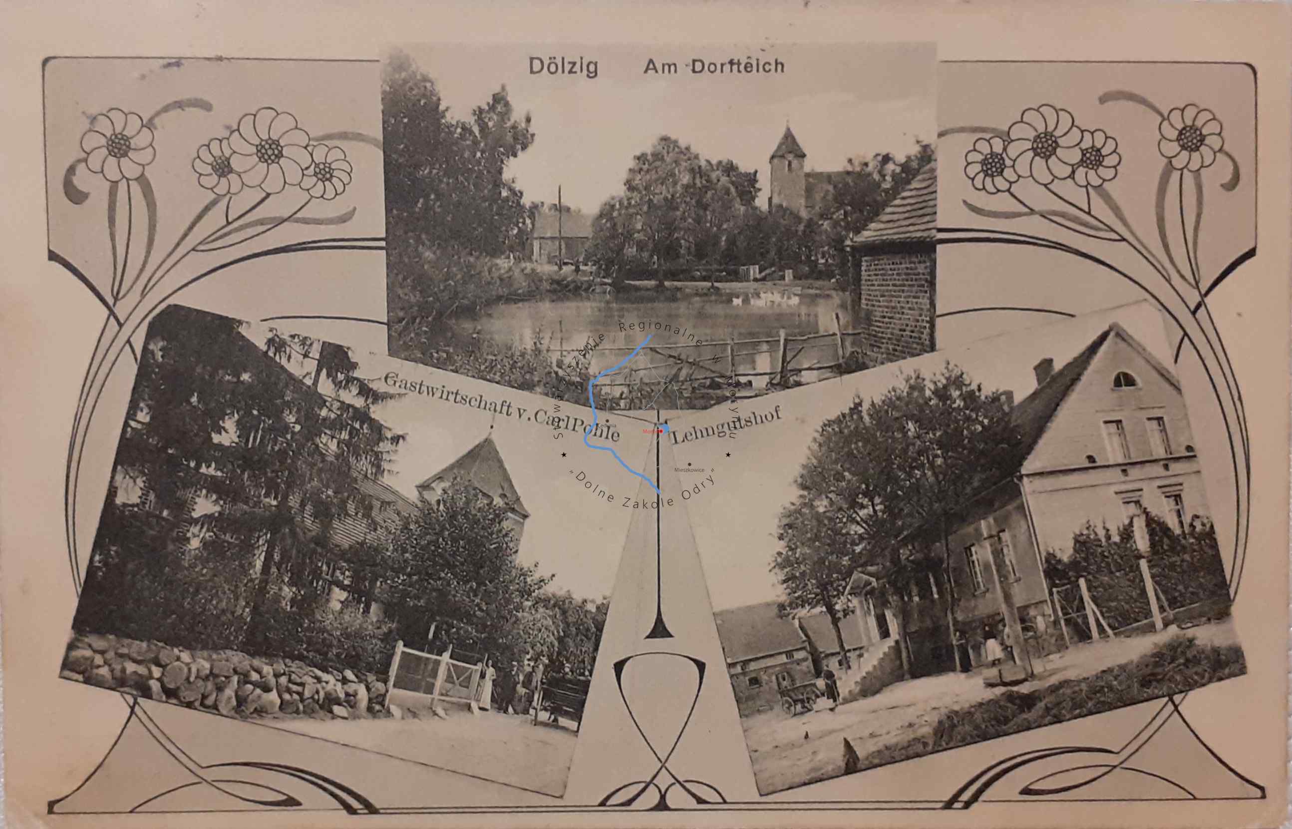 Pocztówka z obiegu, poczta Mętno 21. 6. 1913DOLSKO Pocztówka wielowidokowa, - Staw wiejski - Gospoda Carl Pohle - Dwór ...