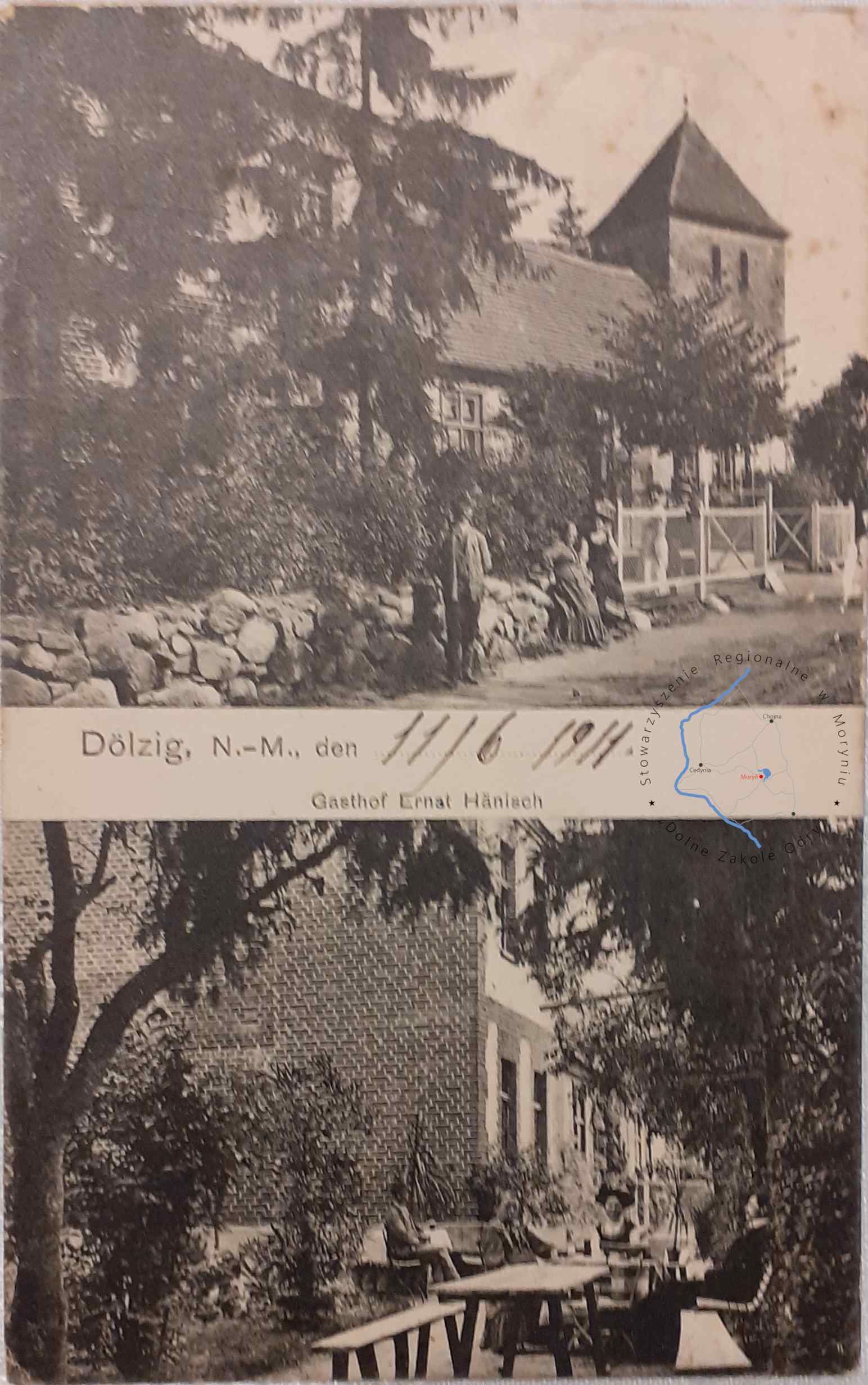 Pocztówka z obiegu, poczta Mętno 11. 6. 1911DOLSKO Kościół i Dom gościnny Ernst Hanisch...