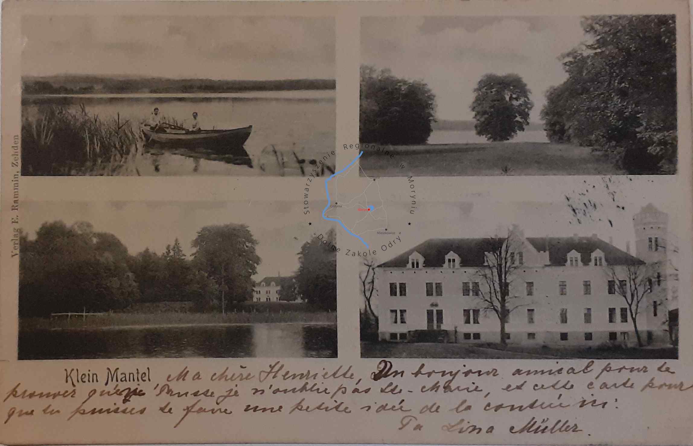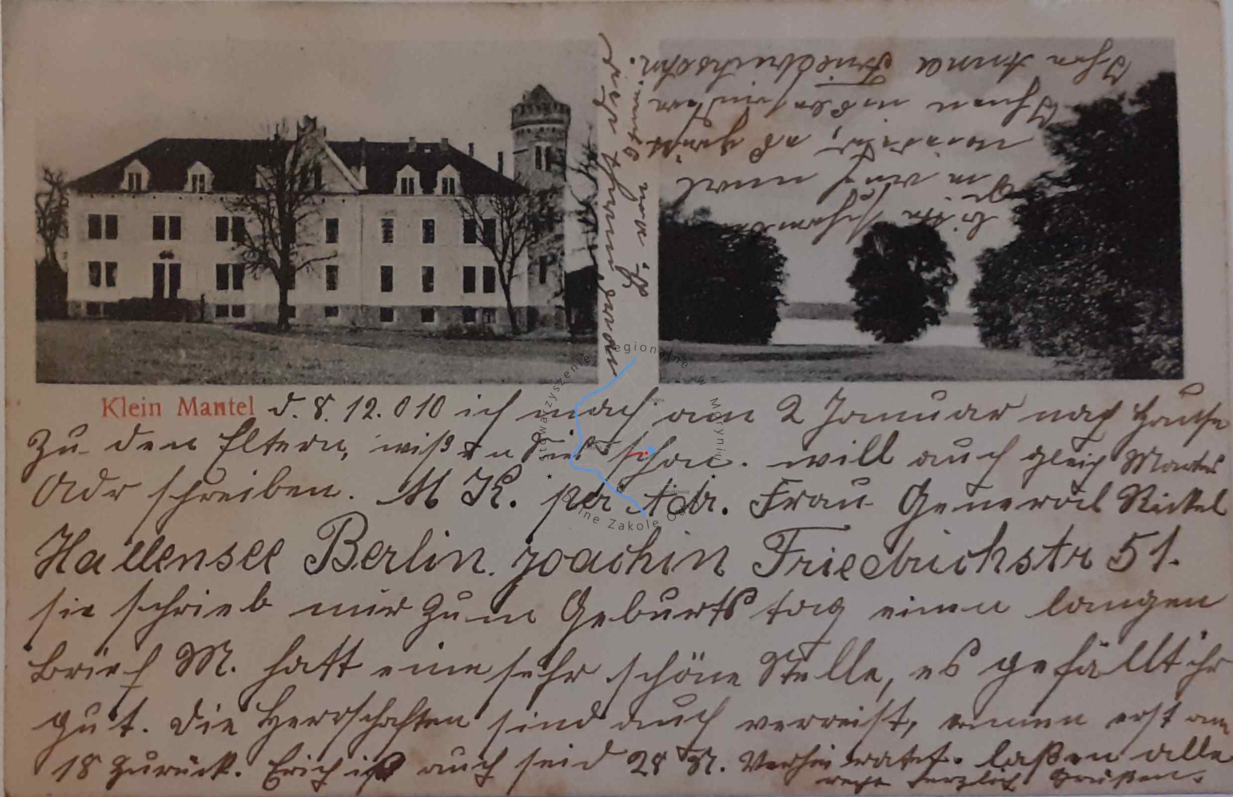 Pocztówka z obiegu, poczta Chojna 9. 12. 1910Wydawca: E. Rammin Photogr. Zehden, Oder ( Cedynia )MĘTNO MAŁE Pałac i widok na jezioro Mętno...