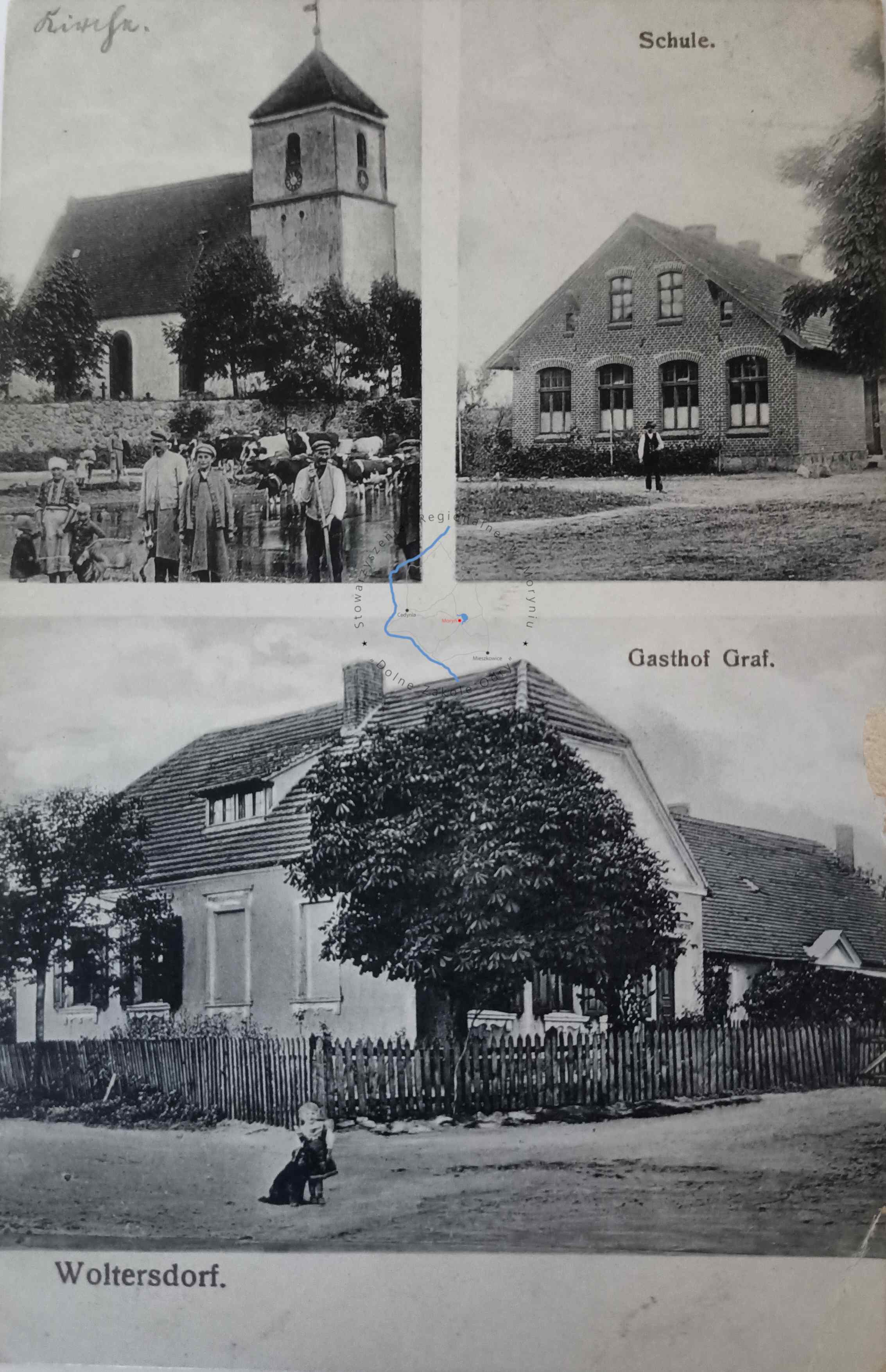 Pocztówka z obiegu, poczta Godków 17. 6. 1917Wydawca: E. Stanz, Rorchen ( Rurka )MIROWO Pocztówka wielowidokowa - Kościół / Szkoła / Dom g...