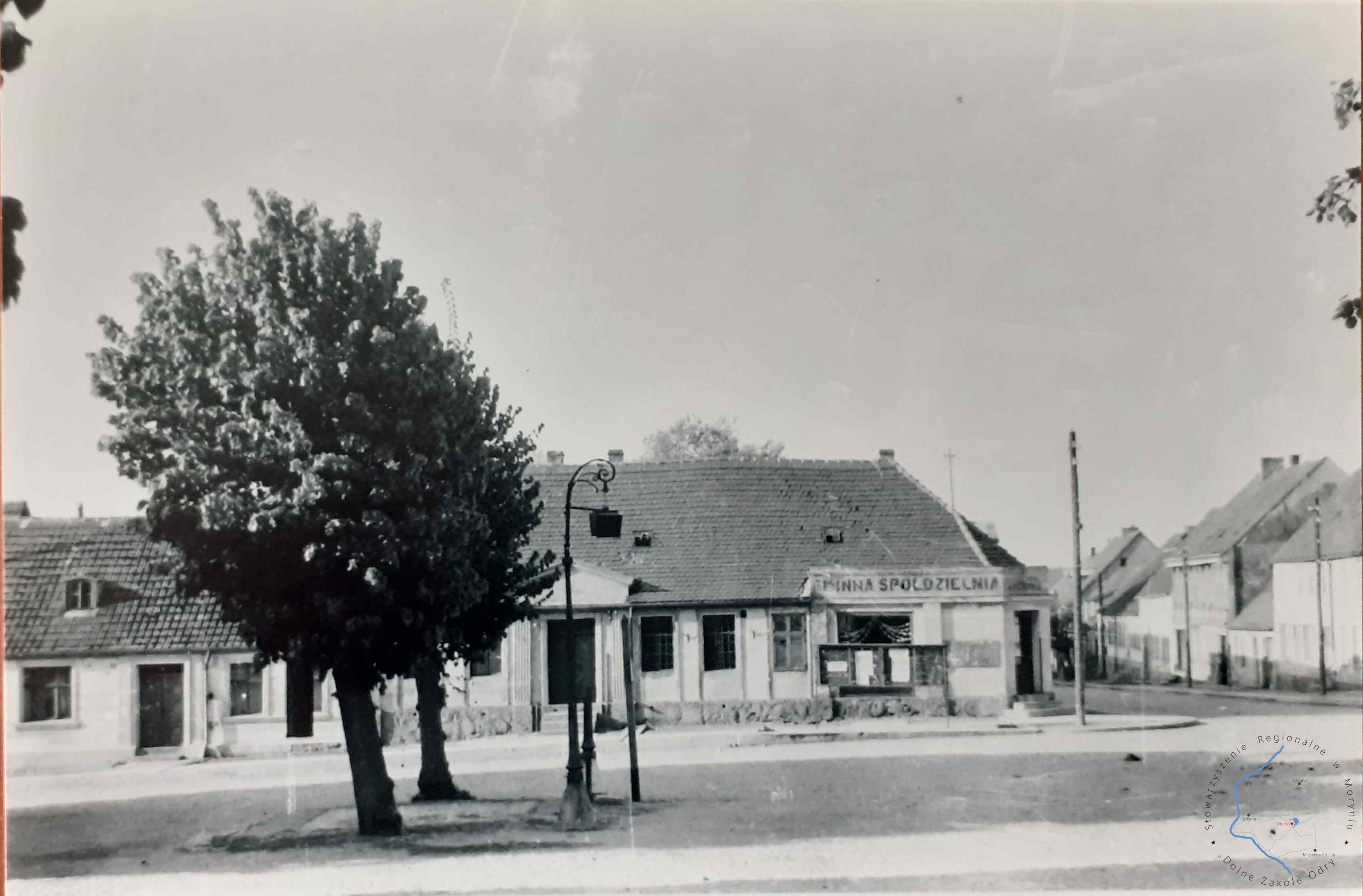 Zdjęcie z 1951 - 1954 roku, na zdjęciu fragment rynku w Moryniu z Gminną Spółdzielnią....