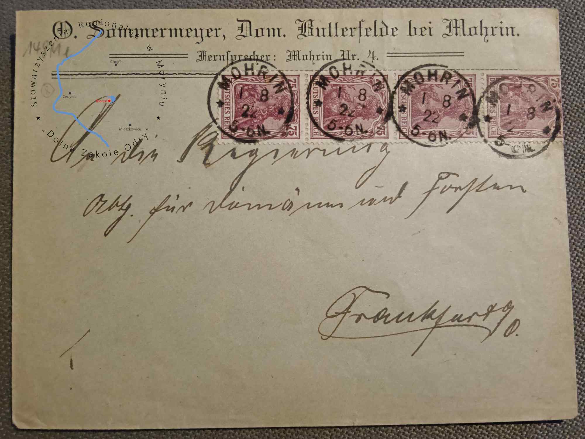 Koperta reklamowe i pieczątka na kopercie, zarządcy majątku domenialnego w Przyjezierzu Sommermeyer.Koperta z obiegu, poczta Moryń 01. 08. 1922...