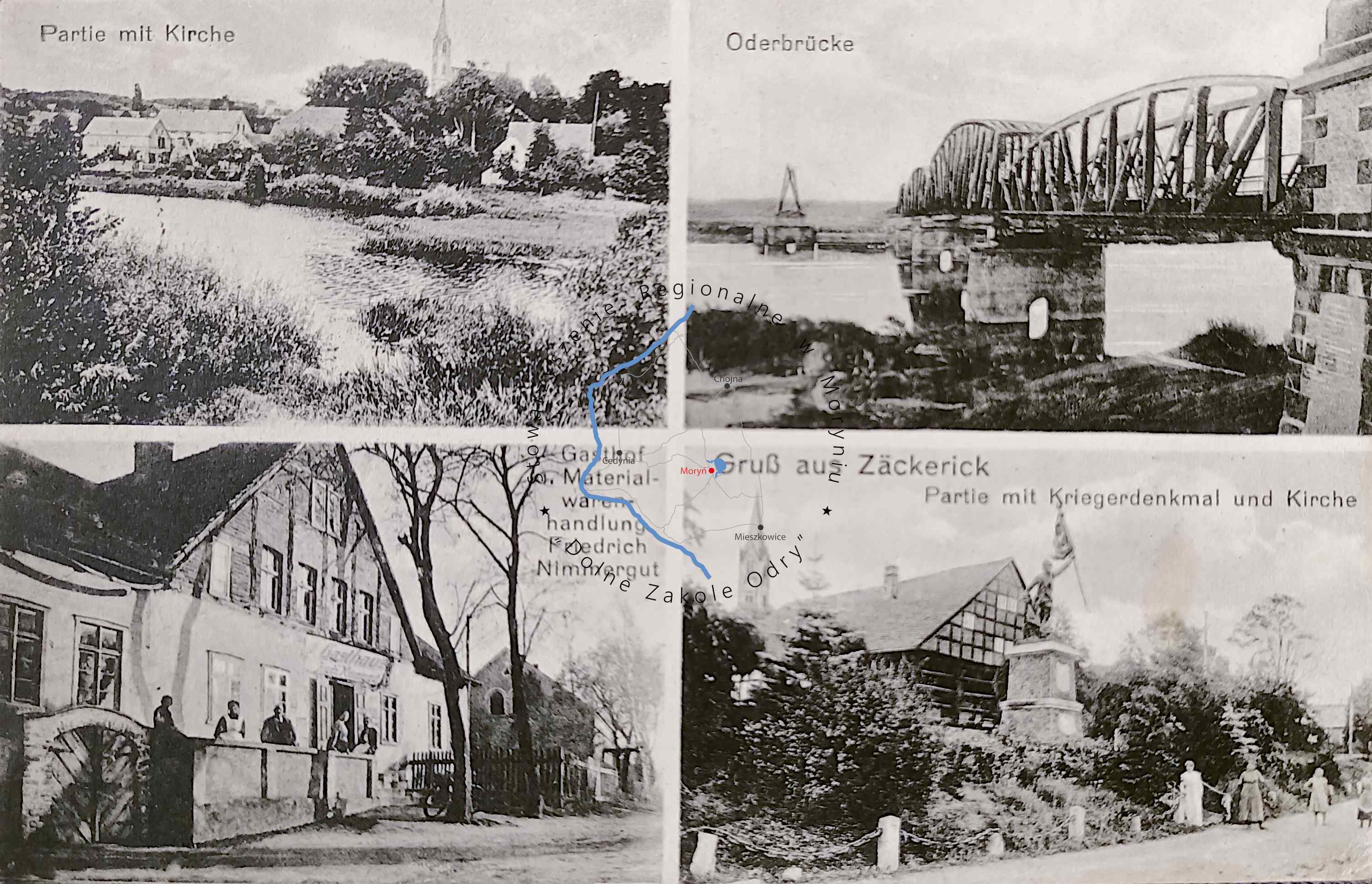 Pocztówka z obiegu, poczta Siekierki Wydawca: Max Zibell, Berlin, Danzigerstr. 93SIEKIERKI Pocztówka wielowidokowa - widok panoramiczny - Most - ...