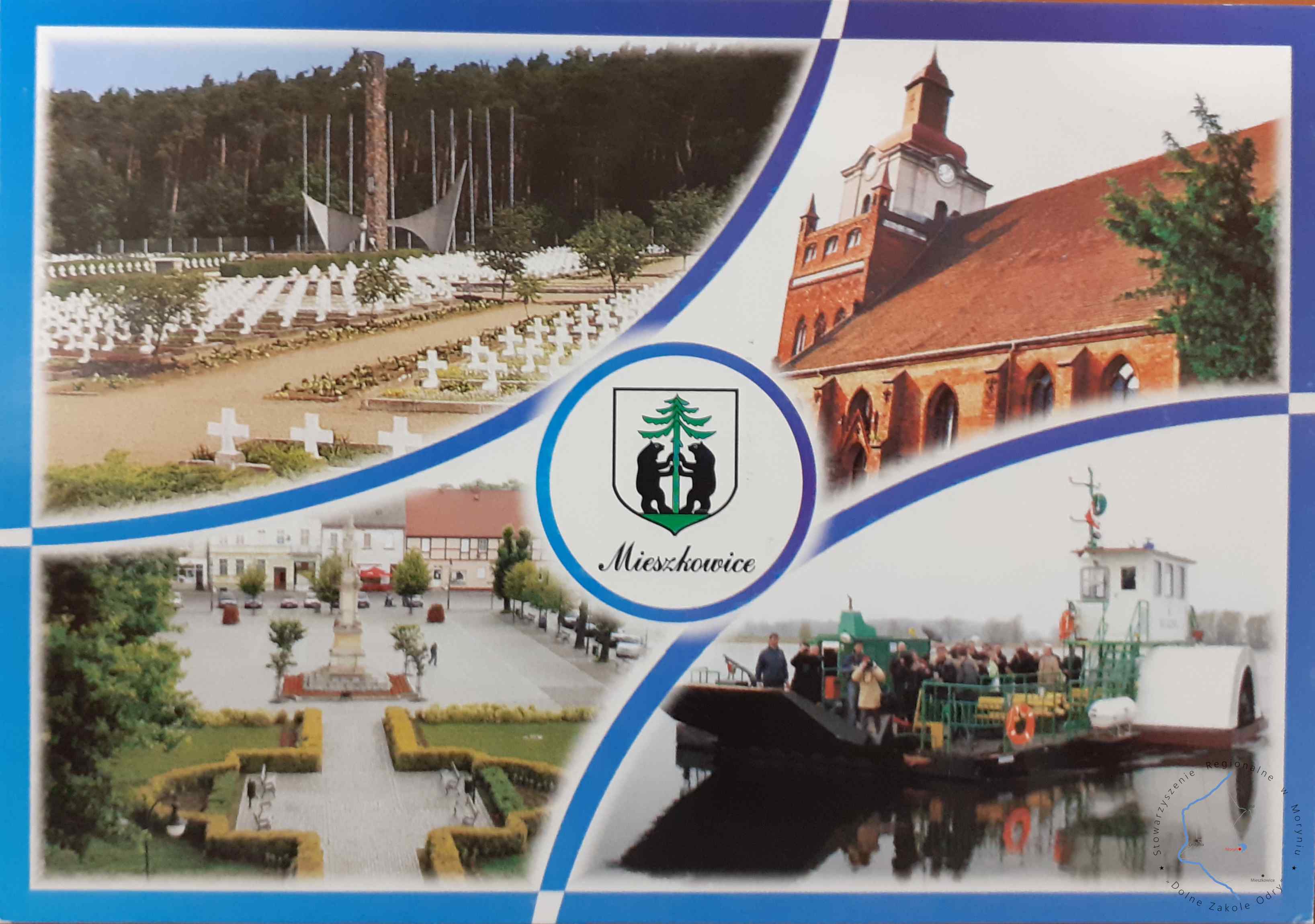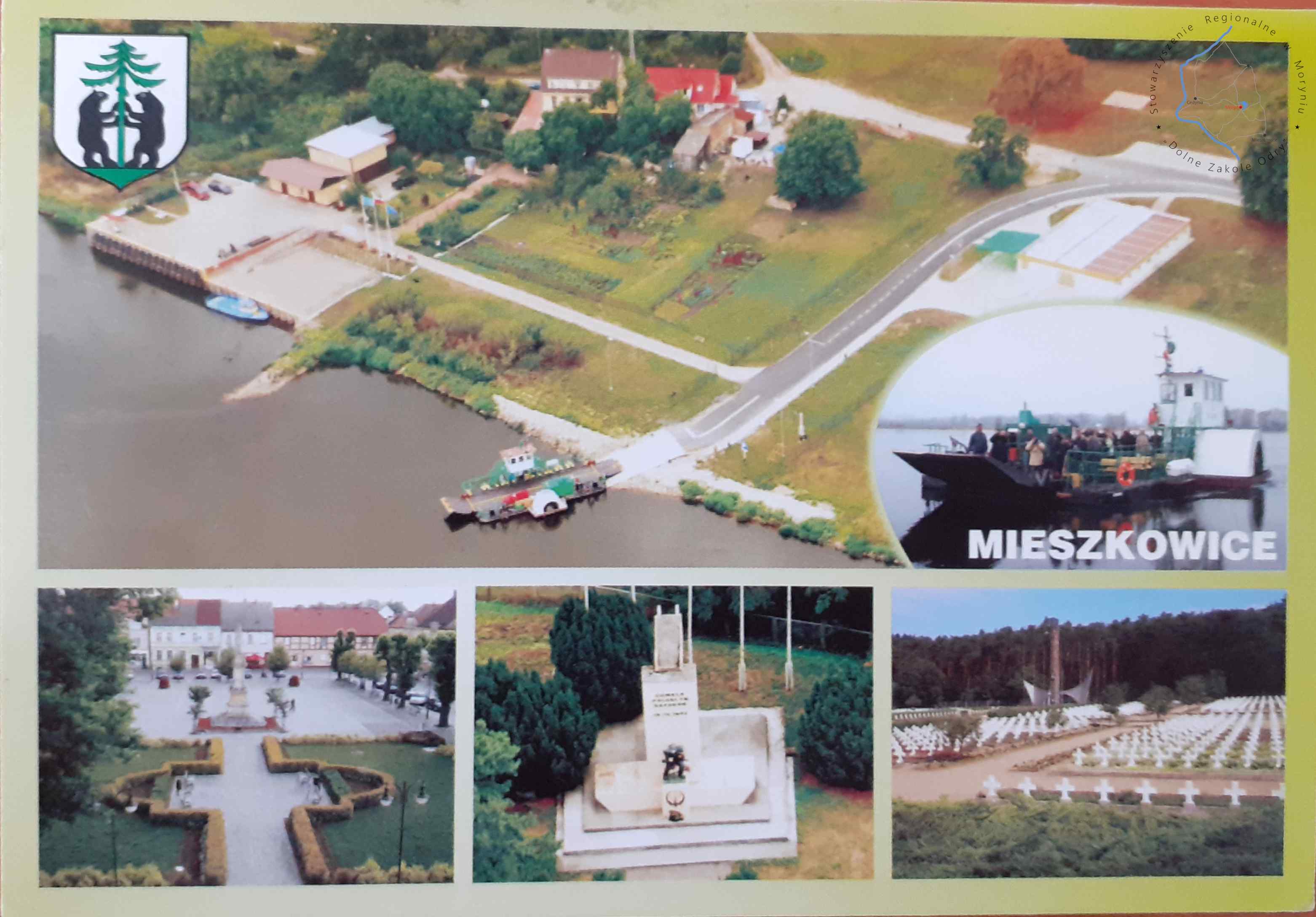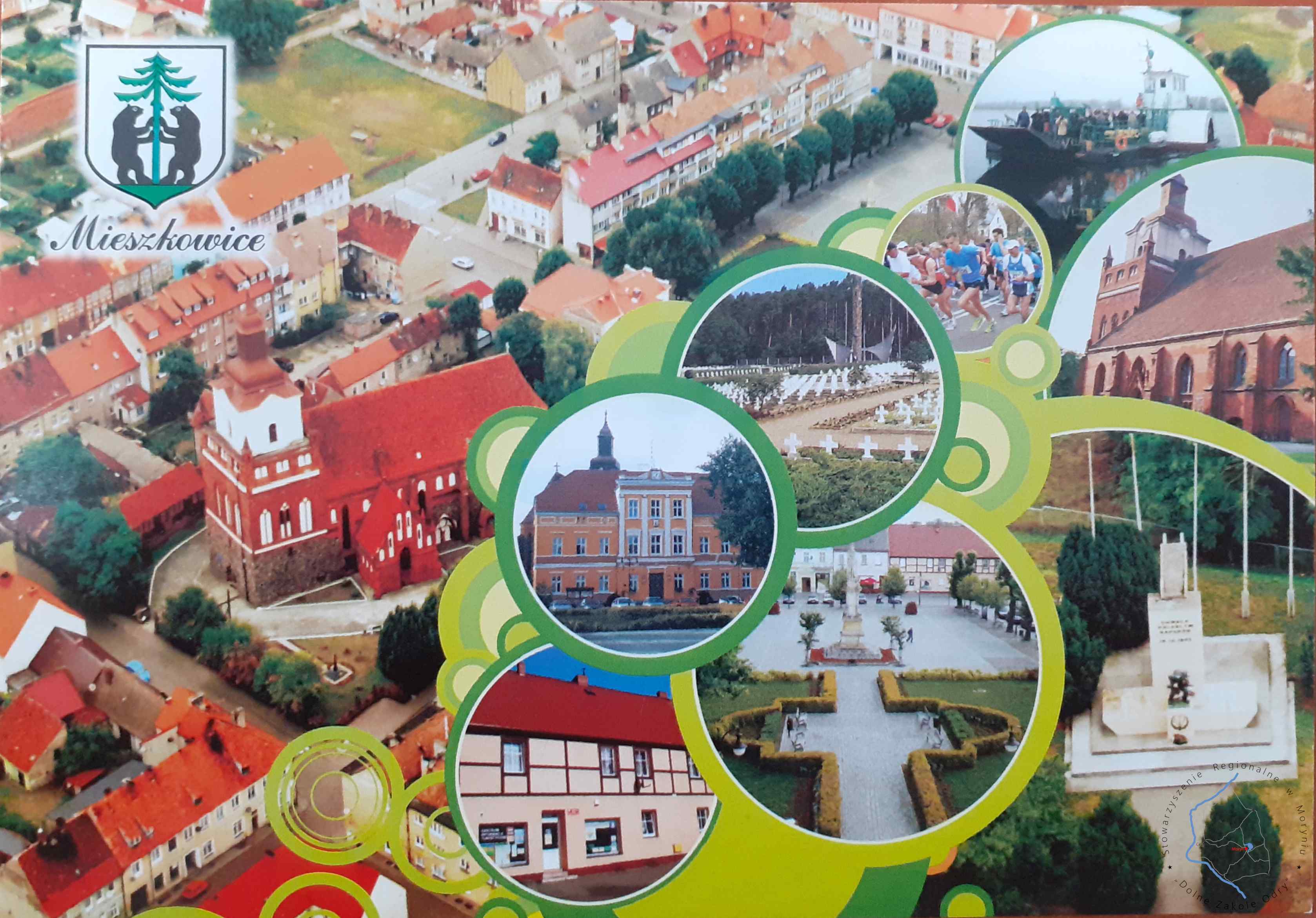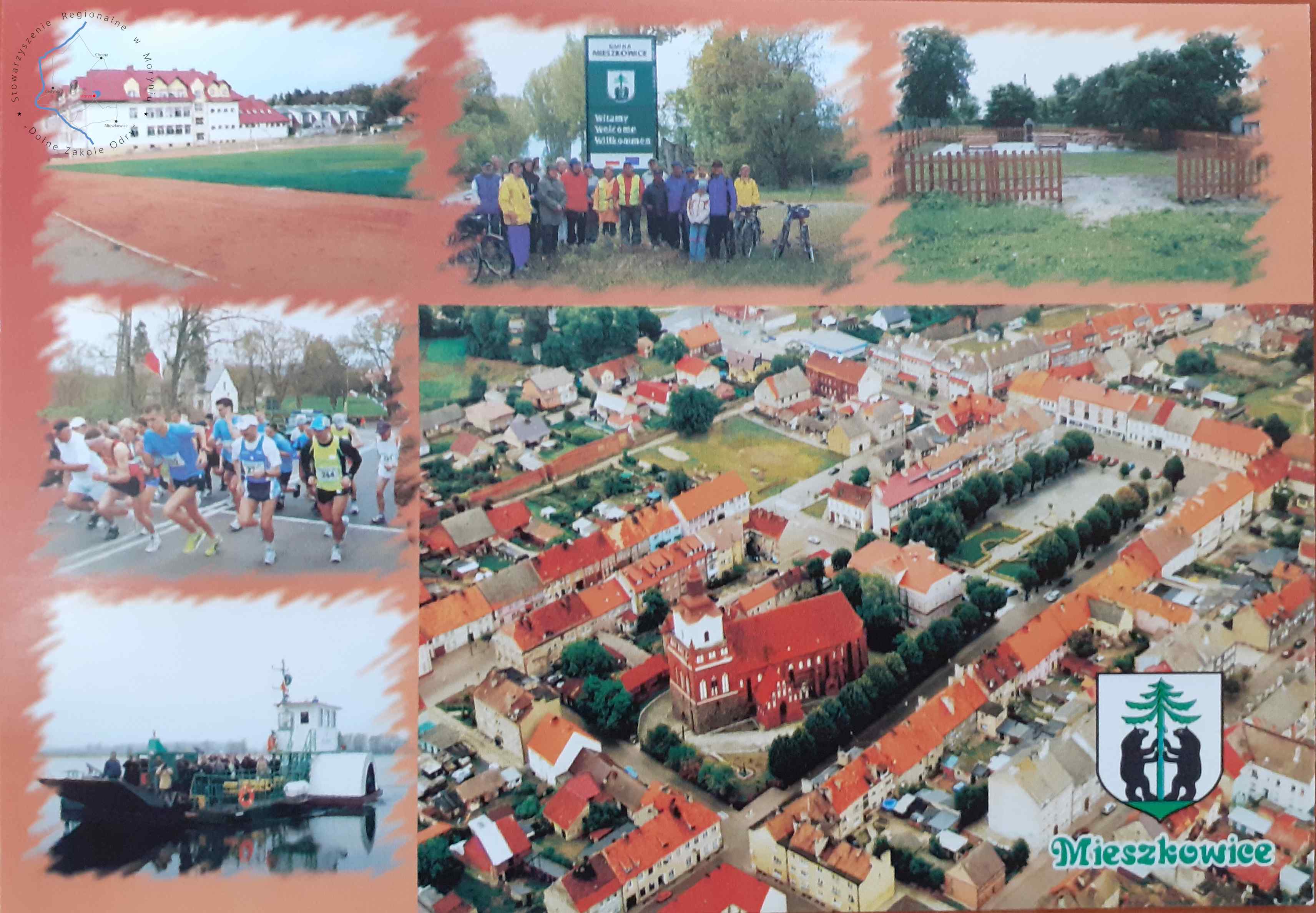 Pocztówka wielowidokowaGmina MieszkowicePocztówka bez obieguGmina Mieszkowice Mieszkowice z lotu ptaka Prom “Bez granic”Bieg “Mieszkowicka N...