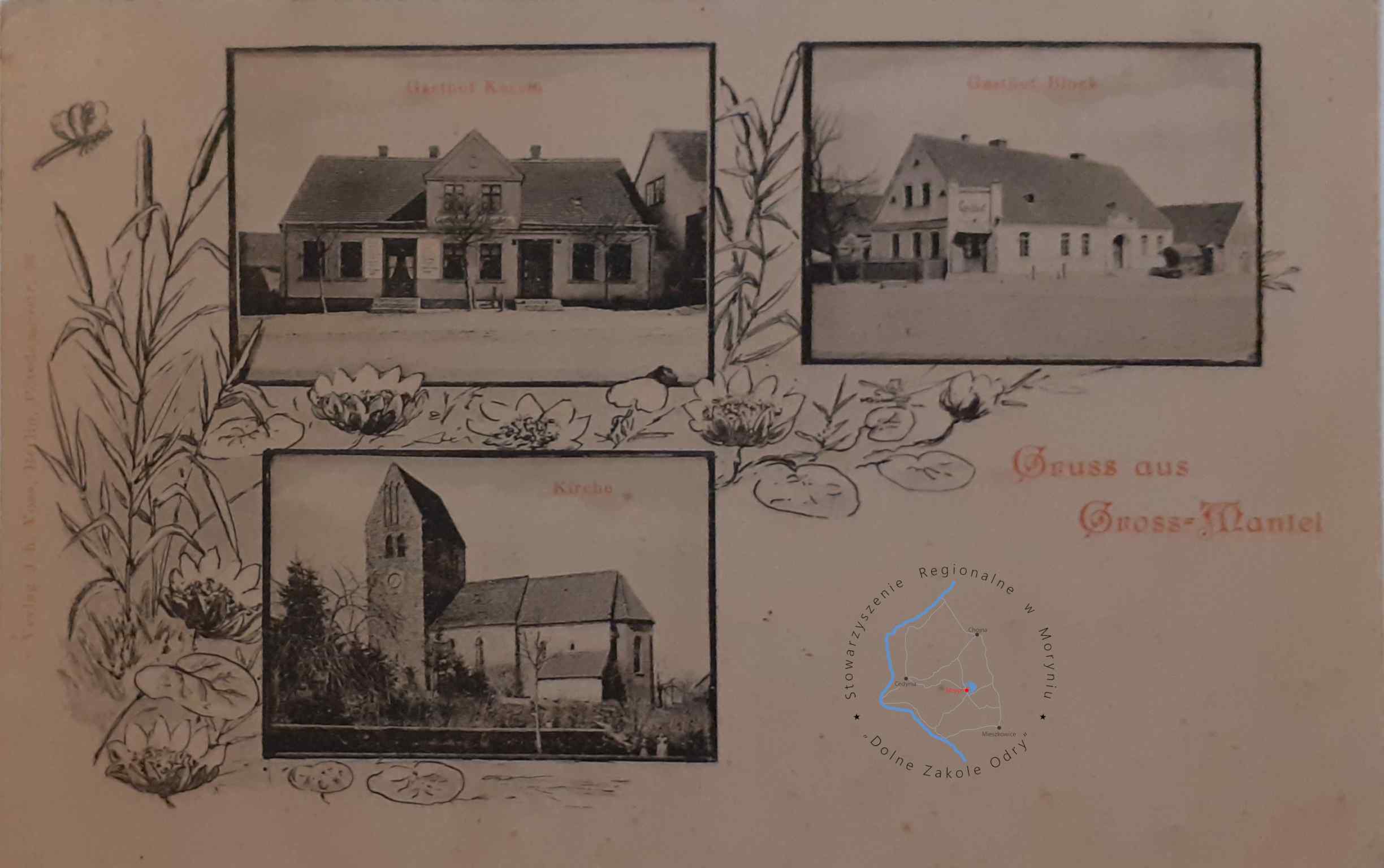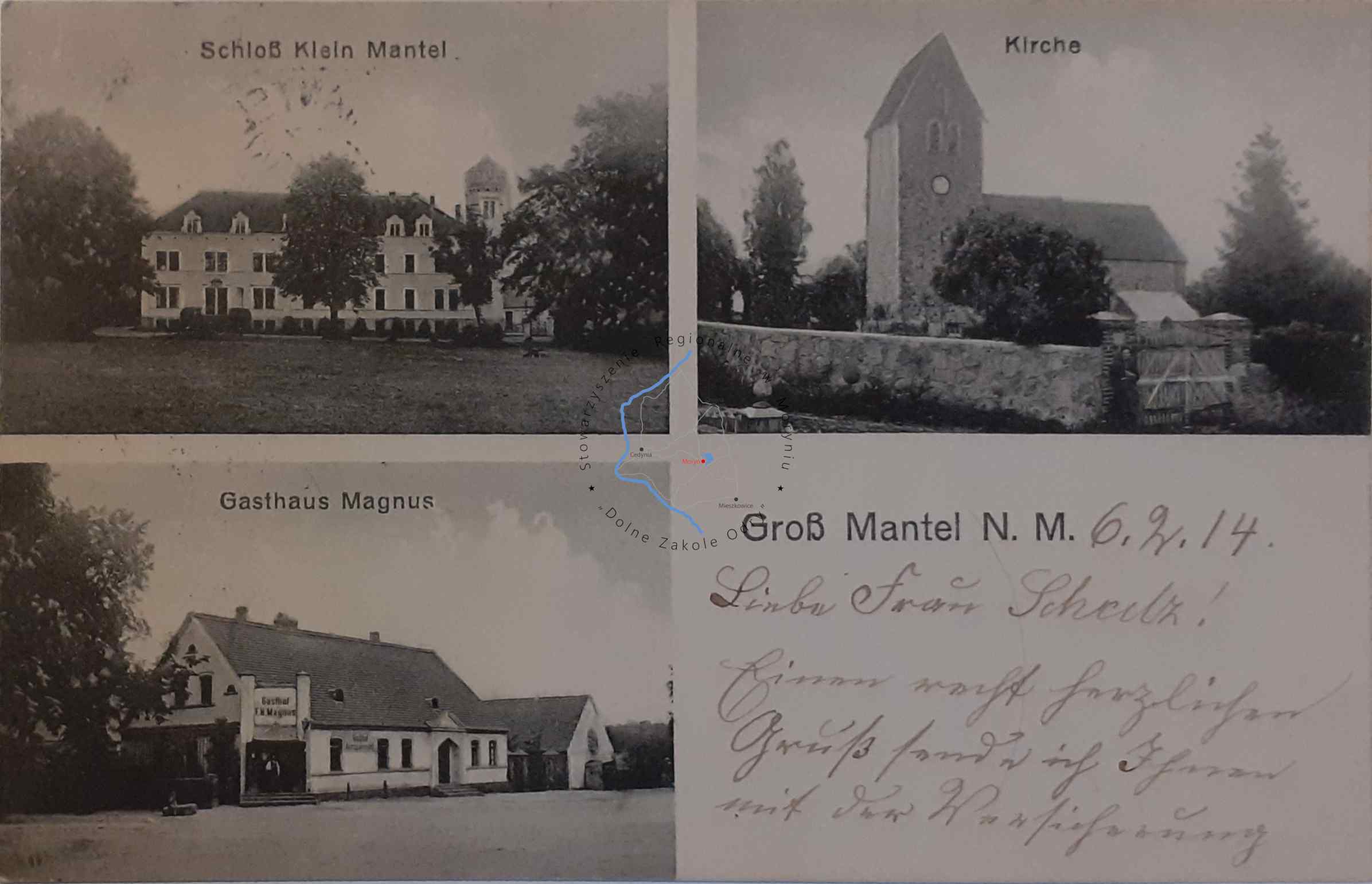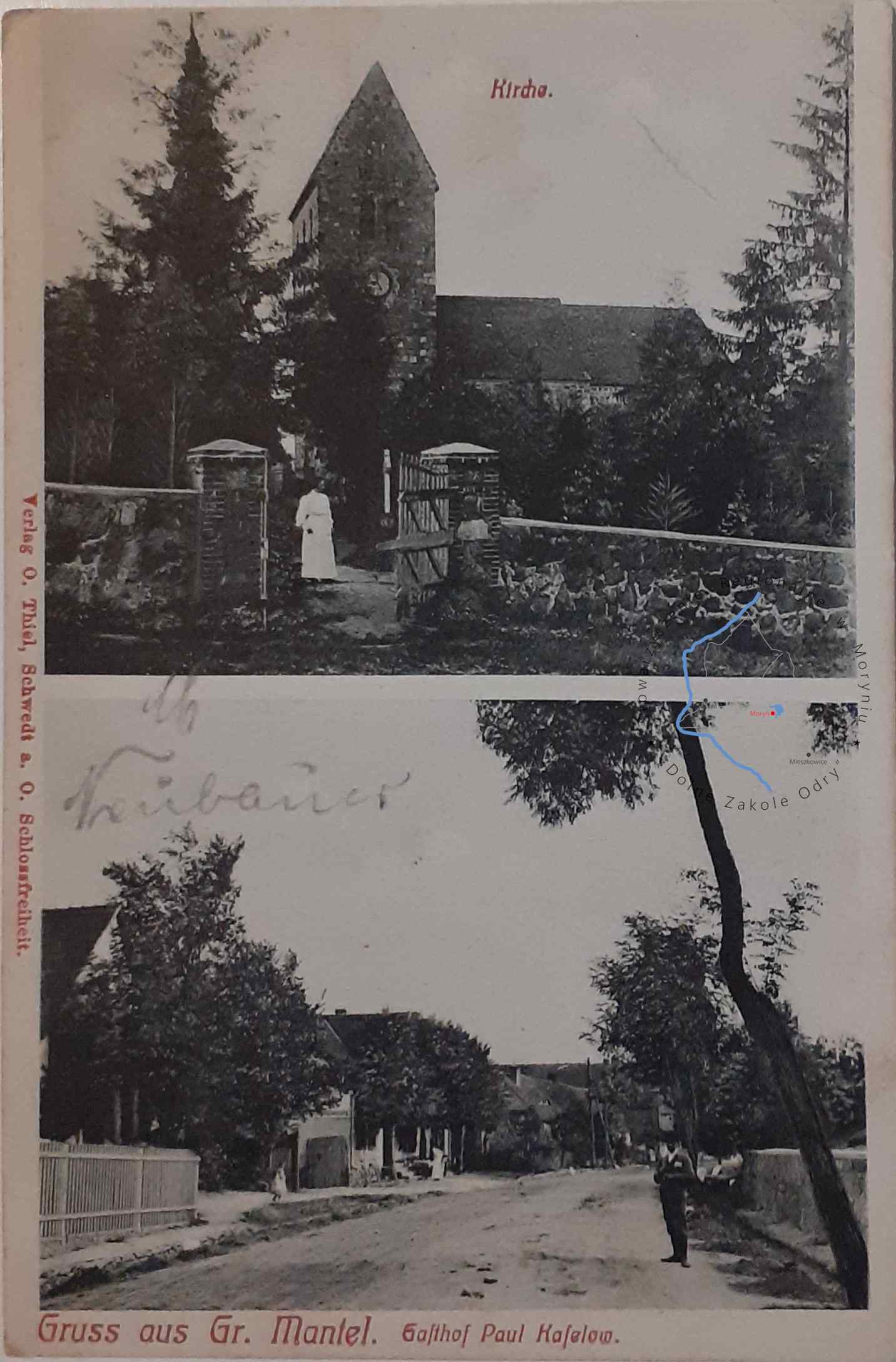 Pocztówka z obiegu 7. 9. 1910 Wydawca: O. Thiel, Schwedt a. O. SchlossfreiheitMĘTNO Kościół i fragment wioski...