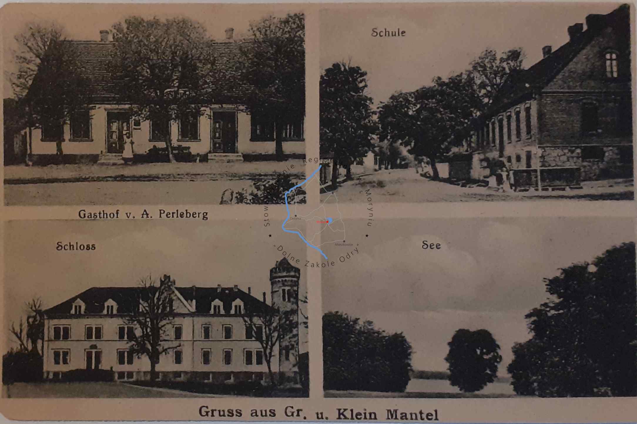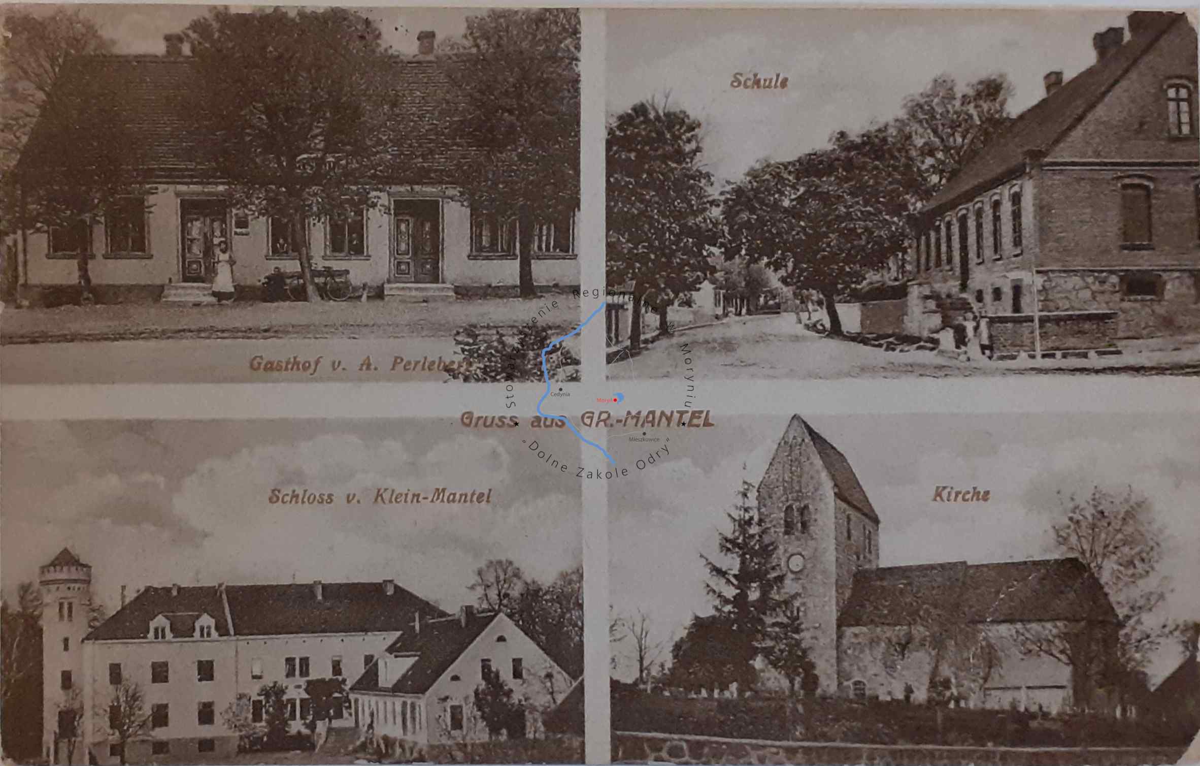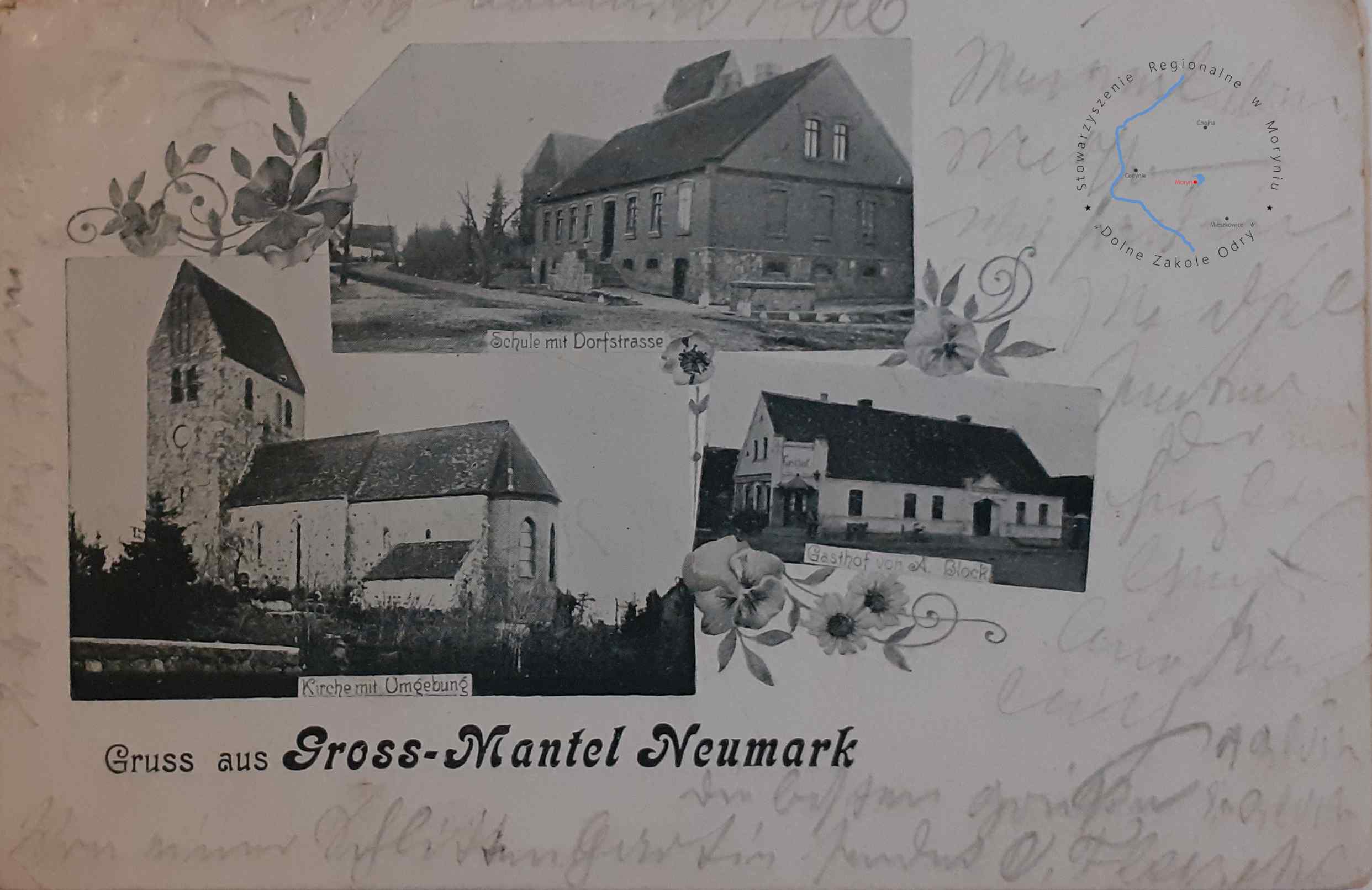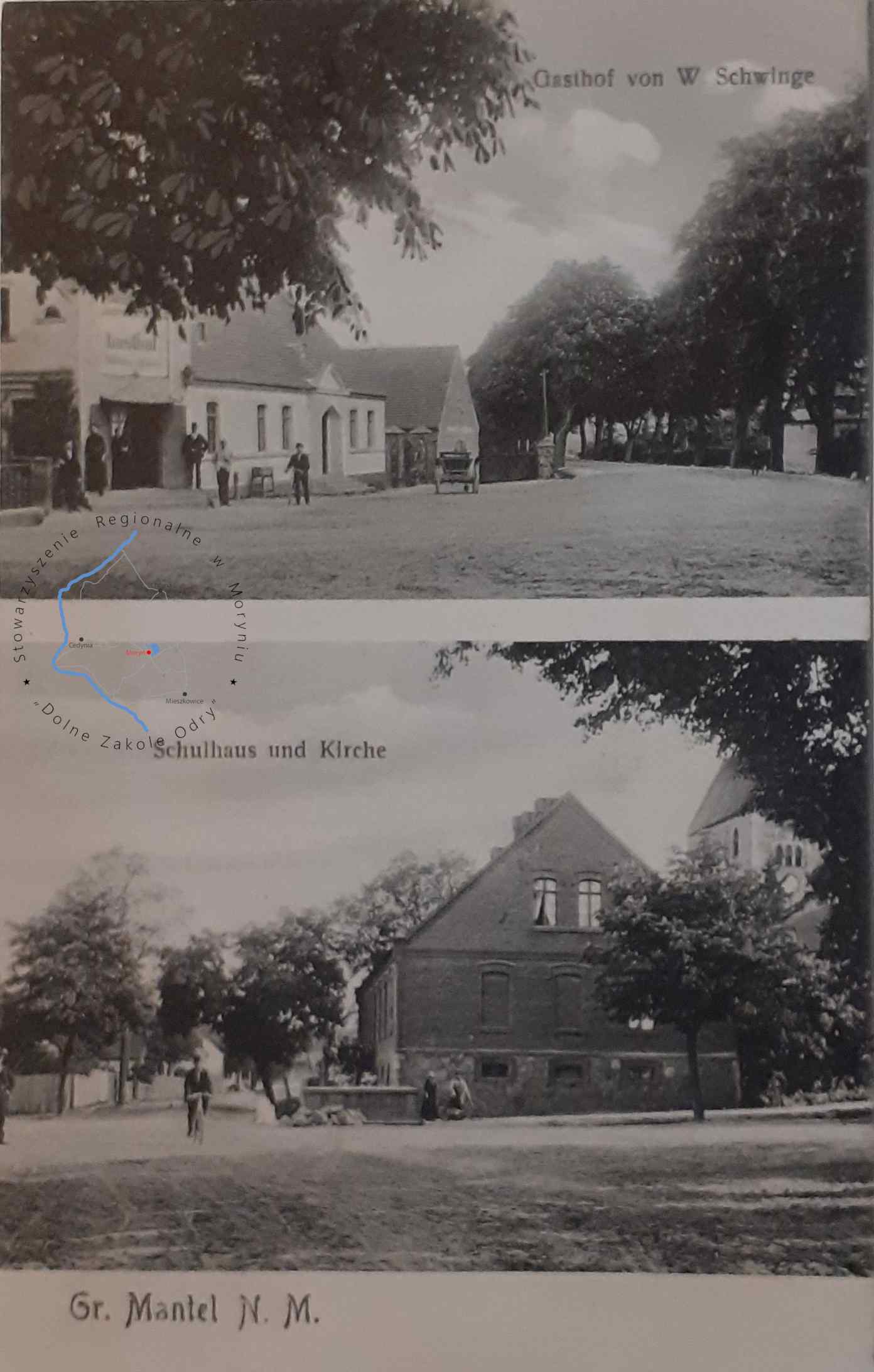 Pocztówka z obiegu 7. 9. 1910 Wydawca: O. Thiel, Schwedt a. O. SchlossfreiheitMĘTNO Kościół i fragment wioski...