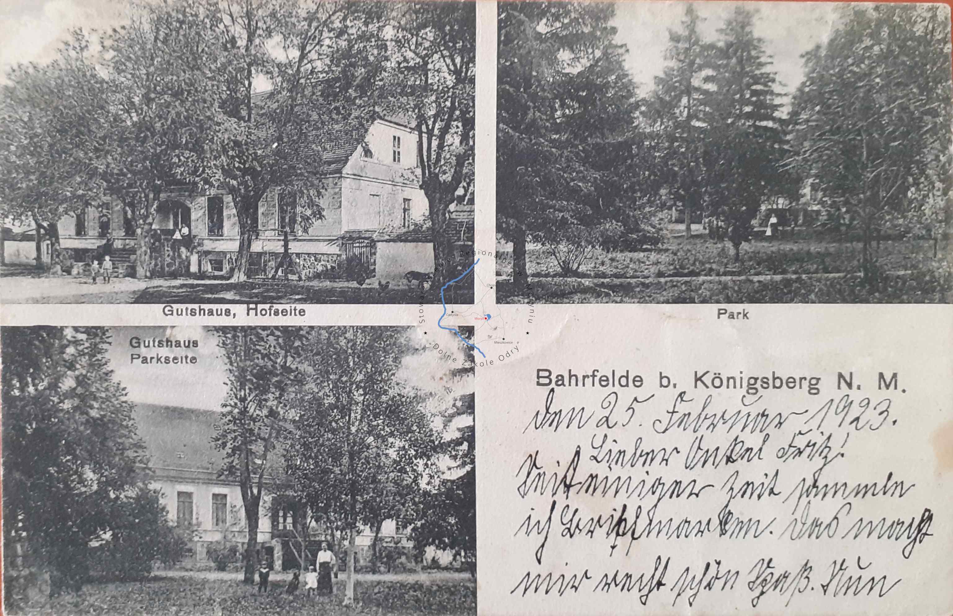 Pocztówka z obiegu, poczta Chojna 25. 2. 1923BARA Pocztówka wielowidokowa, - Dom gościnny od podwórza - Park - Dom ...
