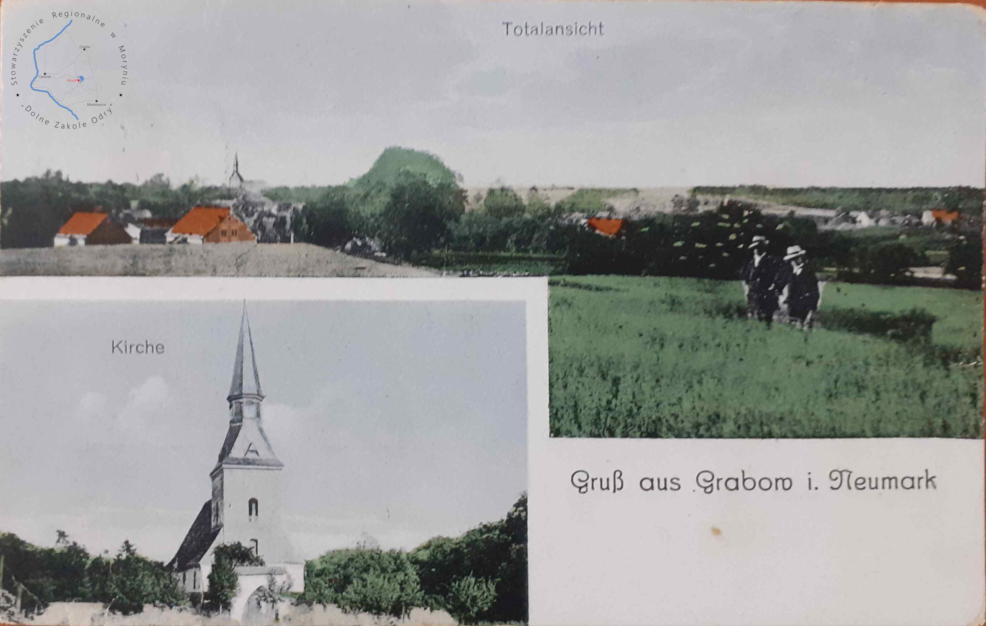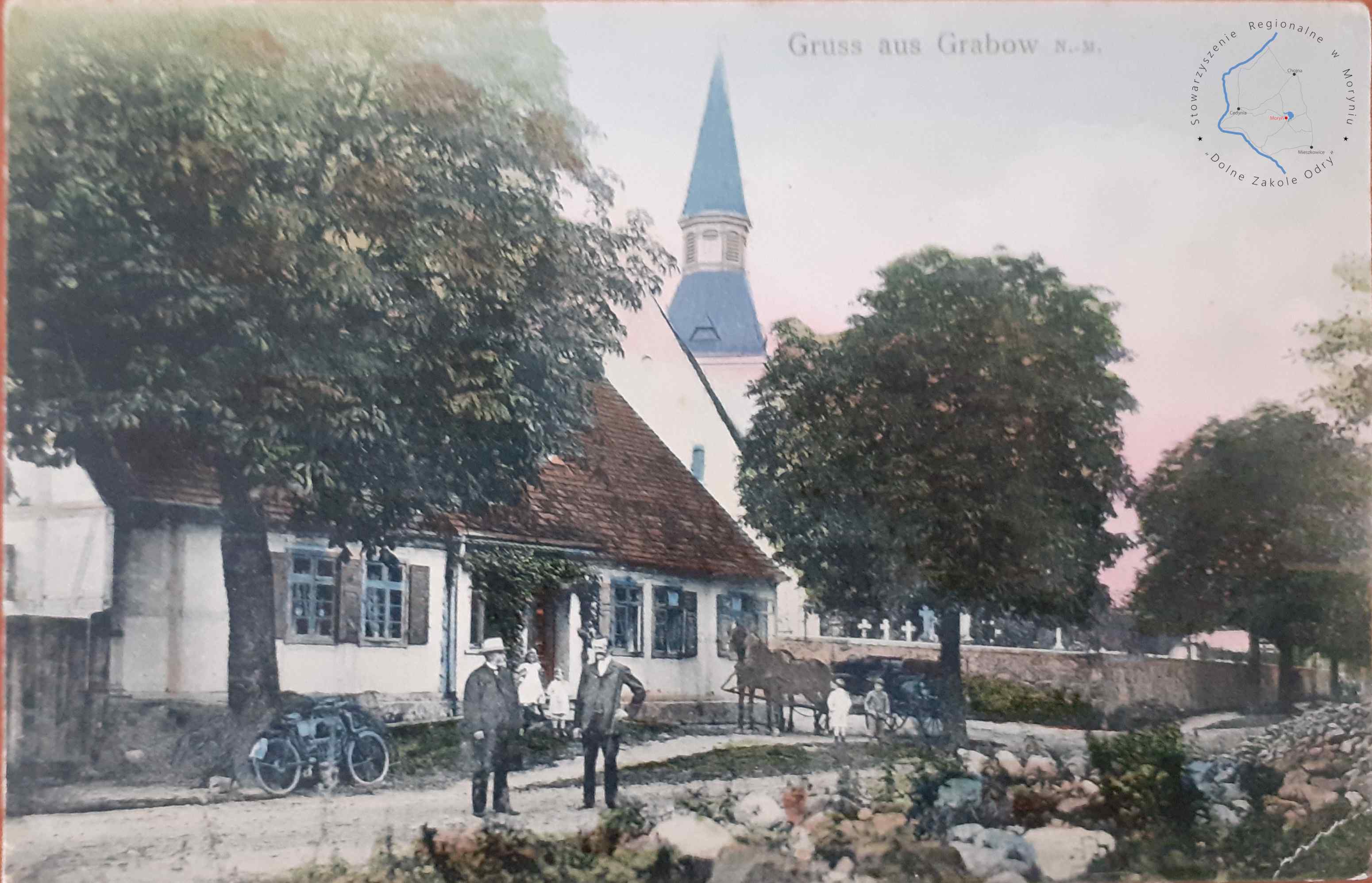 Pocztówka bez obieguWydawca: Alfred Schwintzer, Schwedt a. O.GRABOWO Fragment wioski z kościołem i cmentarzem