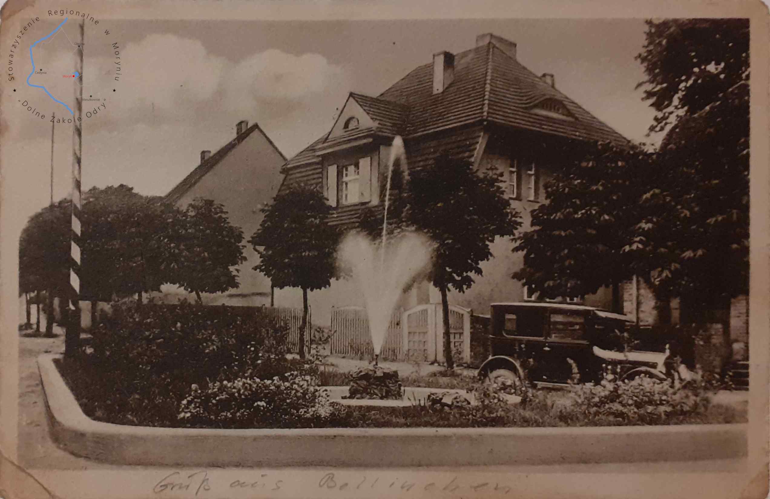 Pocztówka z obiegu, poczta Bielinek Wydawca: M. Koock, Fotograf, Mohrin, N. -M. ( Moryń )BIELINEK Fontanna