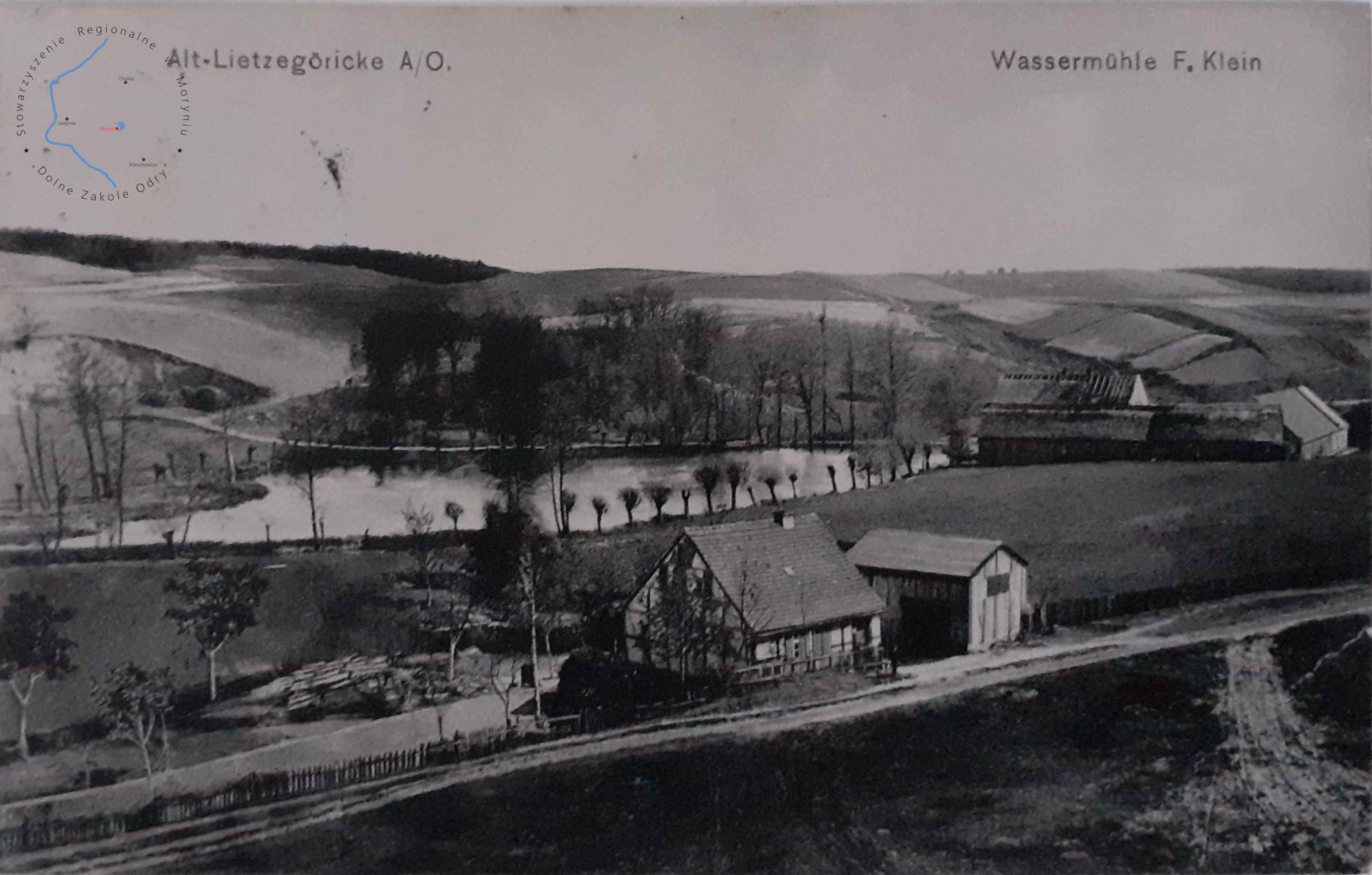 Pocztówka z obiegu, poczta Stare Łysogórki 4. 10. 1915Wydawca: K. Kliem, Alt-GlietzenSTARE ŁYSOGÓRKI Młyn wodny F...