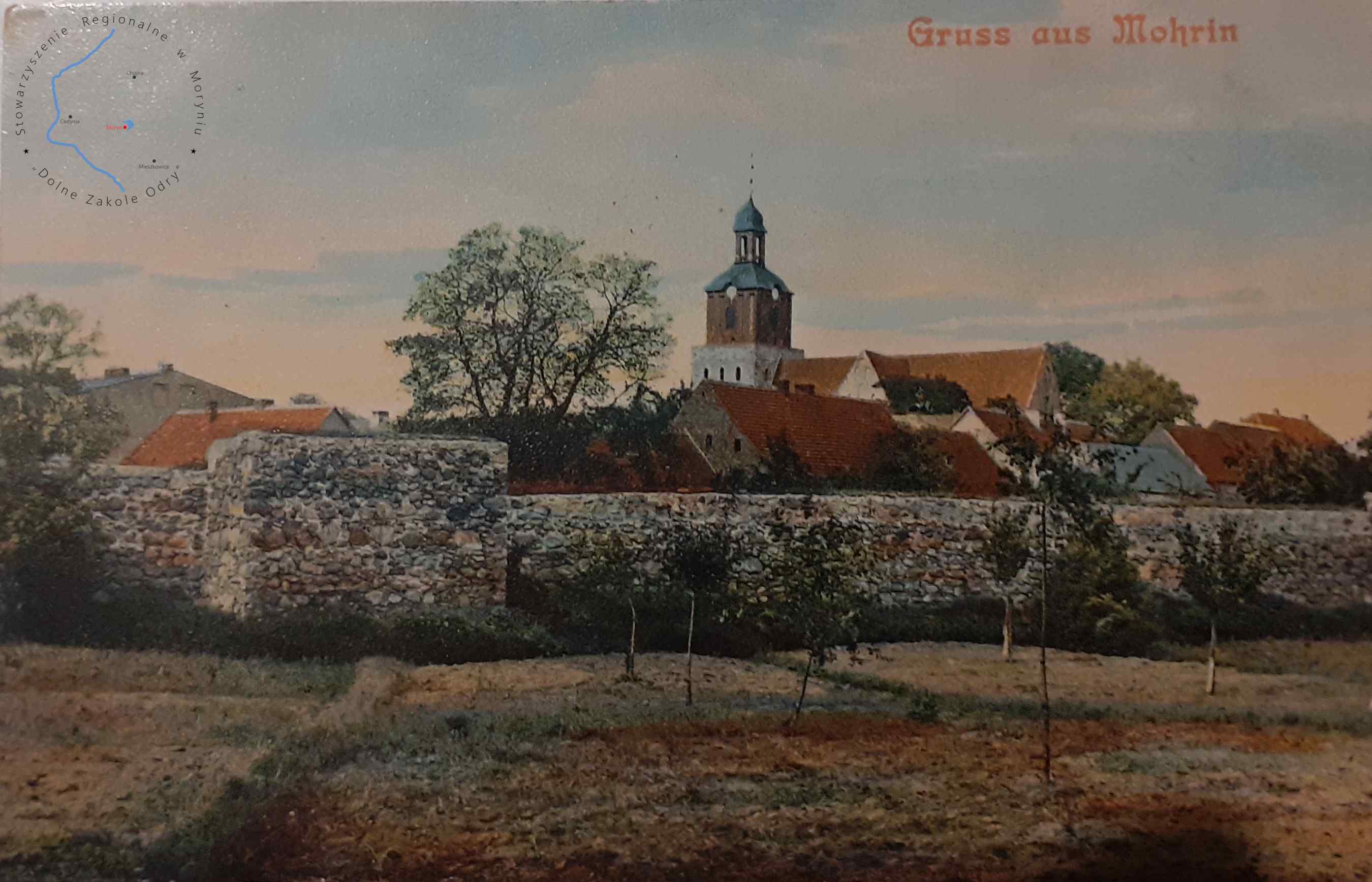 Pocztówka bez obieguWydawca: Gust Kruger Mohrin ( Moryń )MORYŃ Fragment murów miejskich i kościół Świętego Ducha&nbs...