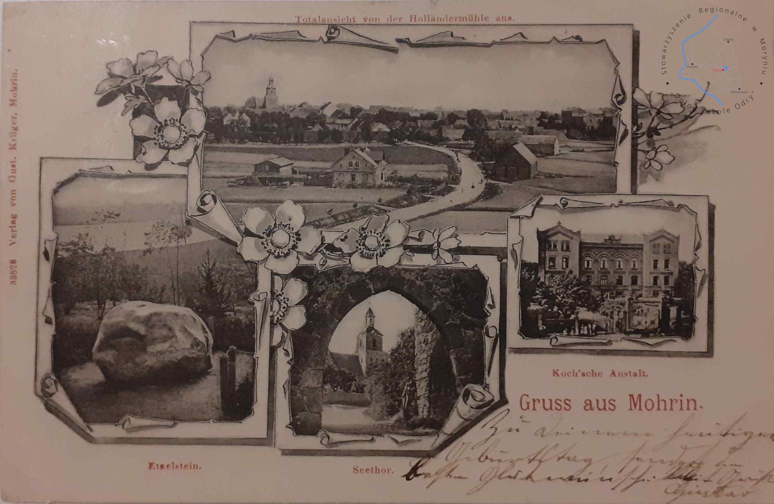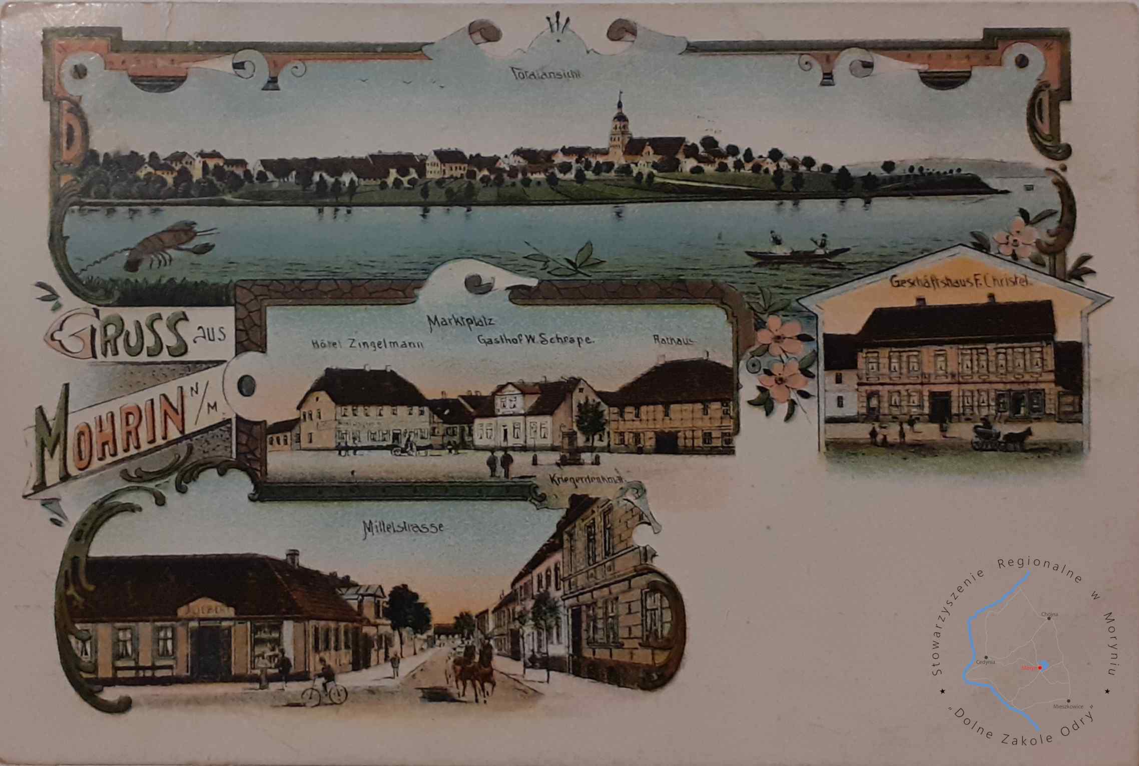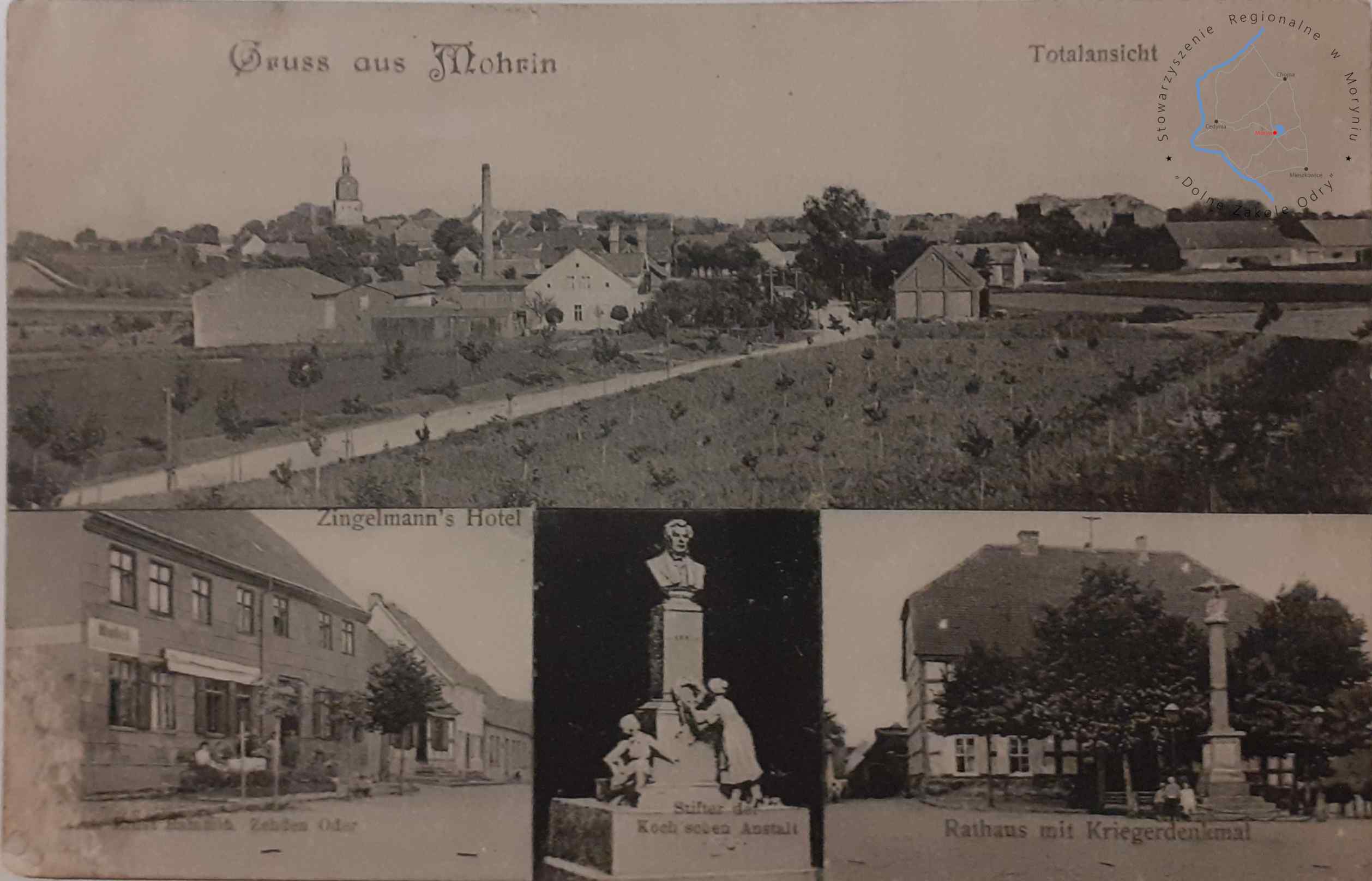 Pocztówka z obiegu, poczta Moryń 3. 1. 1907MORYŃ Pocztówka wielowidokowa, Widok panoramiczny z XIX w. holenderskieg...