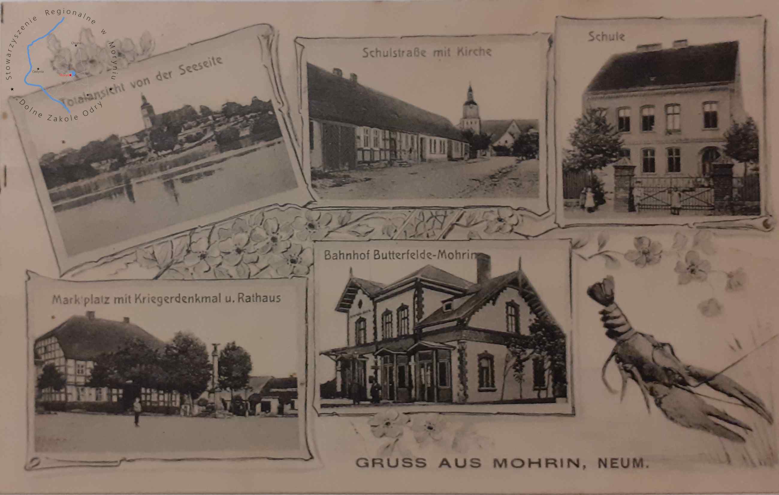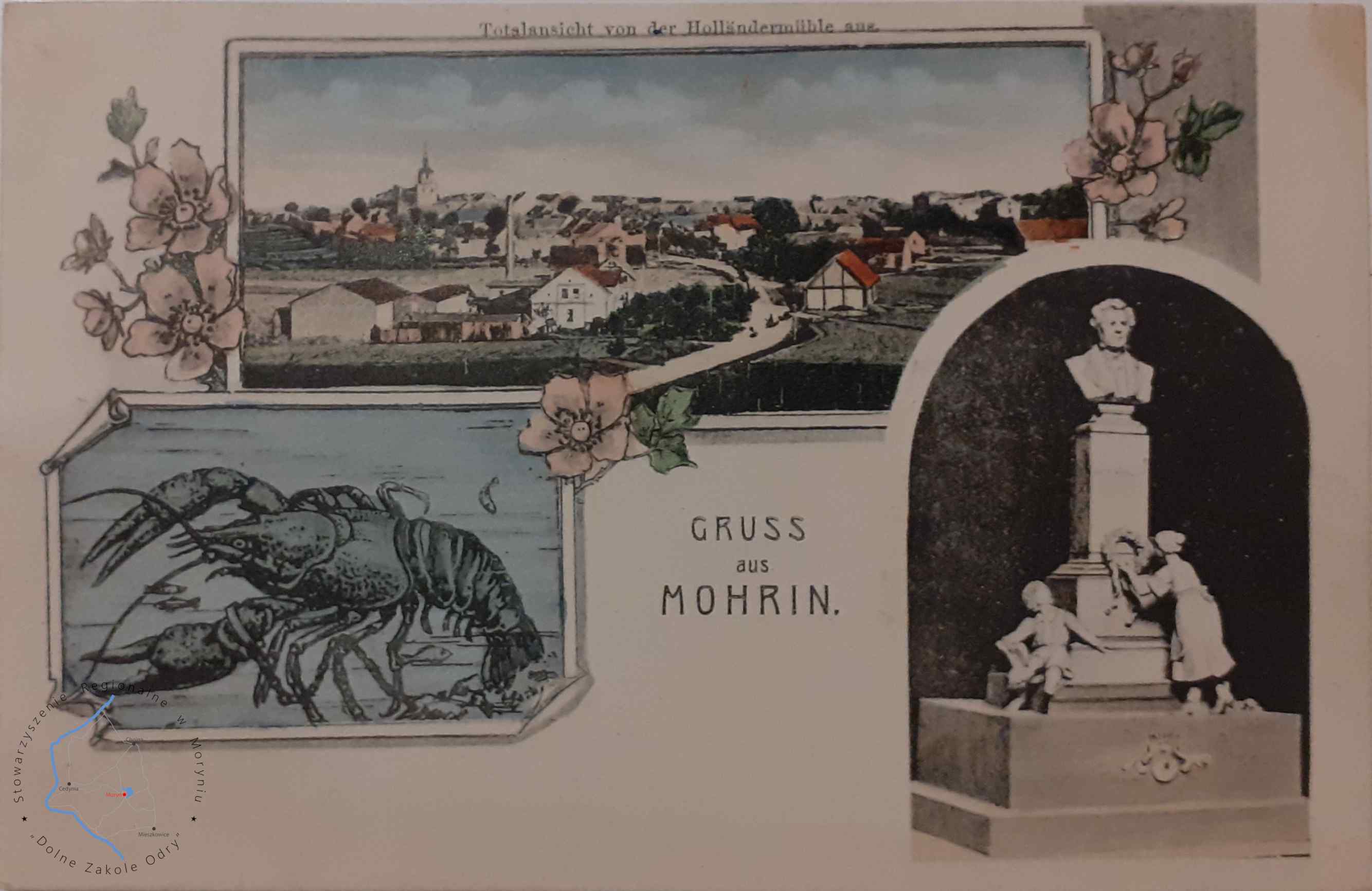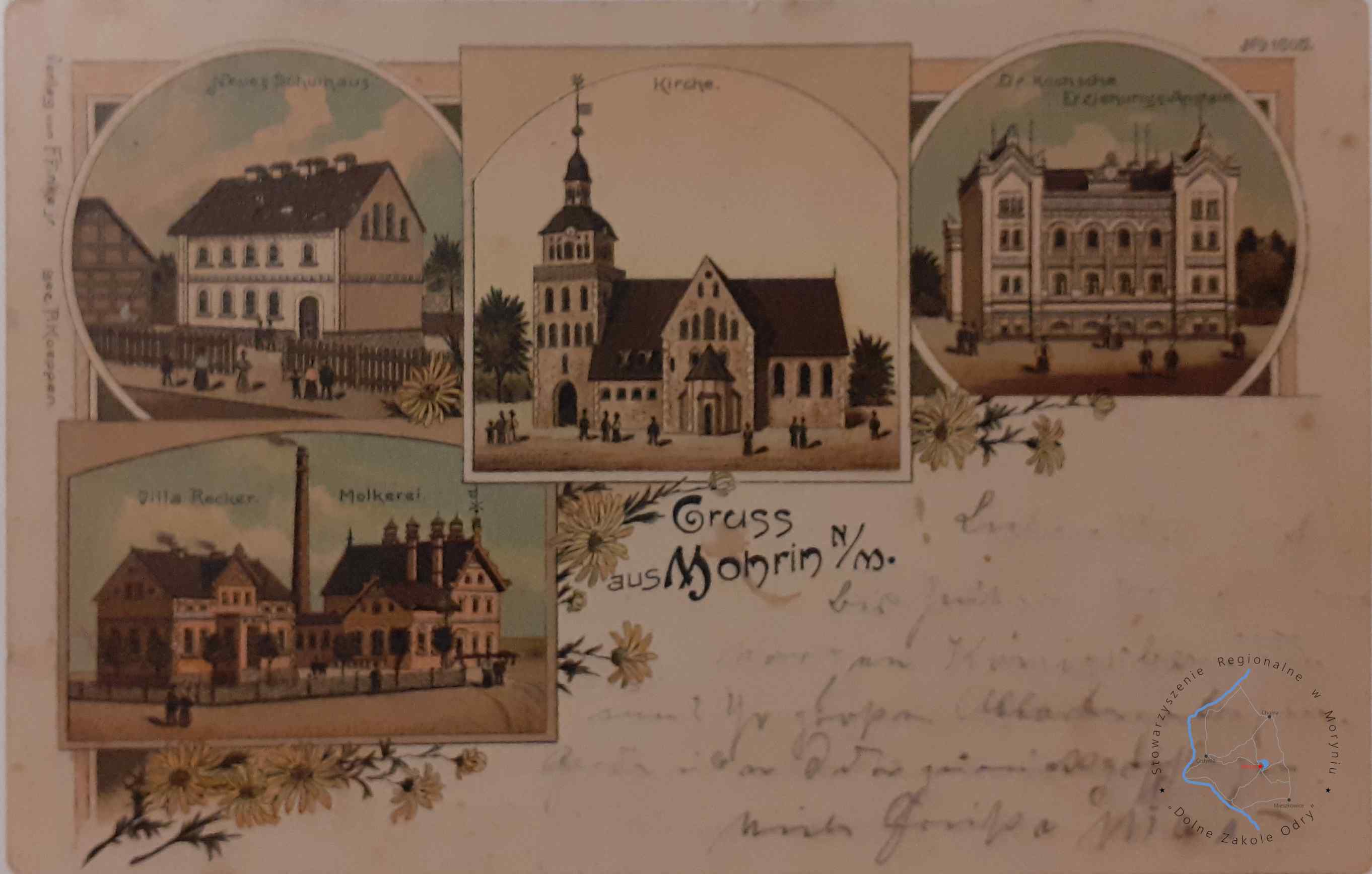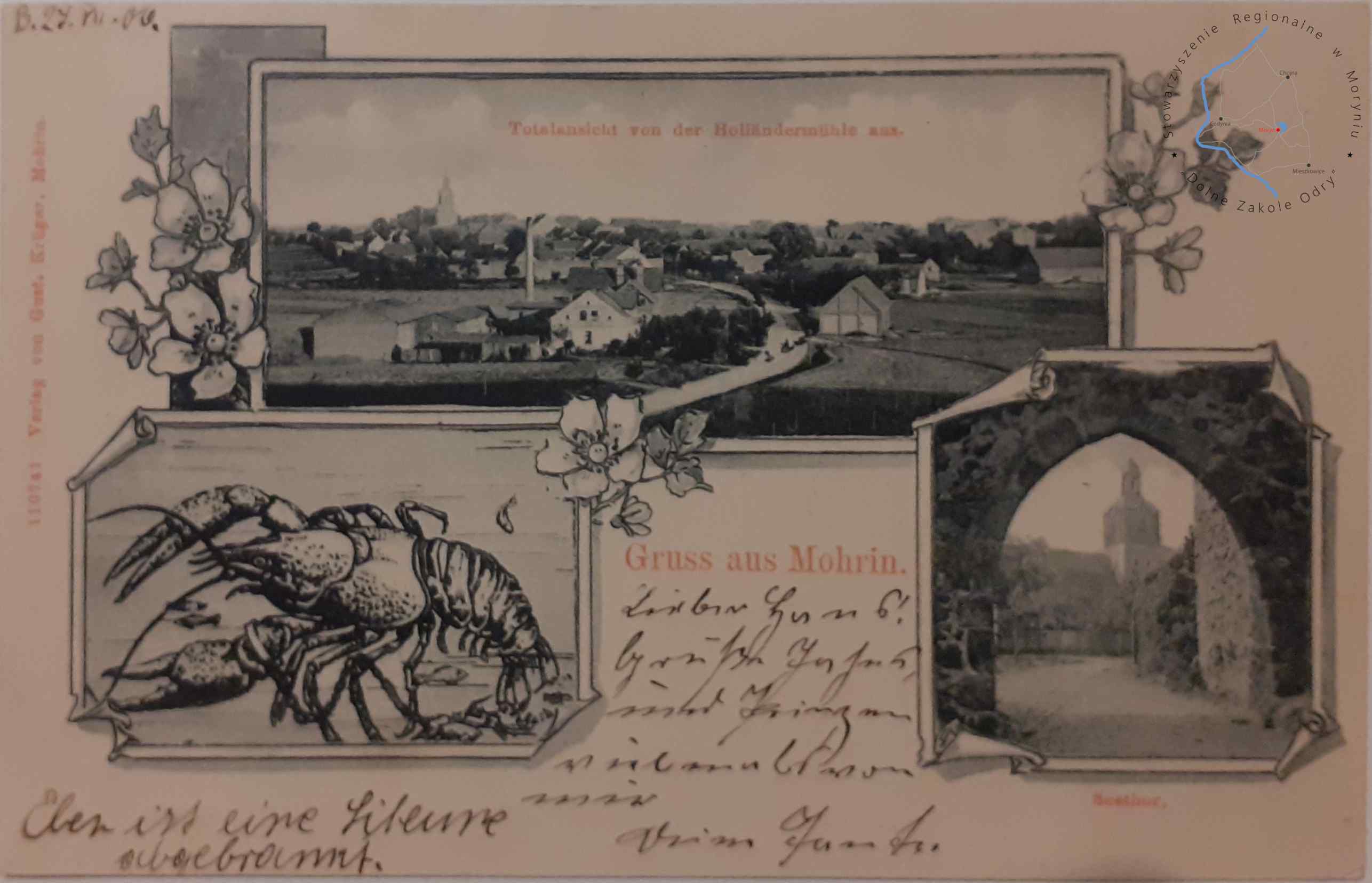 Pocztówka z obiegu, poczta Moryń 3. 1. 1907MORYŃ Pocztówka wielowidokowa, Widok panoramiczny z XIX w. holenderskieg...