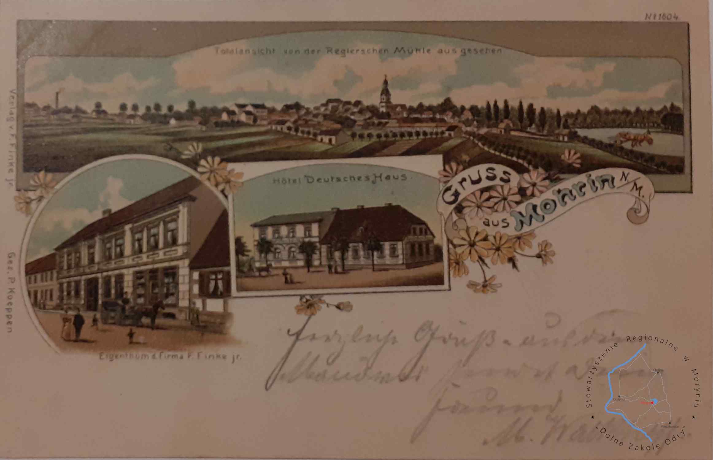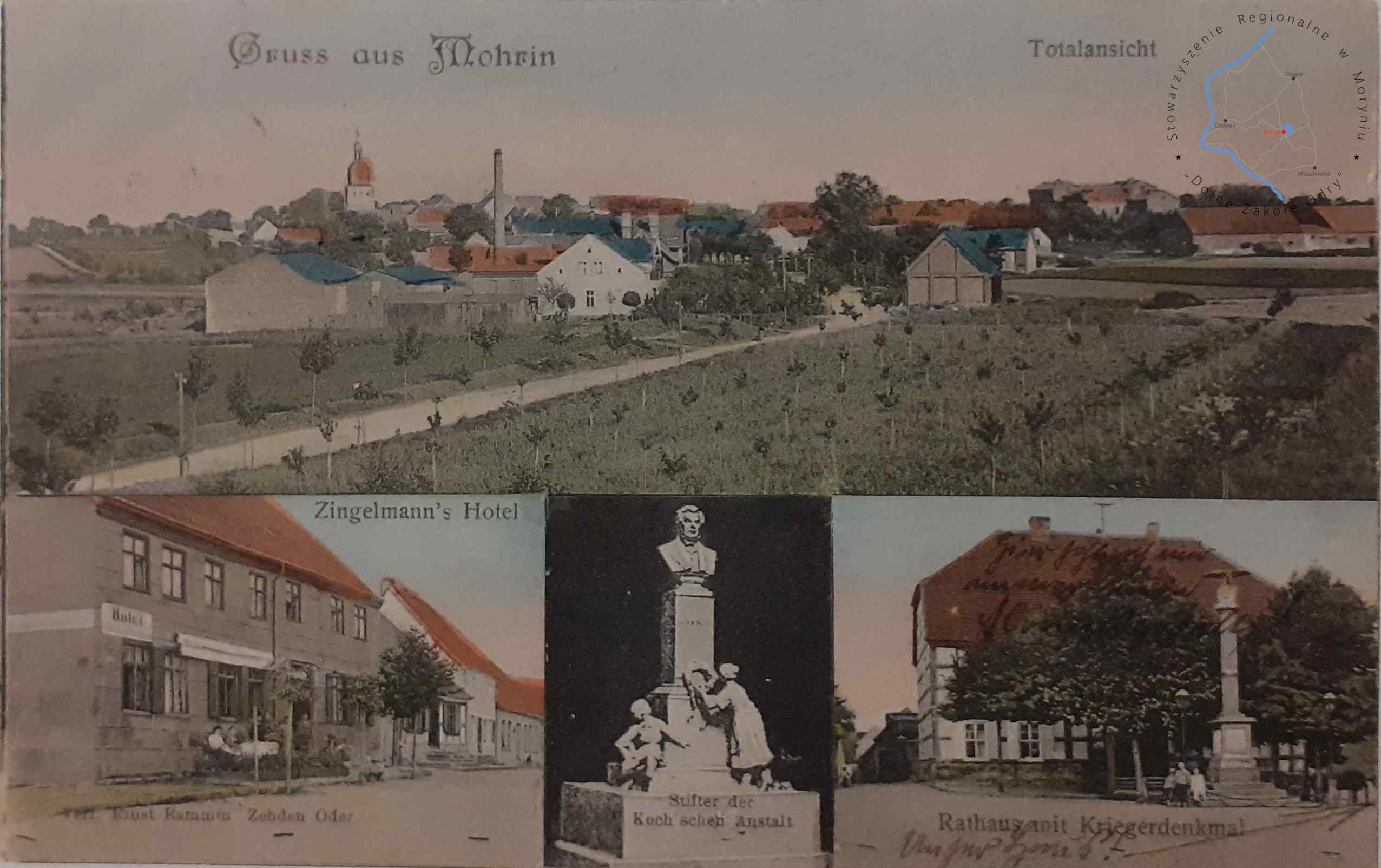 Pocztówka z obiegu, poczta 29. 8. 1904MORYŃ Pocztówka wielowidokowa, Hotel Zingelmann. Materiały, wina i browary W....