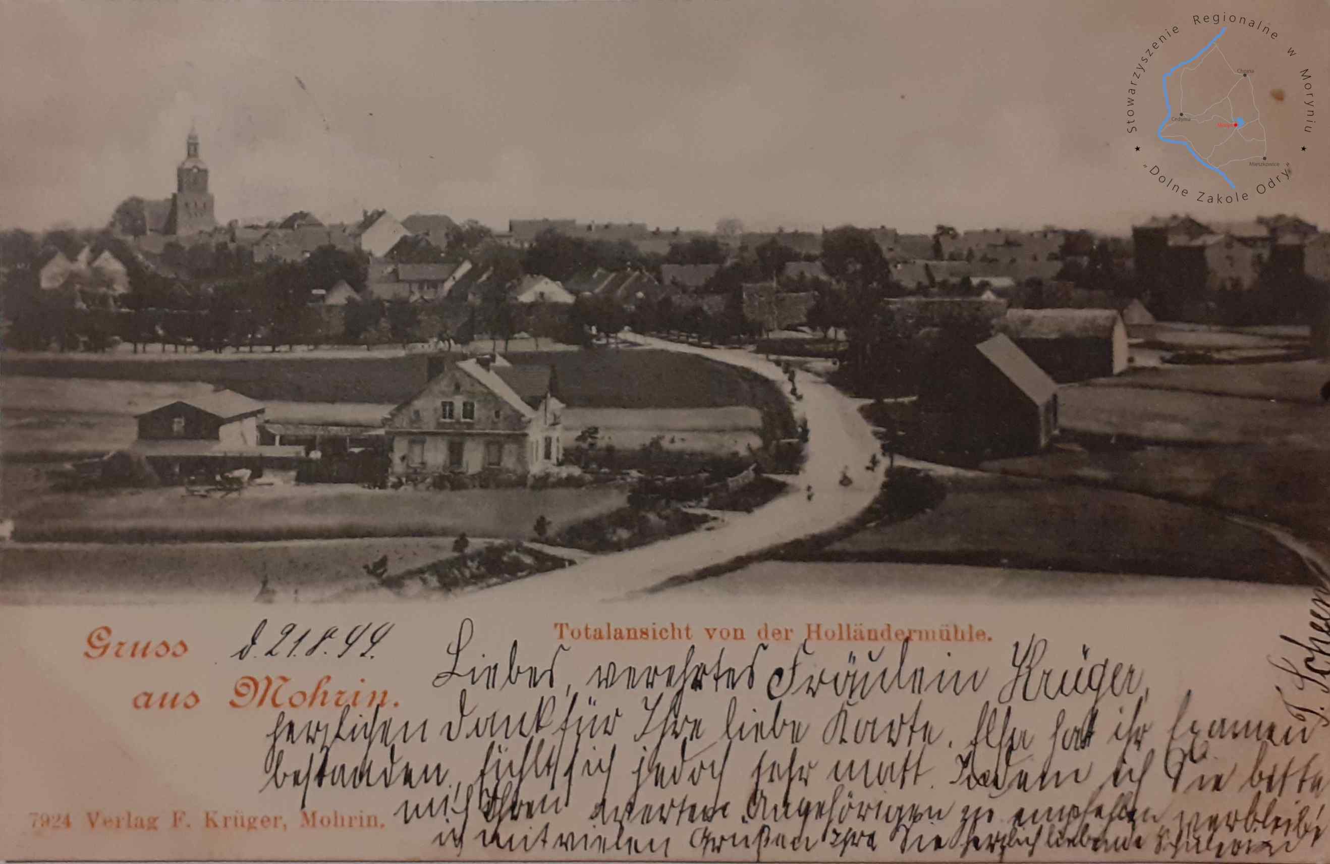 Pocztówka z obiegu, poczta Moryń 20. 7. 1899Wydawca: F. Kruger Mohrin ( Moryń )MORYŃ Widok panoramiczny z XIX w. ho...