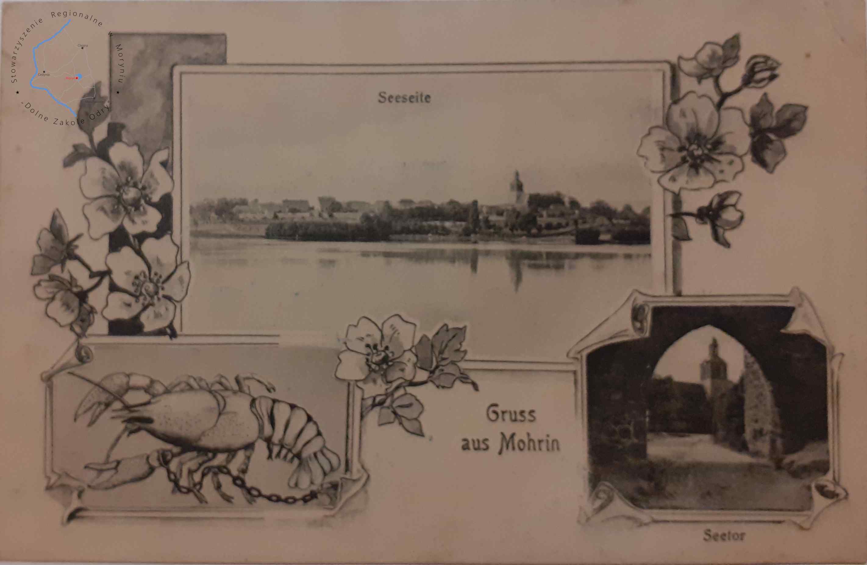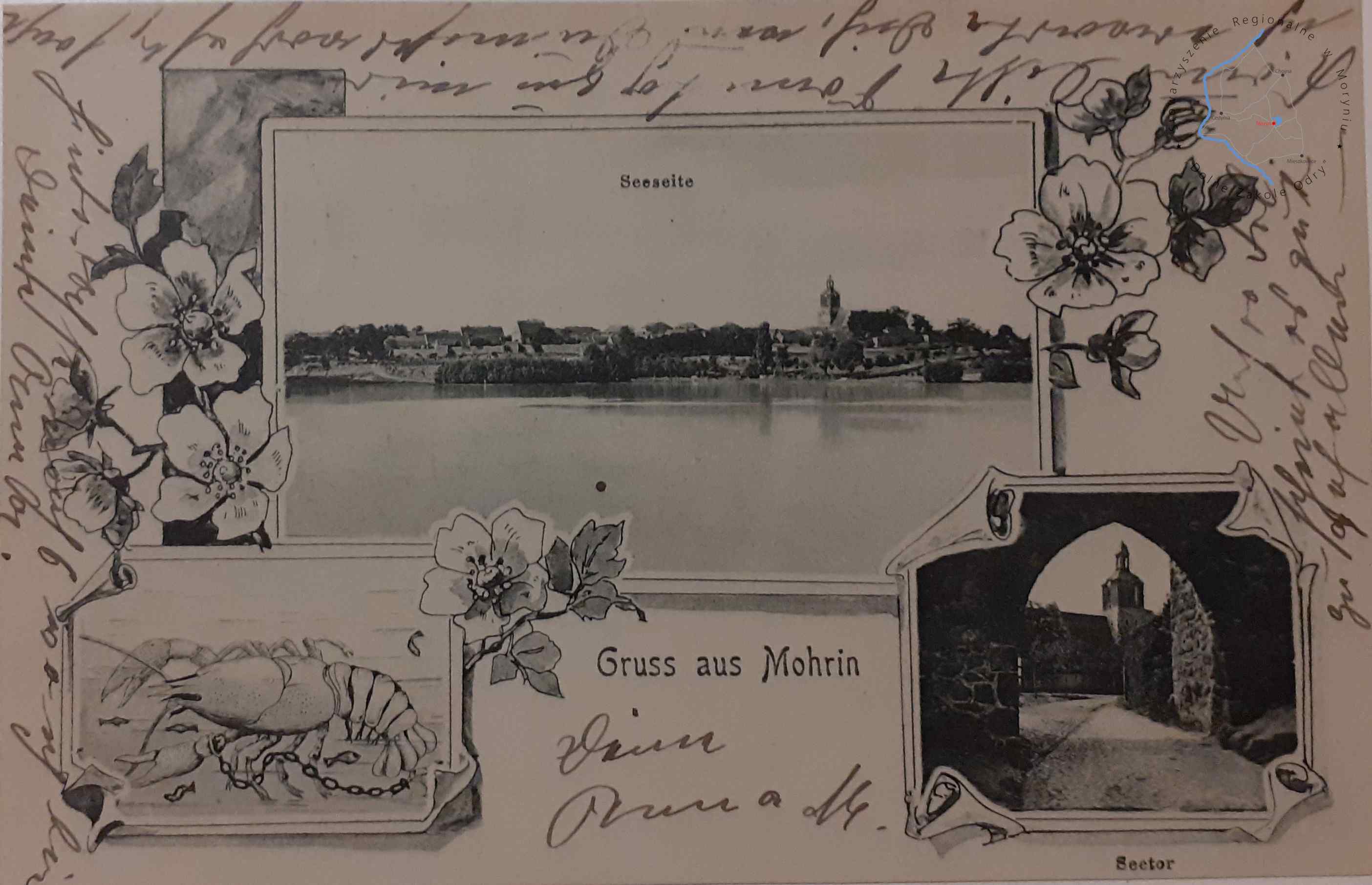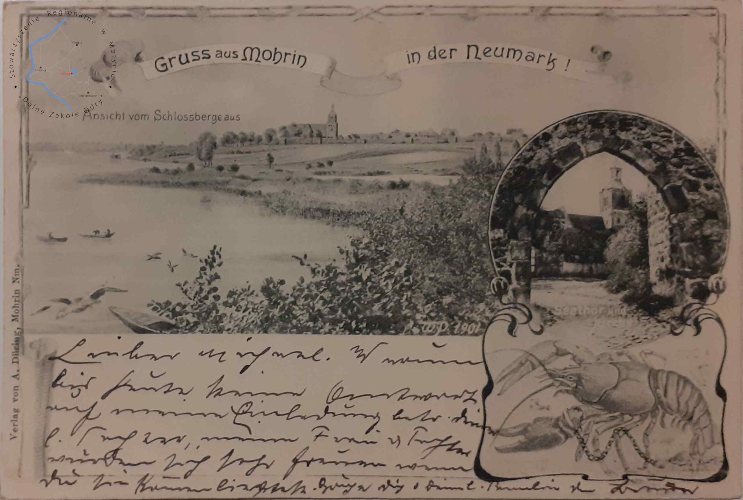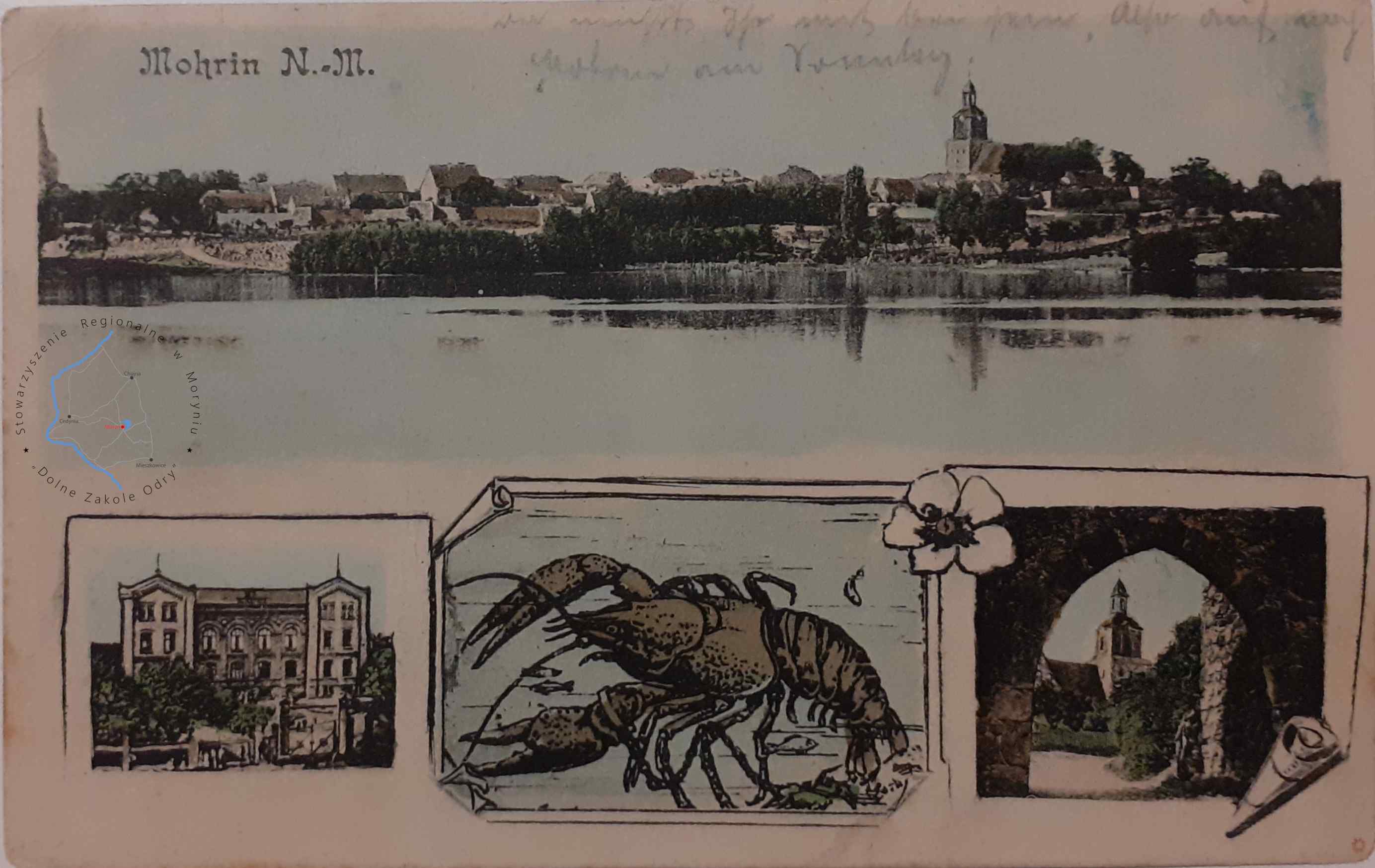 Pocztówka z obiegu, poczta Moryń 15. 6. 1907MORYŃ Pocztówka litograficzna wielowidokowa, widok z jeziora Morzycko n...