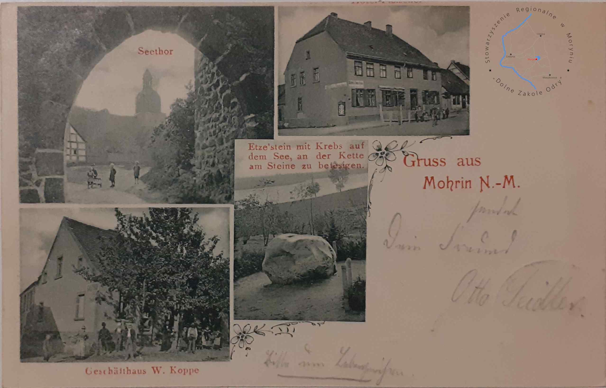 Pocztówka z obiegu, poczta Moryń 17. 7. 1908Wydawca: W. Koppe, Mohrin, Neumark ( Moryń )MORYŃ Pocztówka wielowidok...