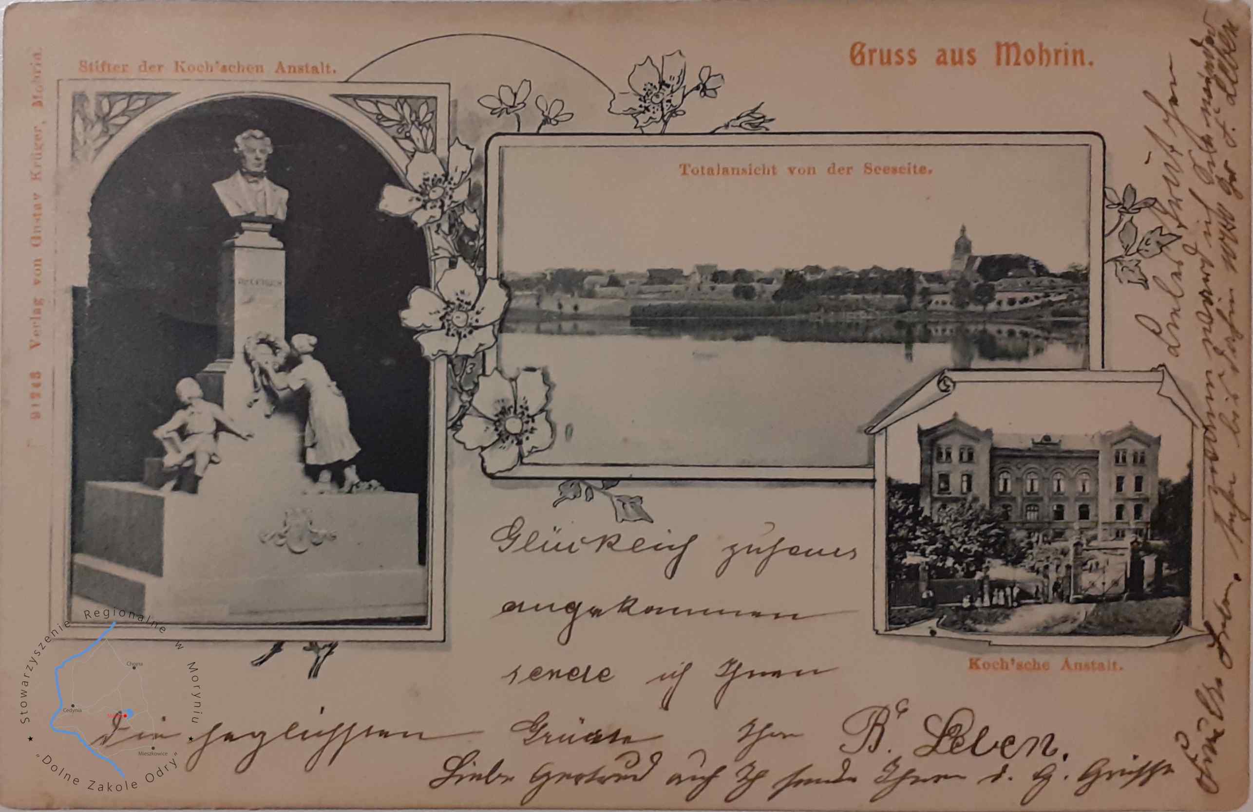 Pocztówka z obiegu, poczta Mieszkowice 19. 4. 1911Wydawca: Gustav Kruger Mohrin ( Moryń )MORYŃ Pocztówka wielowidok...