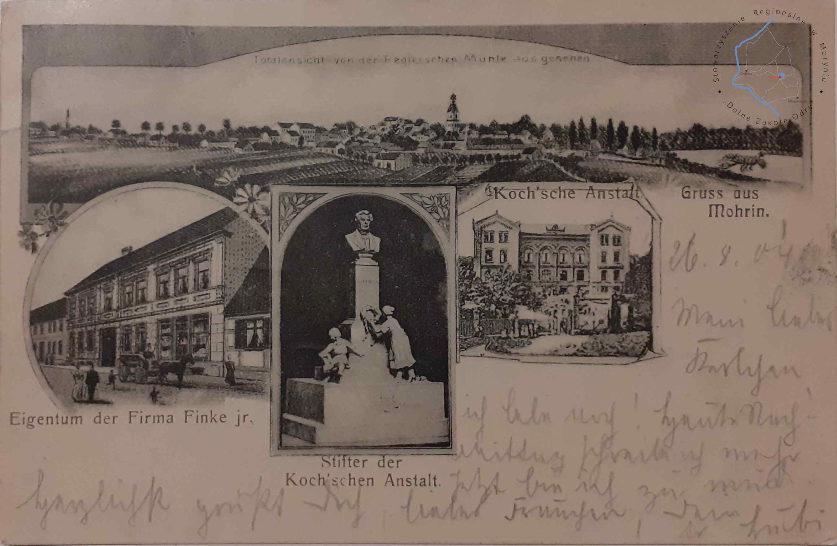 Pocztówka z obiegu, poczta Moryń 26. 9. 1904MORYŃ Pocztówka wielowidokowa, widok panoramiczny z wiatraka od strony ...