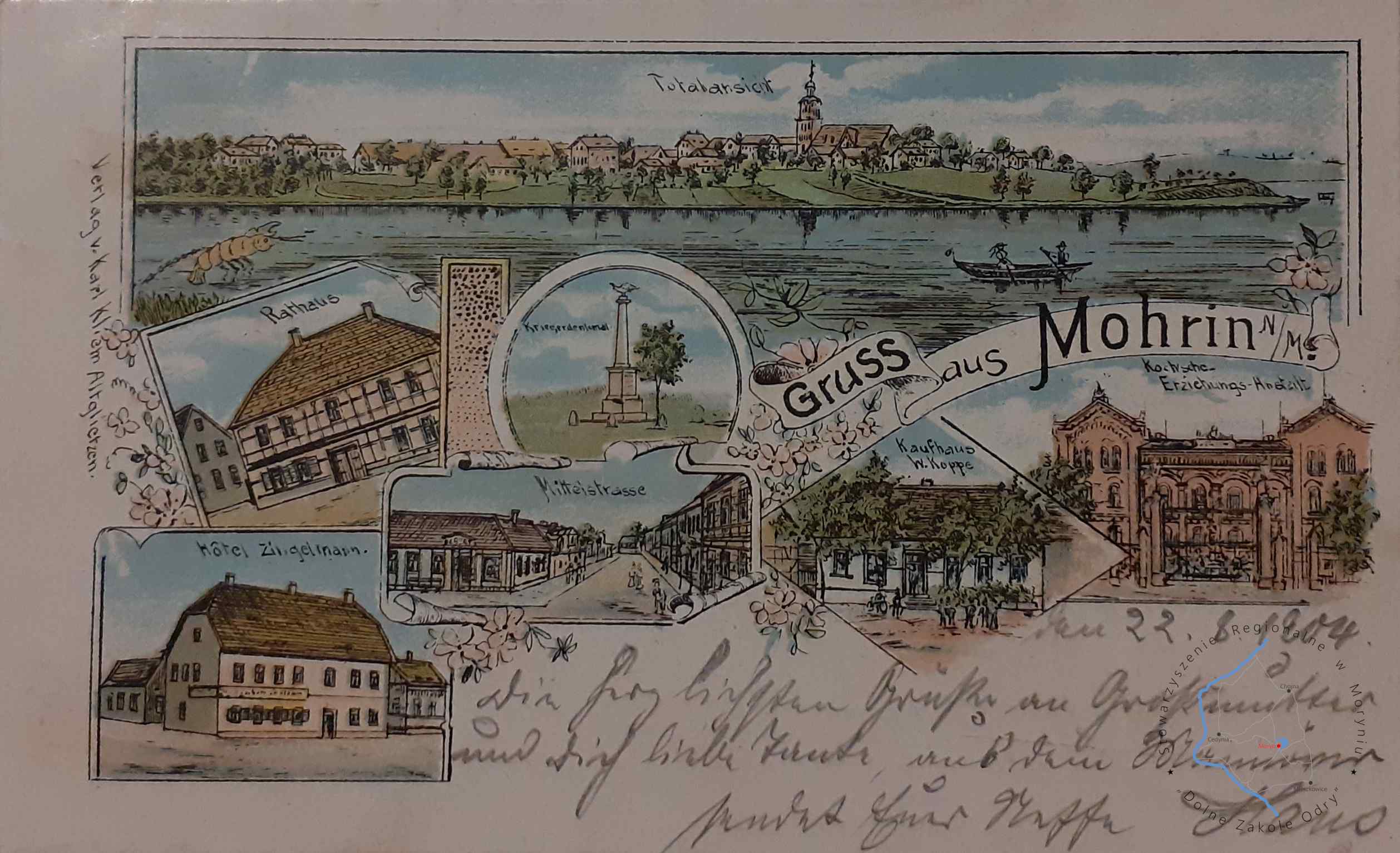 Pocztówka z obiegu, poczta Moryń 22. 8. 1904Wydawca: Karl Kliem AltglietzenMORYŃ Pocztówka wielowidokowa, widok z j...