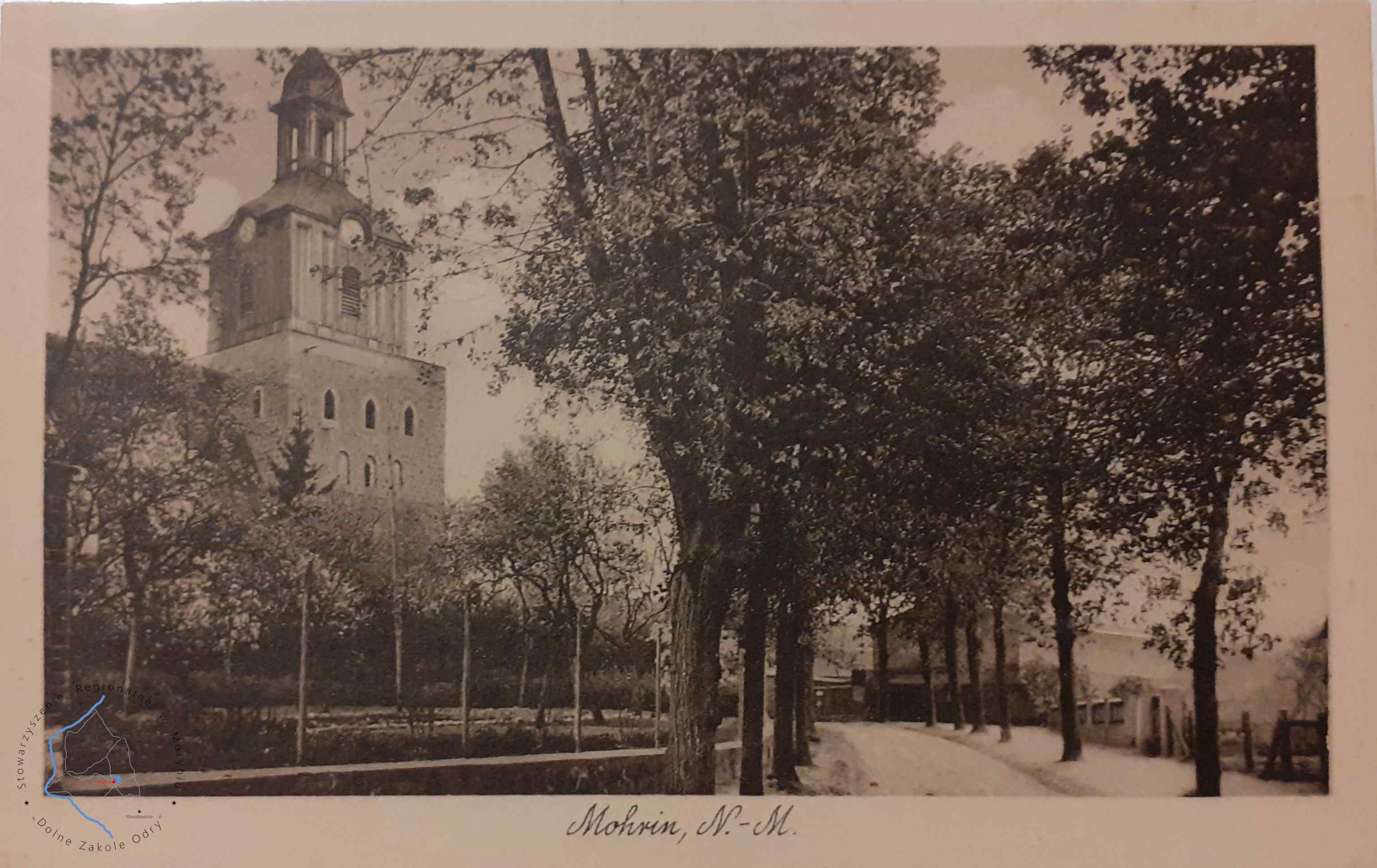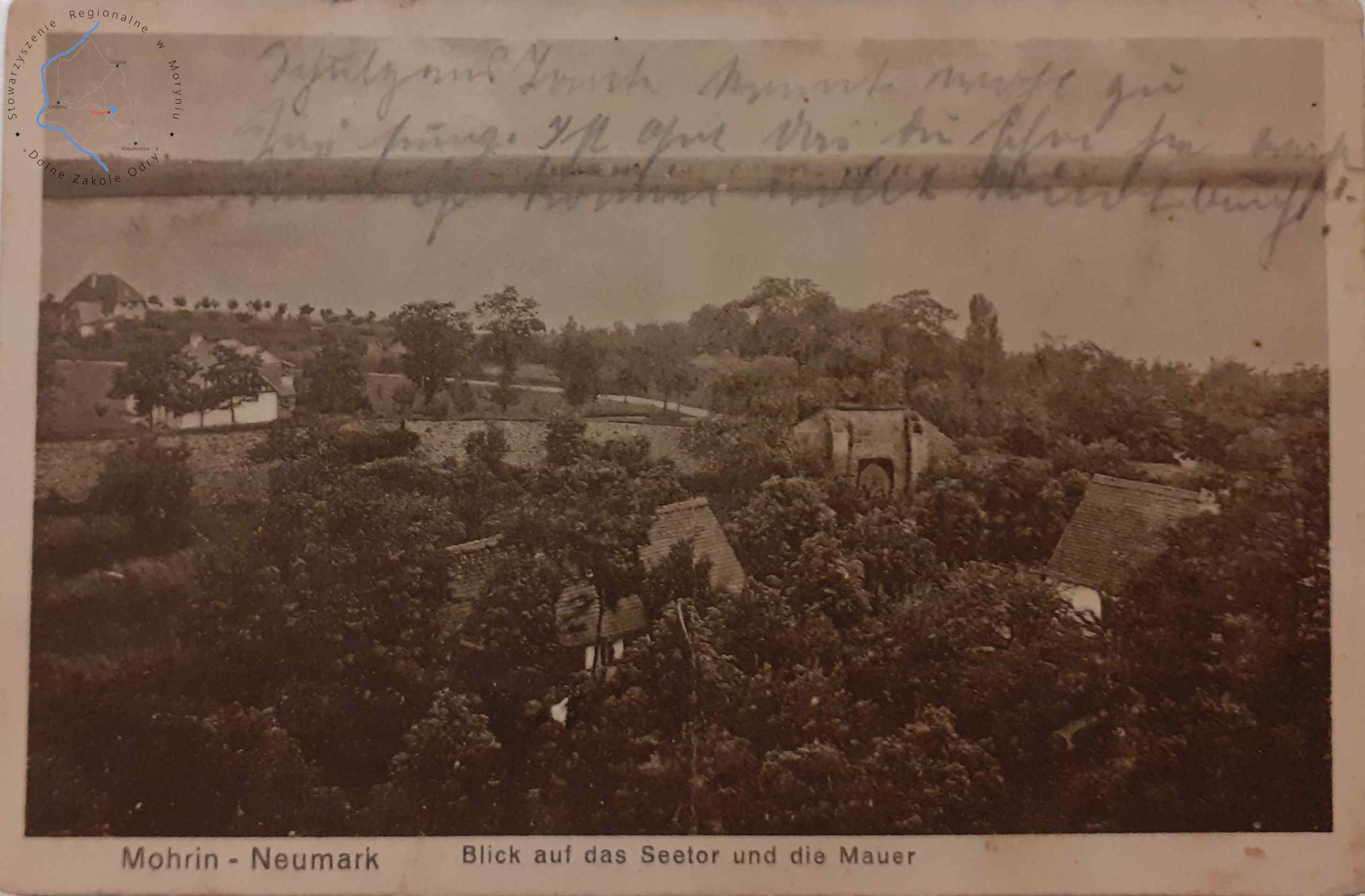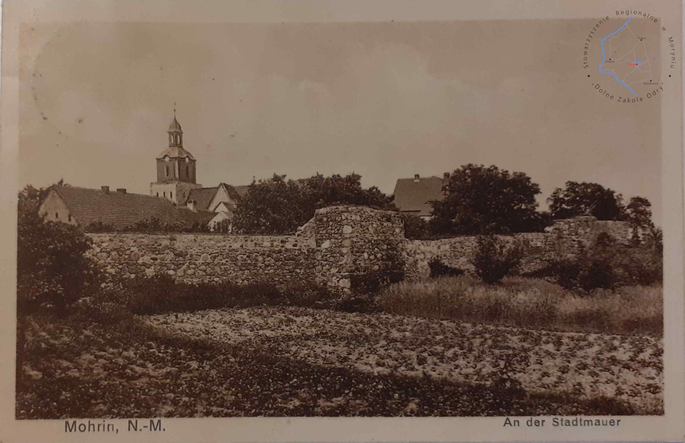 Pocztówka z obiegu, poczta Moryń 13. 7. 1927Wydawca: J. L. R.MORYŃ Fragment murów miejskich i kościół Świętego...