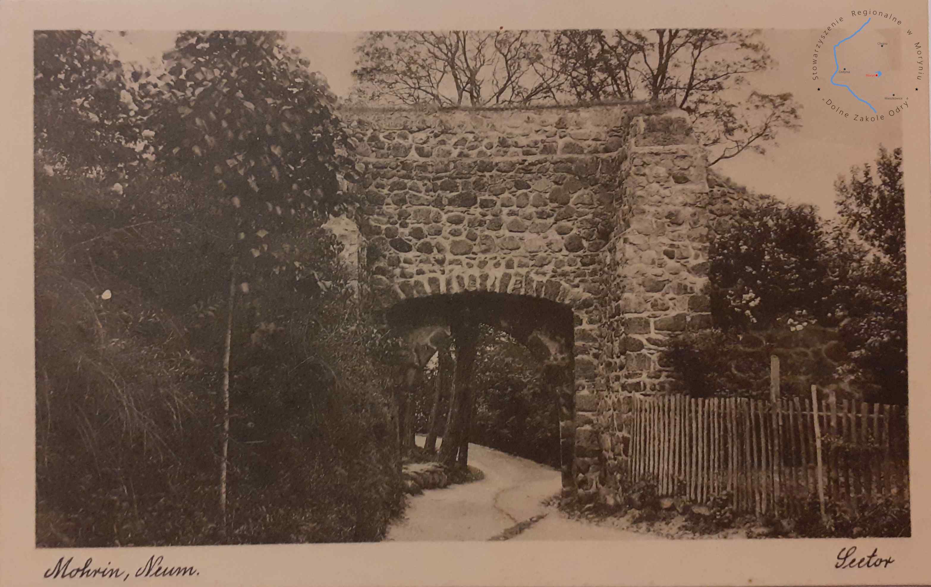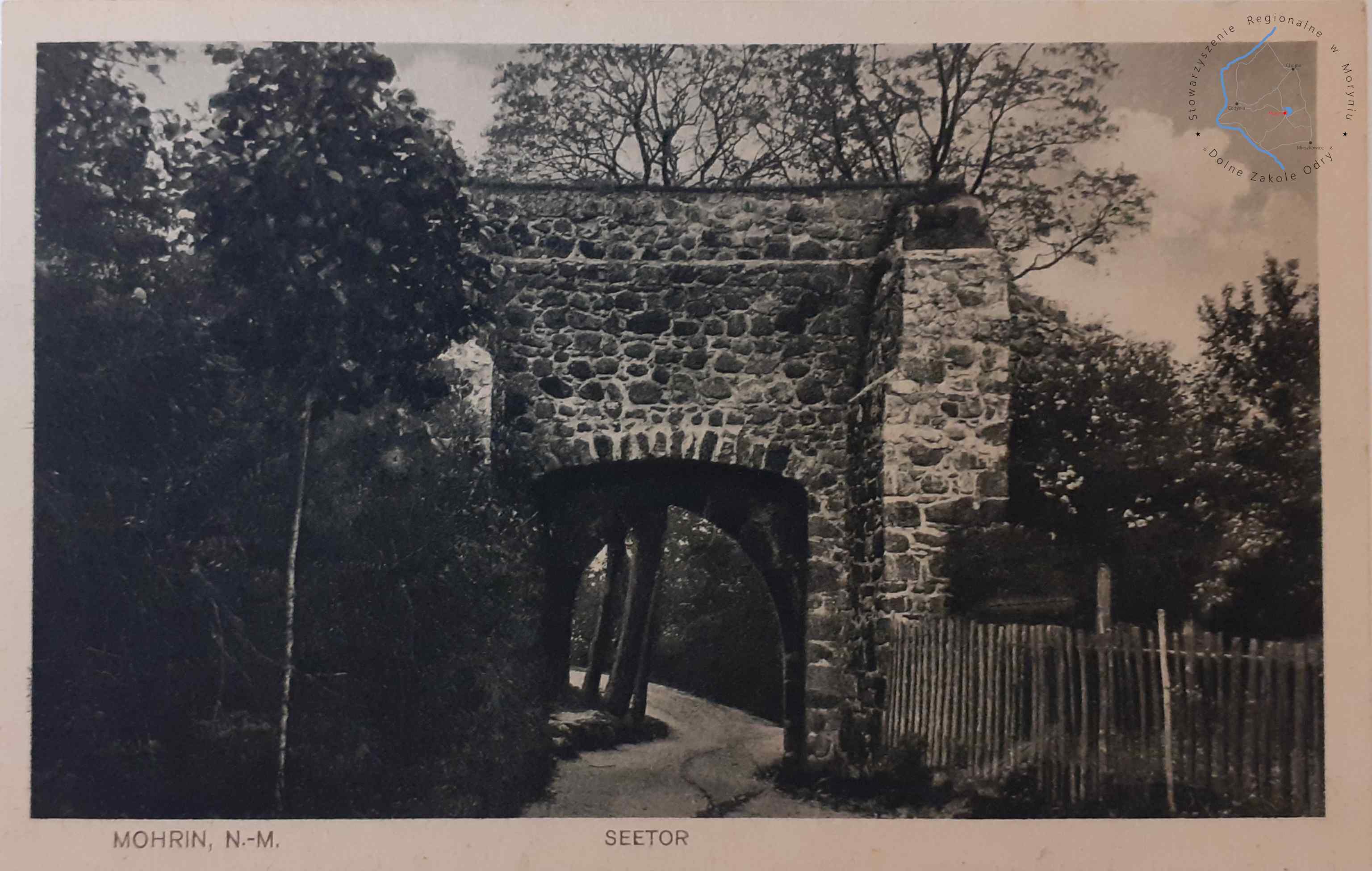 Pocztówka z obiegu, poczta Moryń 31. 8. 1933Wydawca: J. L. R.MORYŃ Brama północna w murach miejskich z XIII -XIV w...