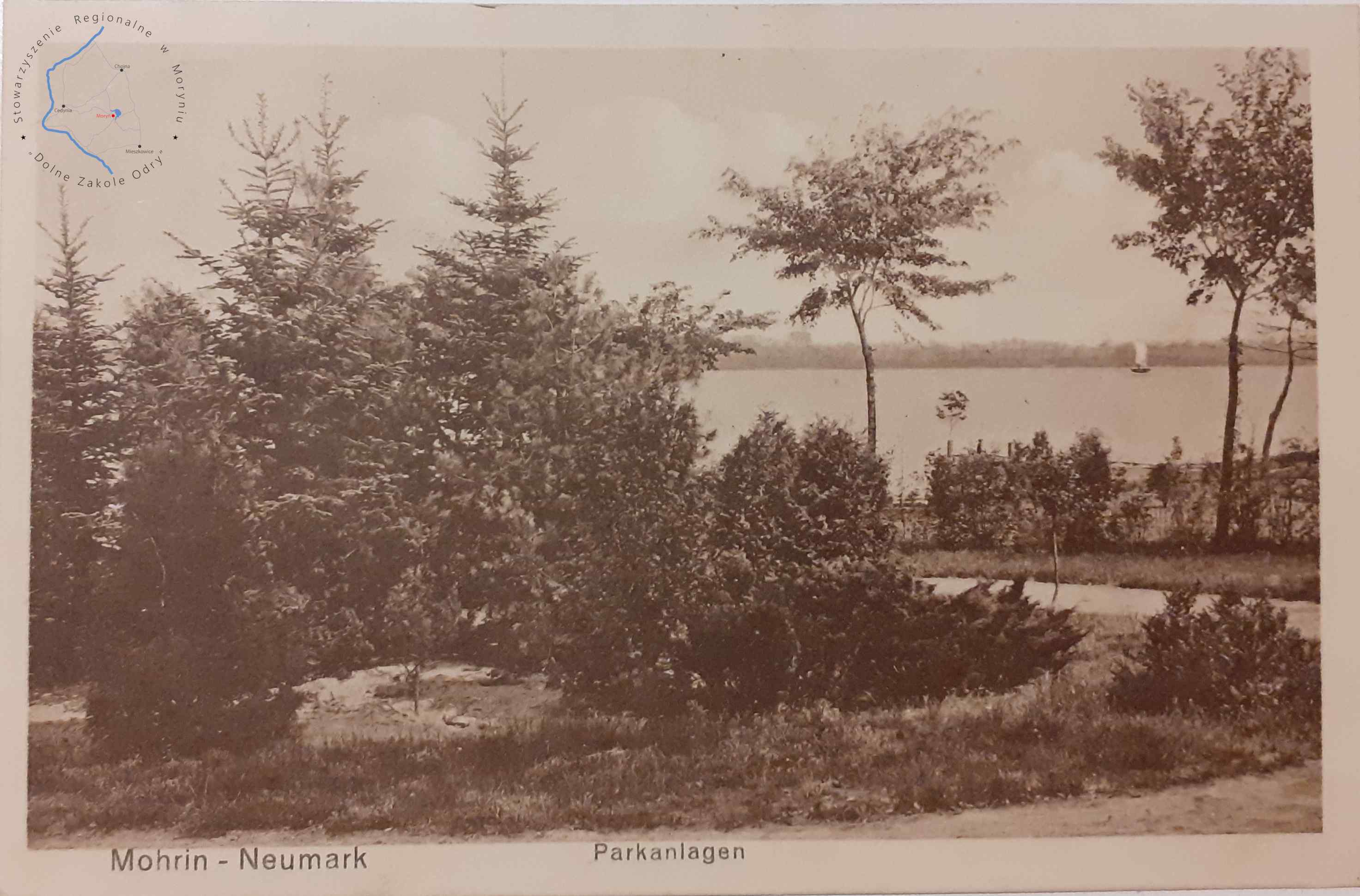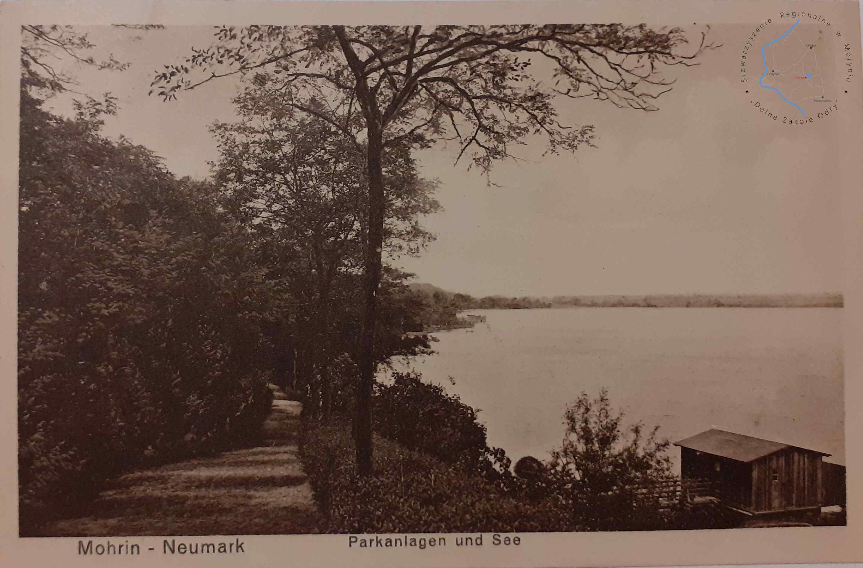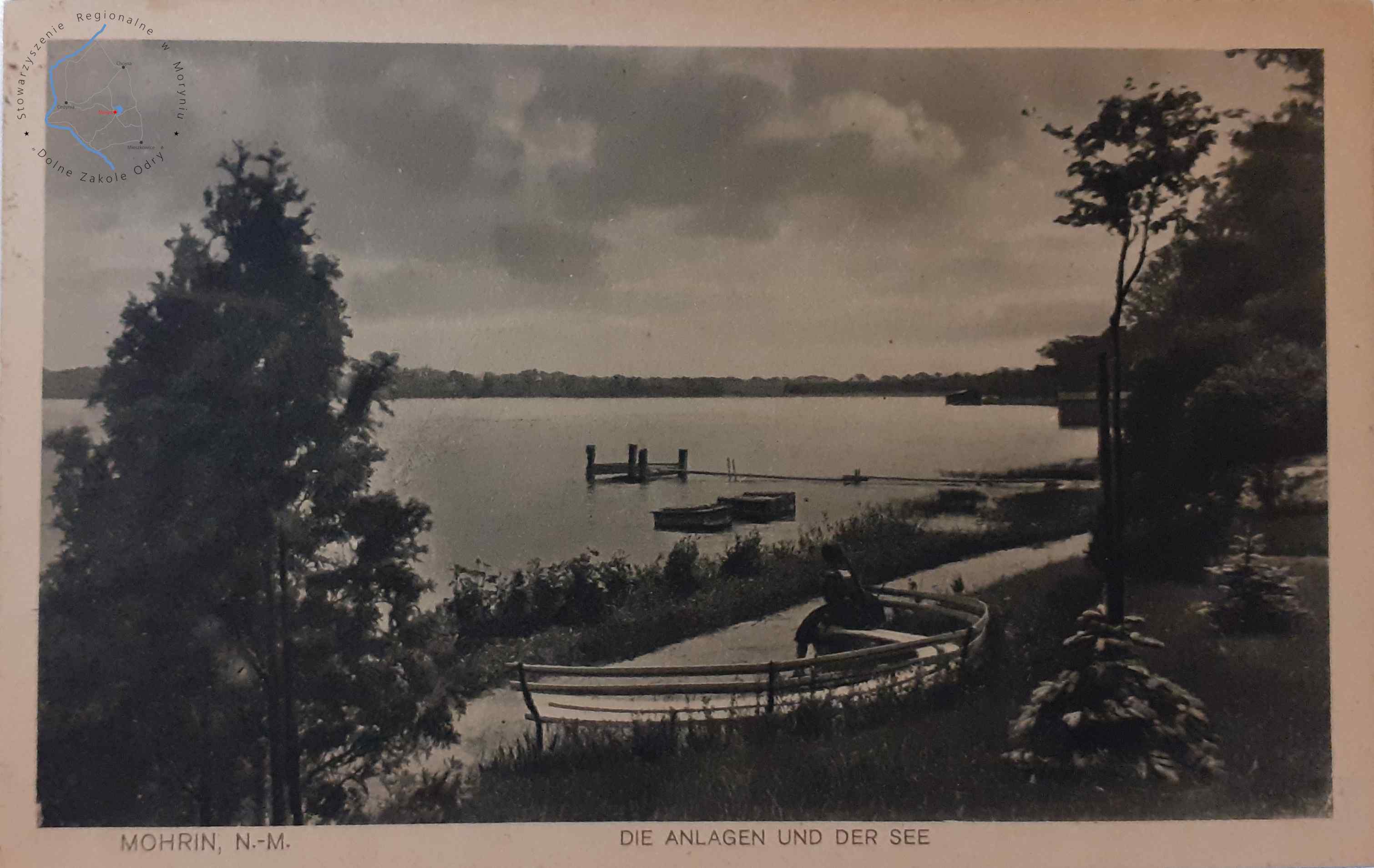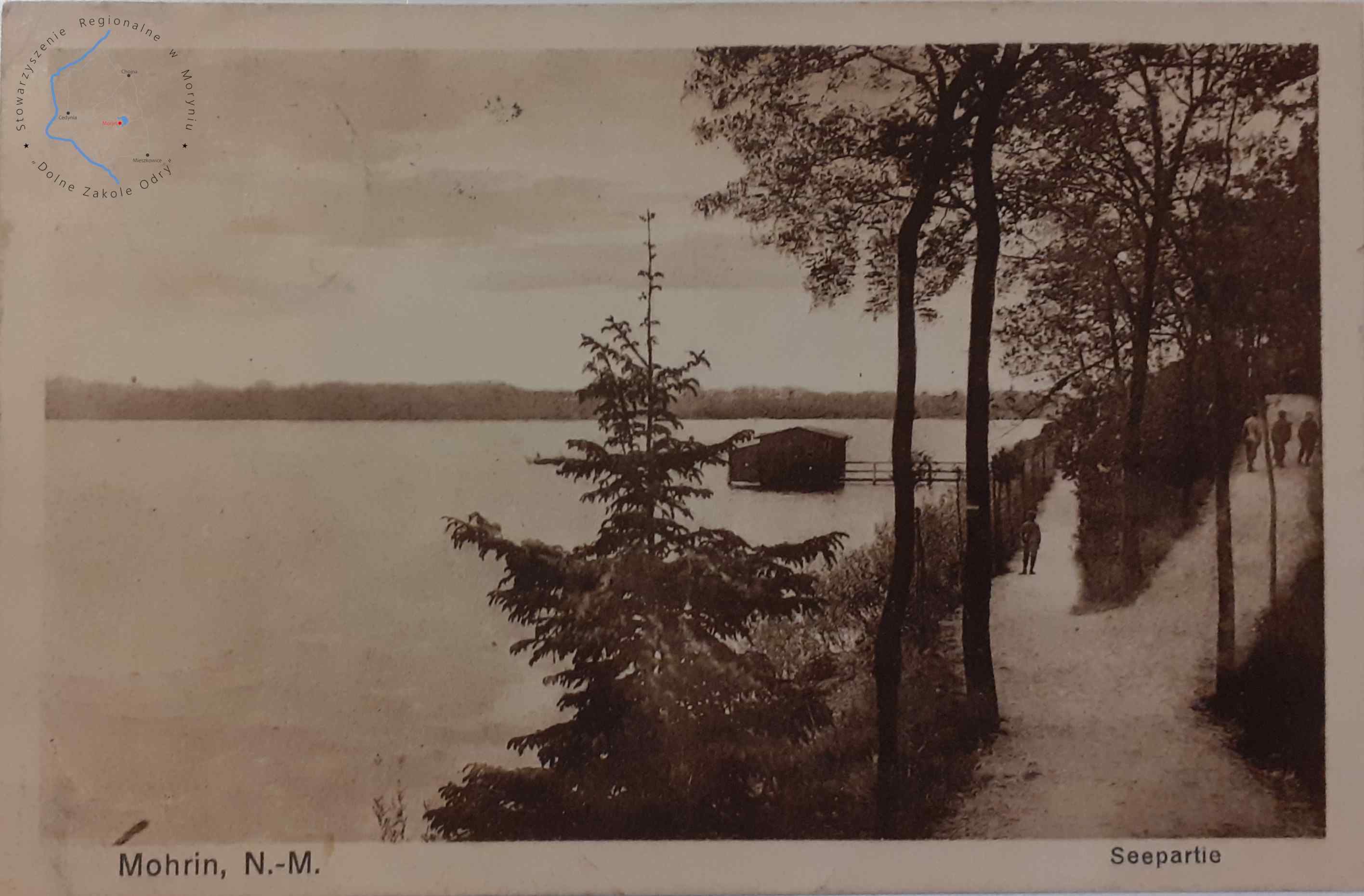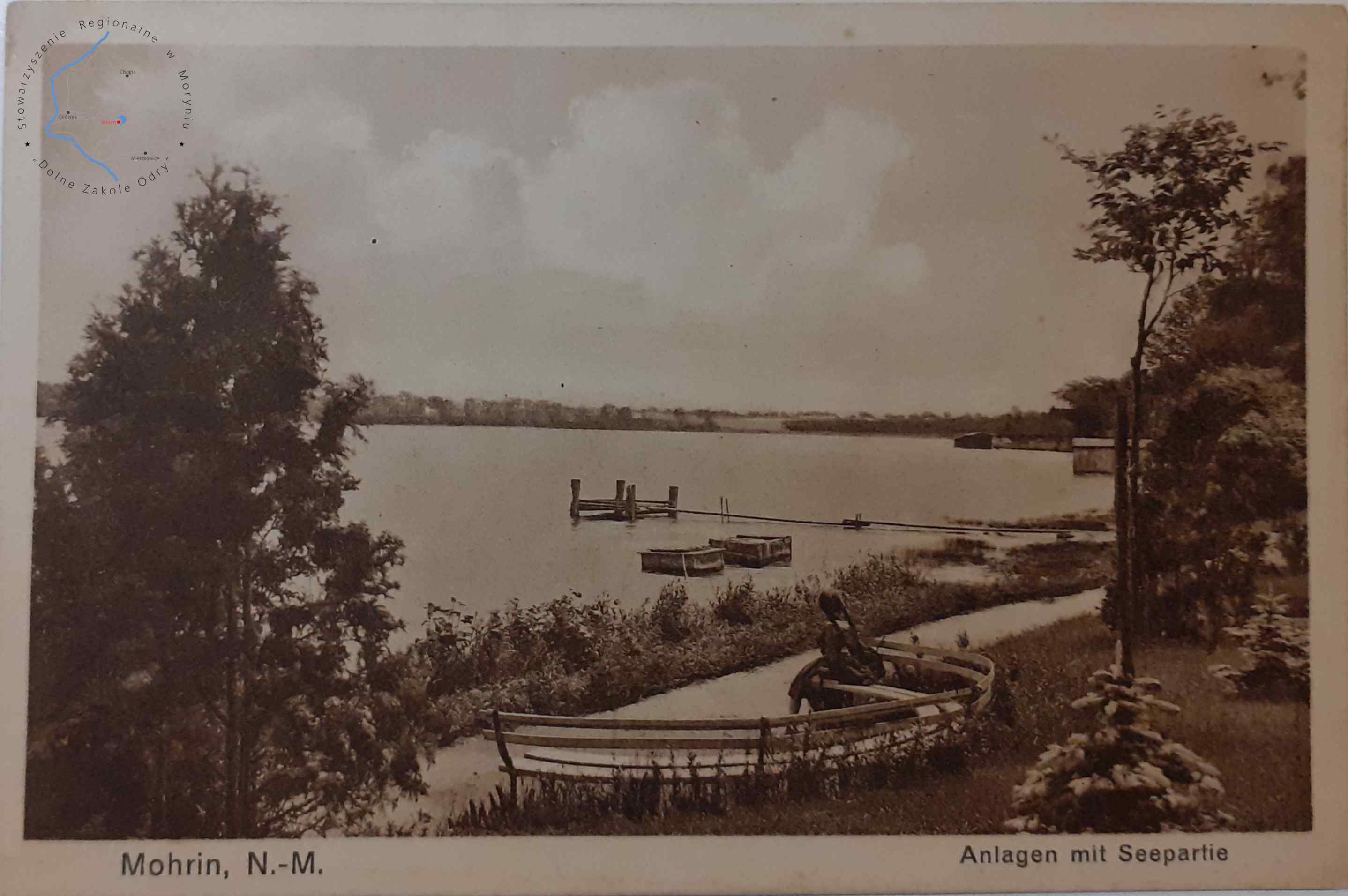 Pocztówka z obiegu, poczta Moryń 6. 12. 1928Wydawca: J. L. R.MORYŃ Fragment promenady nad jeziorem Morzycko
