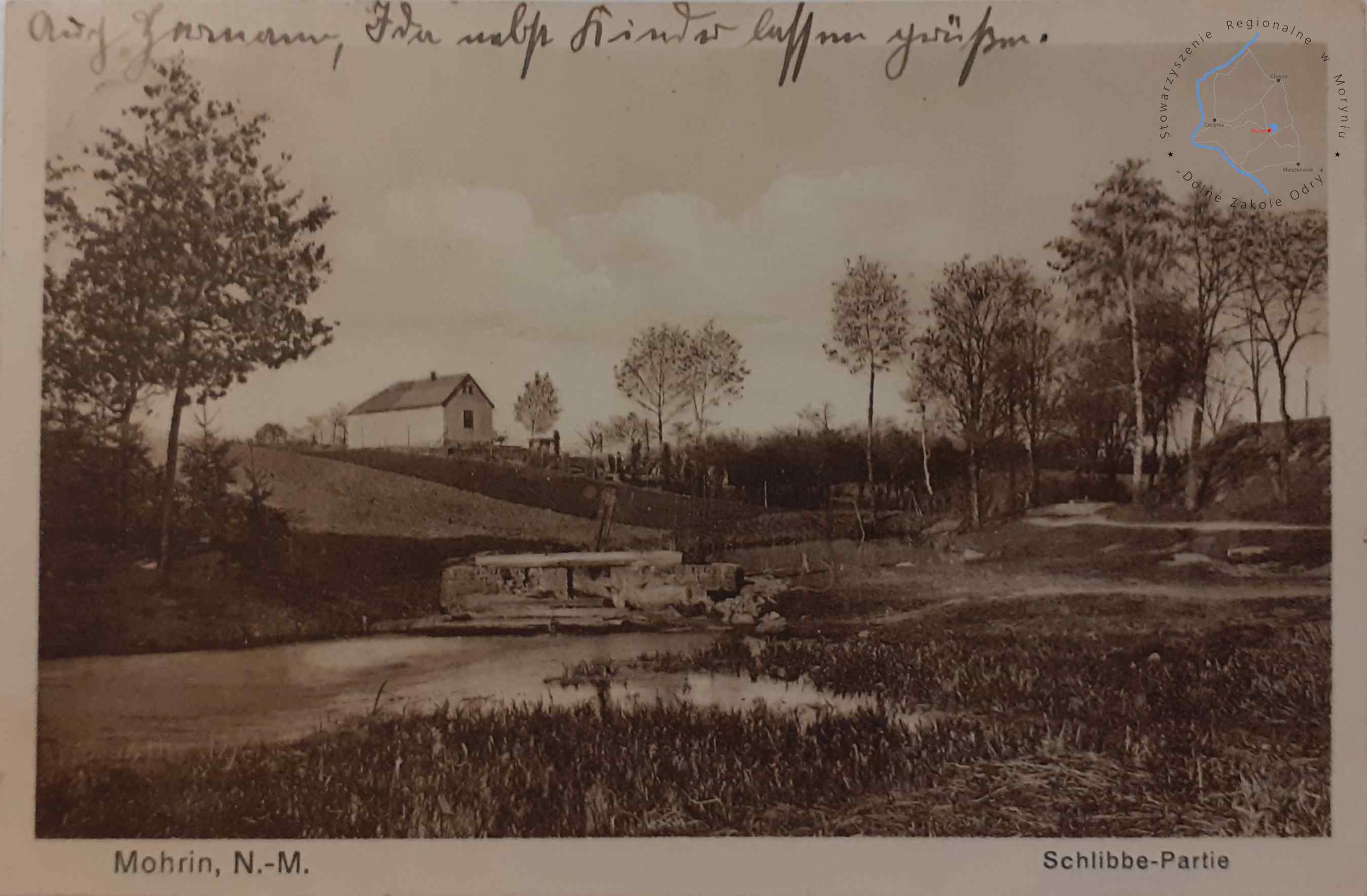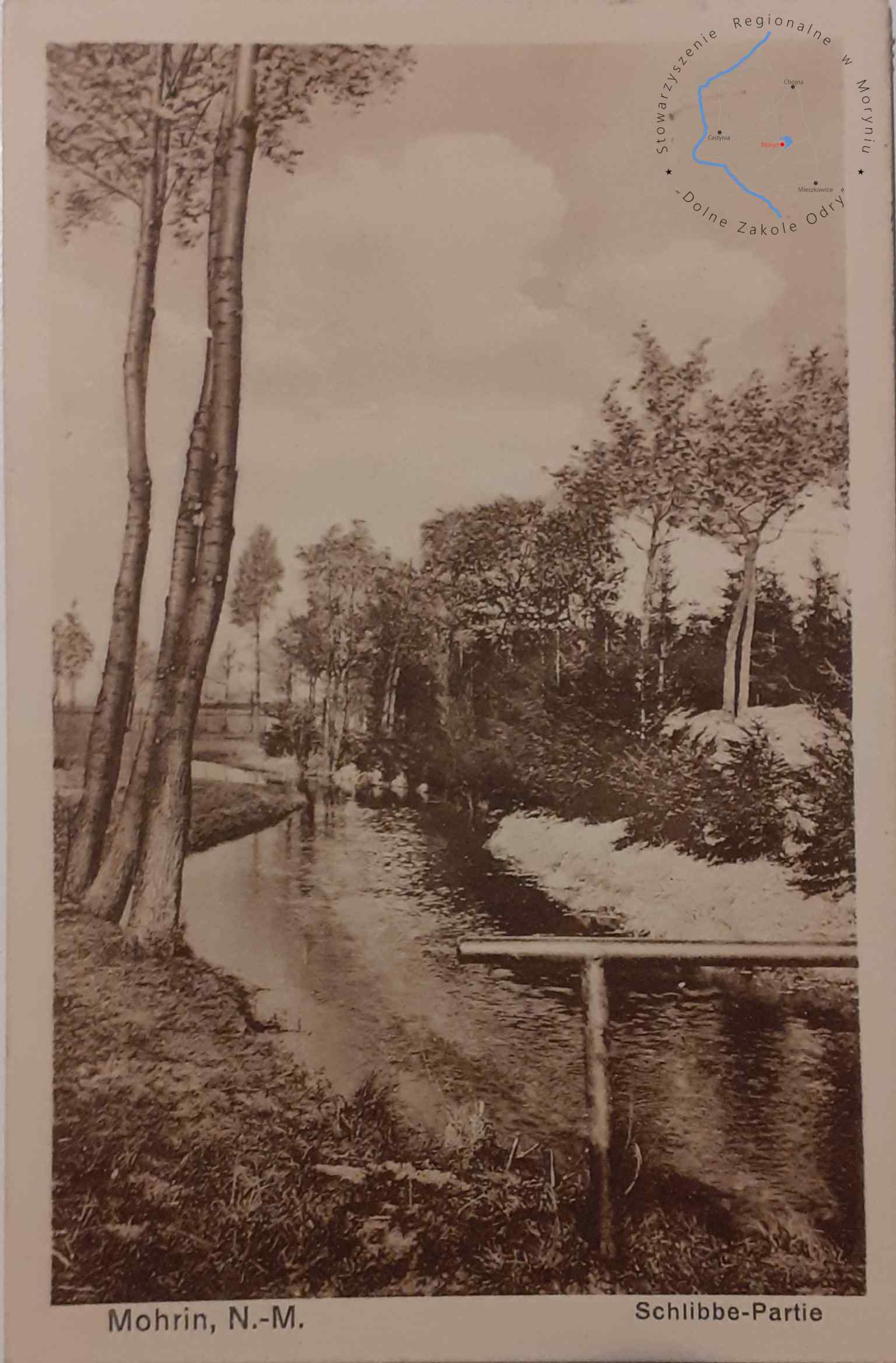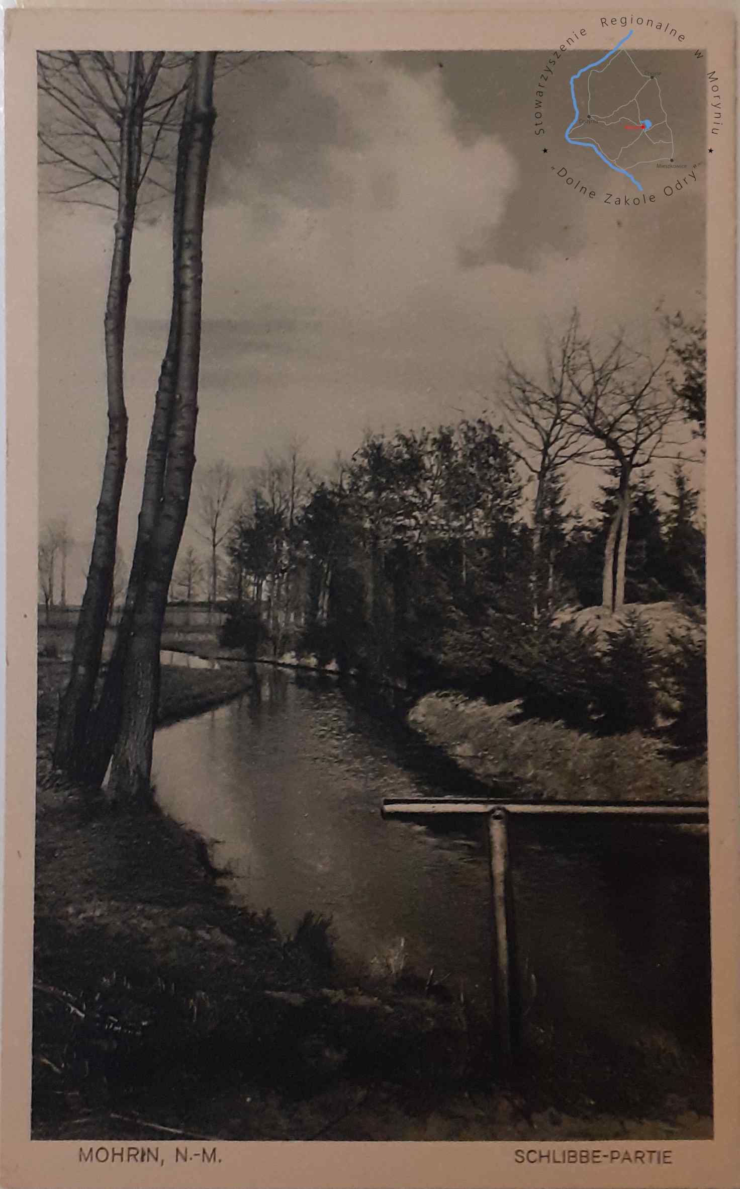 Pocztówka z obiegu, poczta Moryń 4. 11. 1930Wydawca: J. L. R.MORYŃ Fragment rzeki Słubi