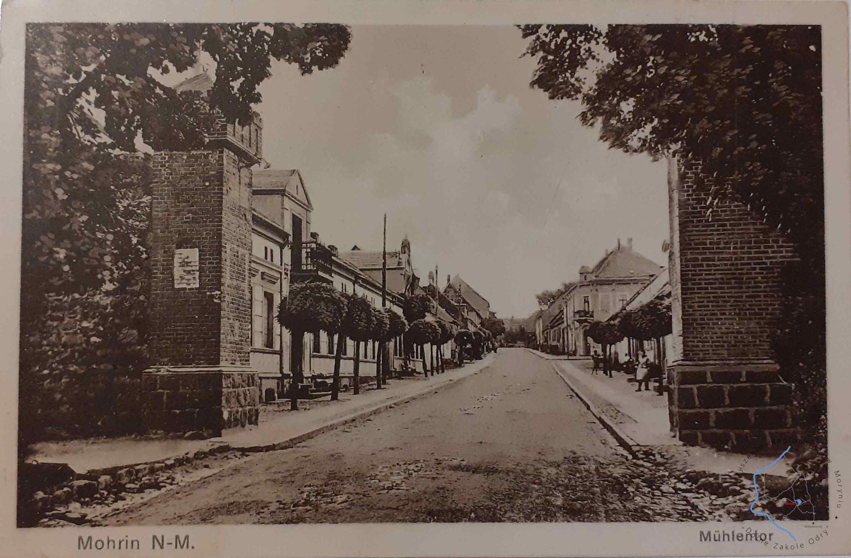 Pocztówka bez obieguWydawca: J. L. R.MORYŃ Brama Młyńska i ulica Stefana Żeromskiego