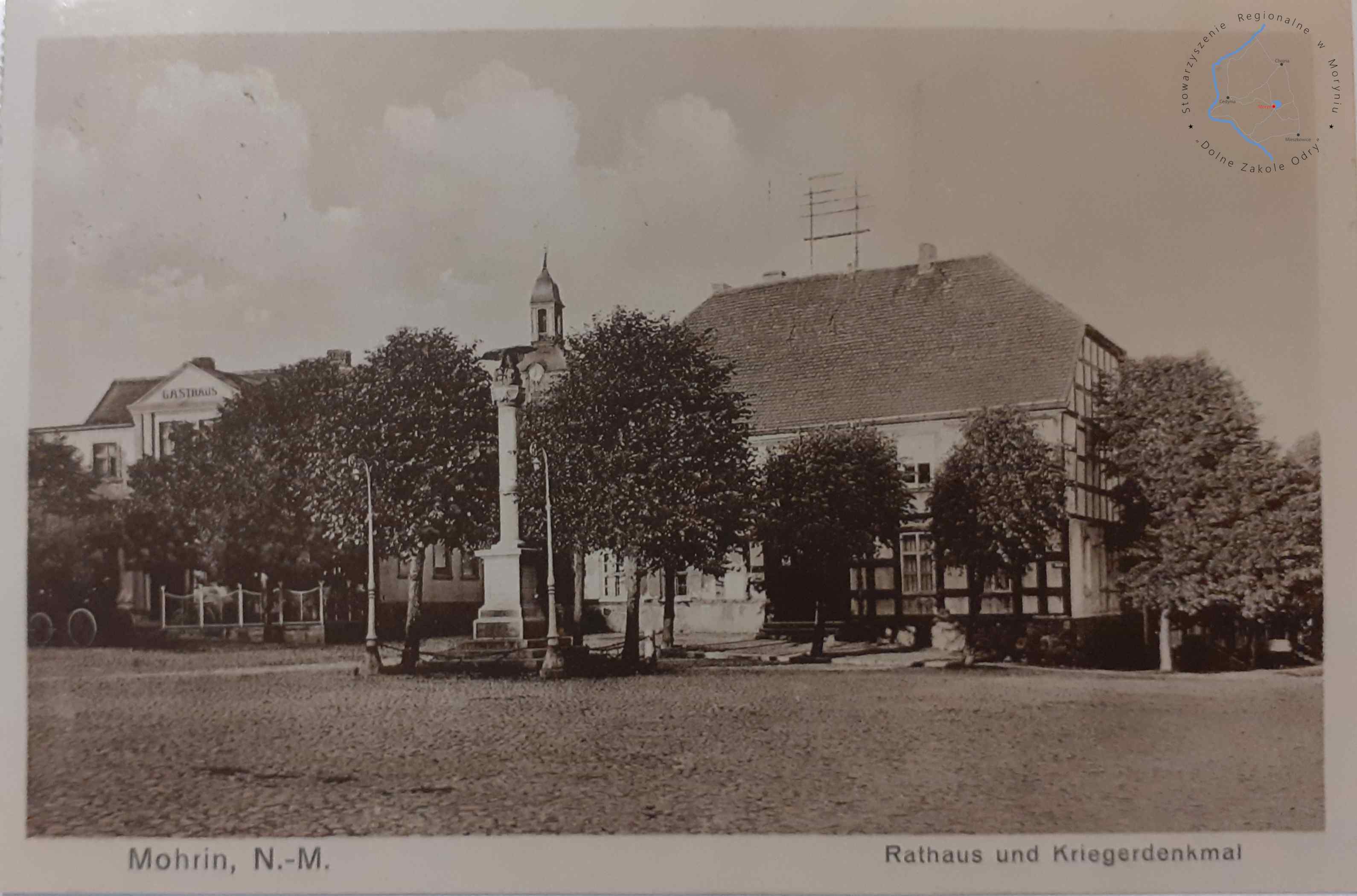Pocztówka z obiegu, poczta Moryń 16. 9. 1930Wydawca: J. L. R.MORYŃ Rynek z pomnikiem wojennym, ratuszem i dawnym dom...