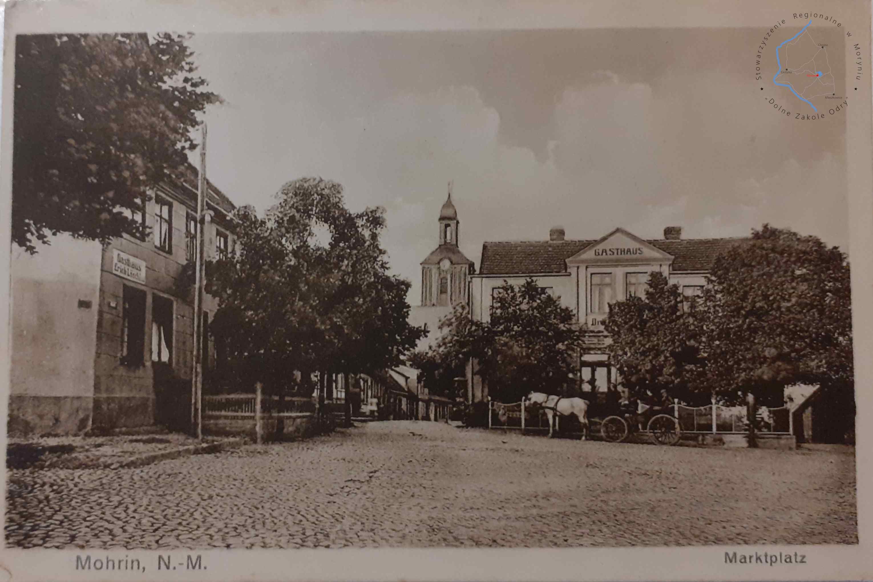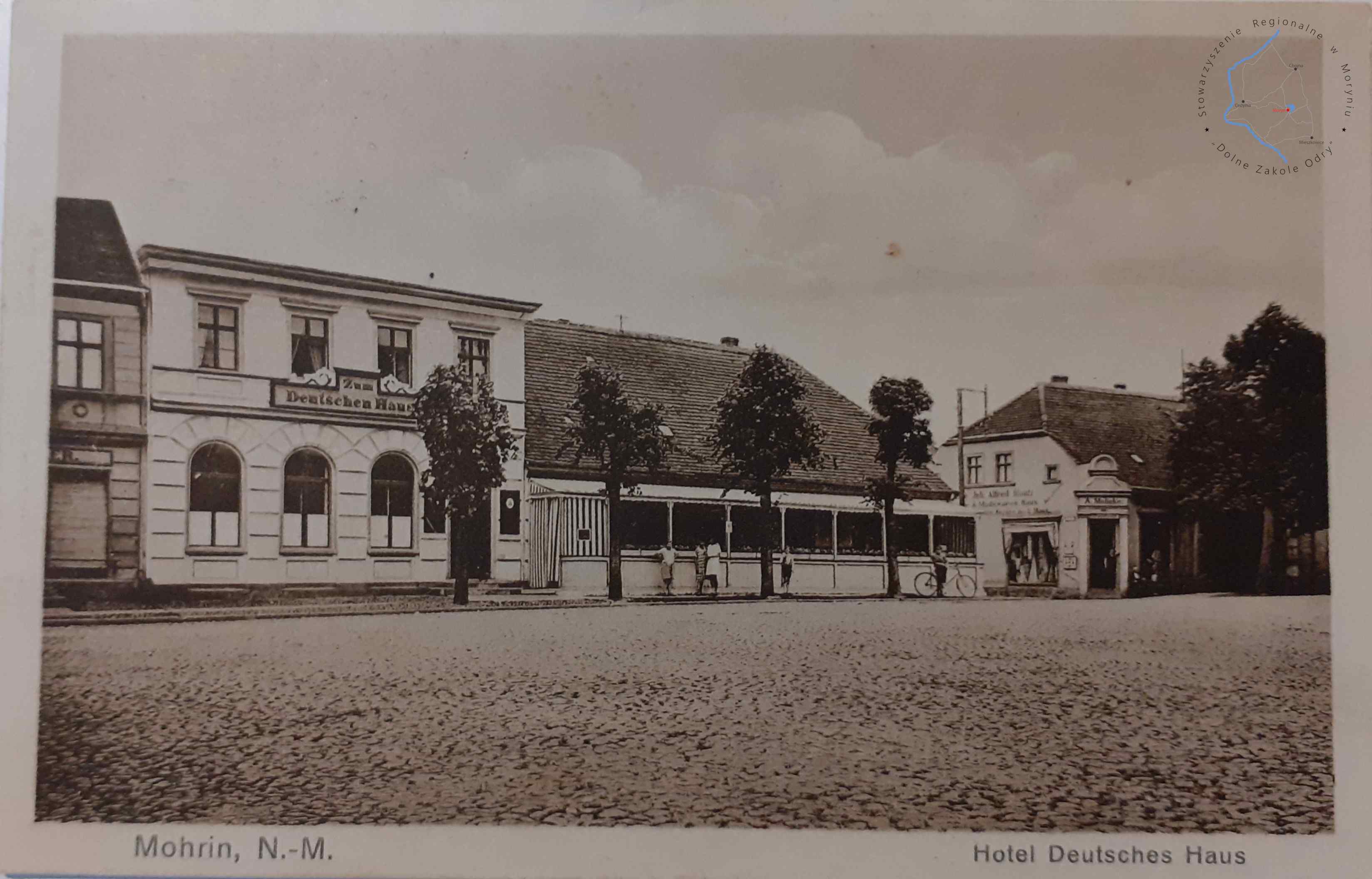 Pocztówka bez obiegu Wydawca: J. L. R.MORYŃ Fragment rynku z domem gościnnym, właściciela Hermanna Diescher.“Drei...