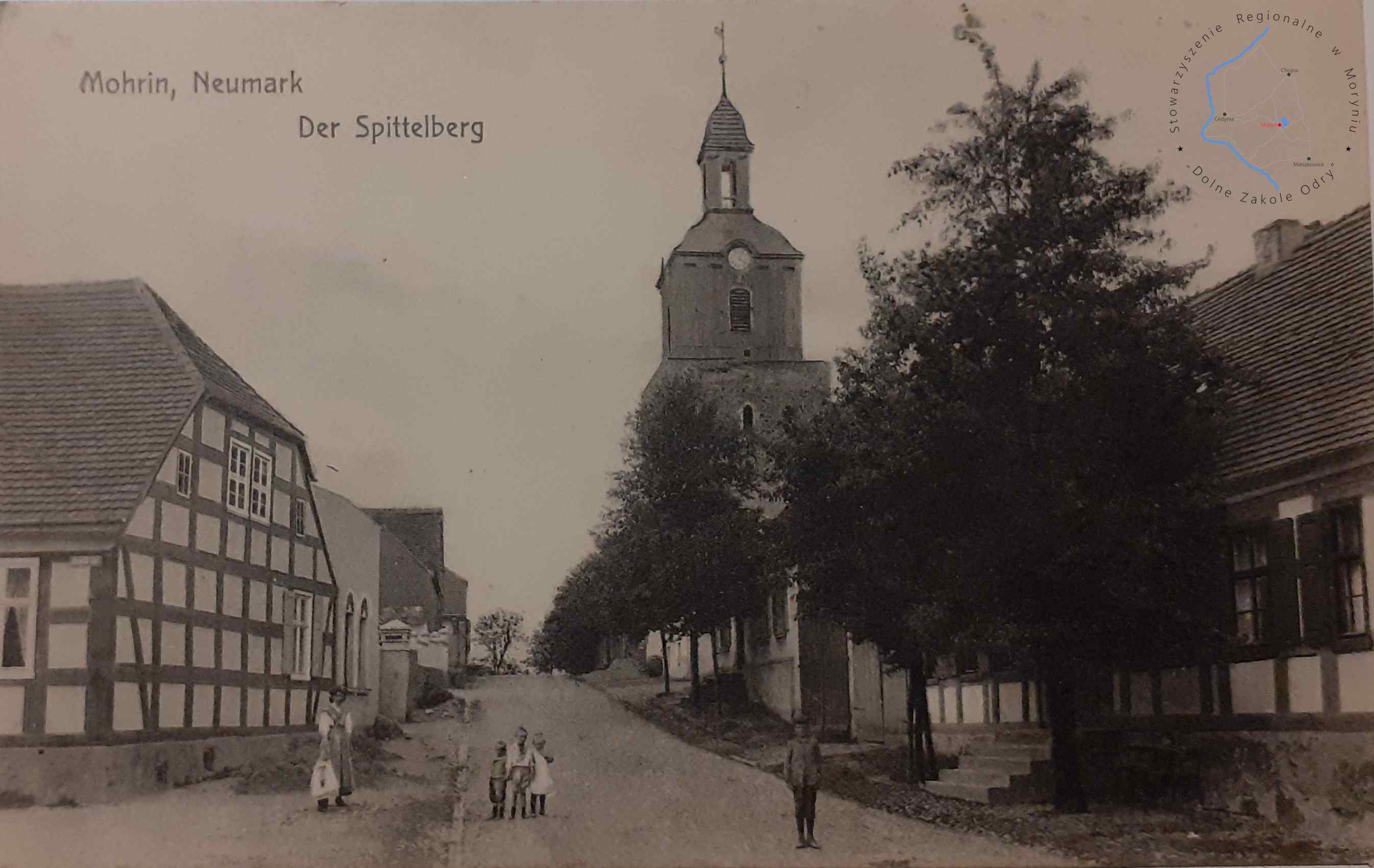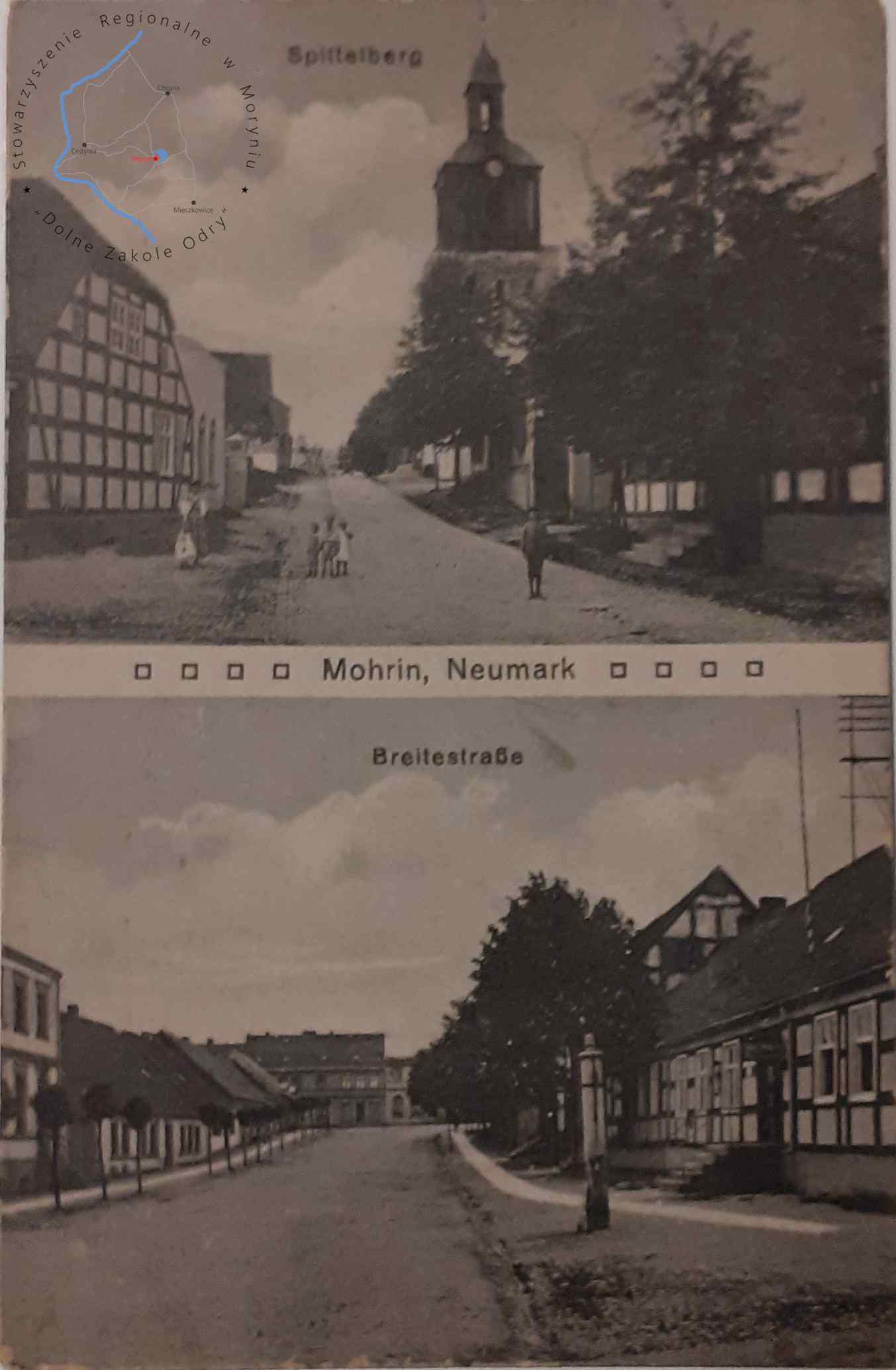 Pocztówka bez obieguWydawca: Johann Lindenberg RathenowMORYŃ Widok na ulicę Szkolną, dalej Ogrodową