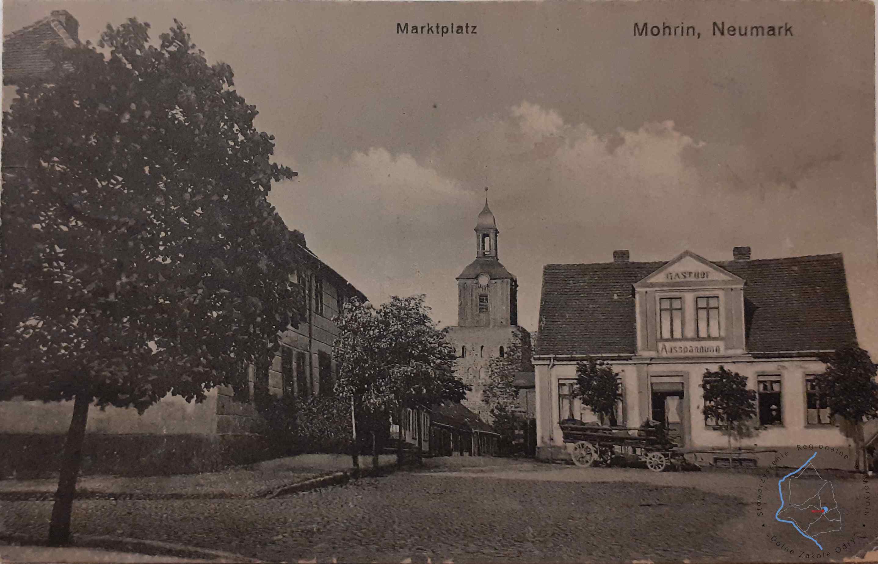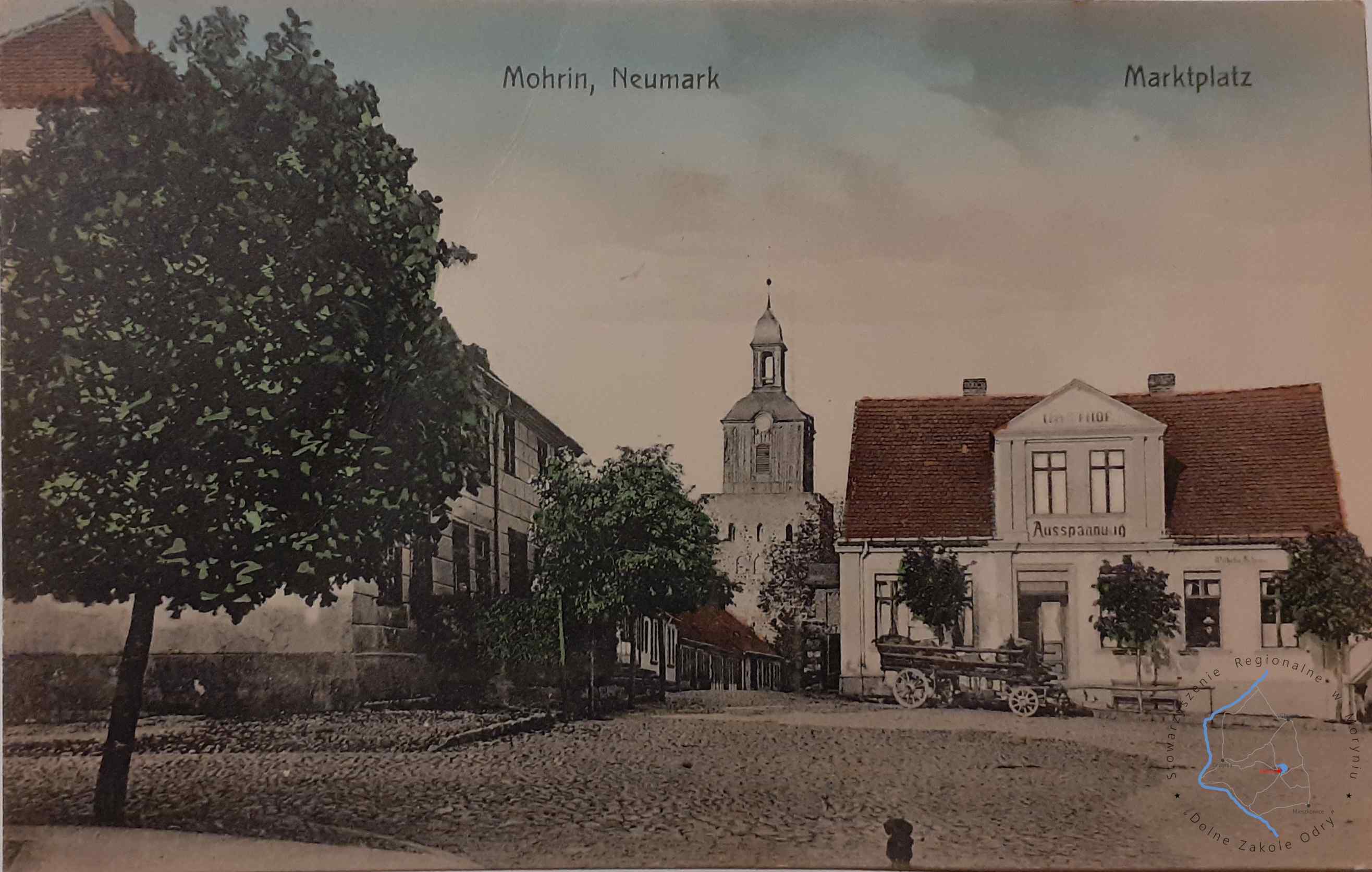 Pocztówka bez obieguWydawca: Joh. Lindenberg, RathenowMORYŃ Fragment rynku z domem gościnnym, właściciela Hermanna Diesc...