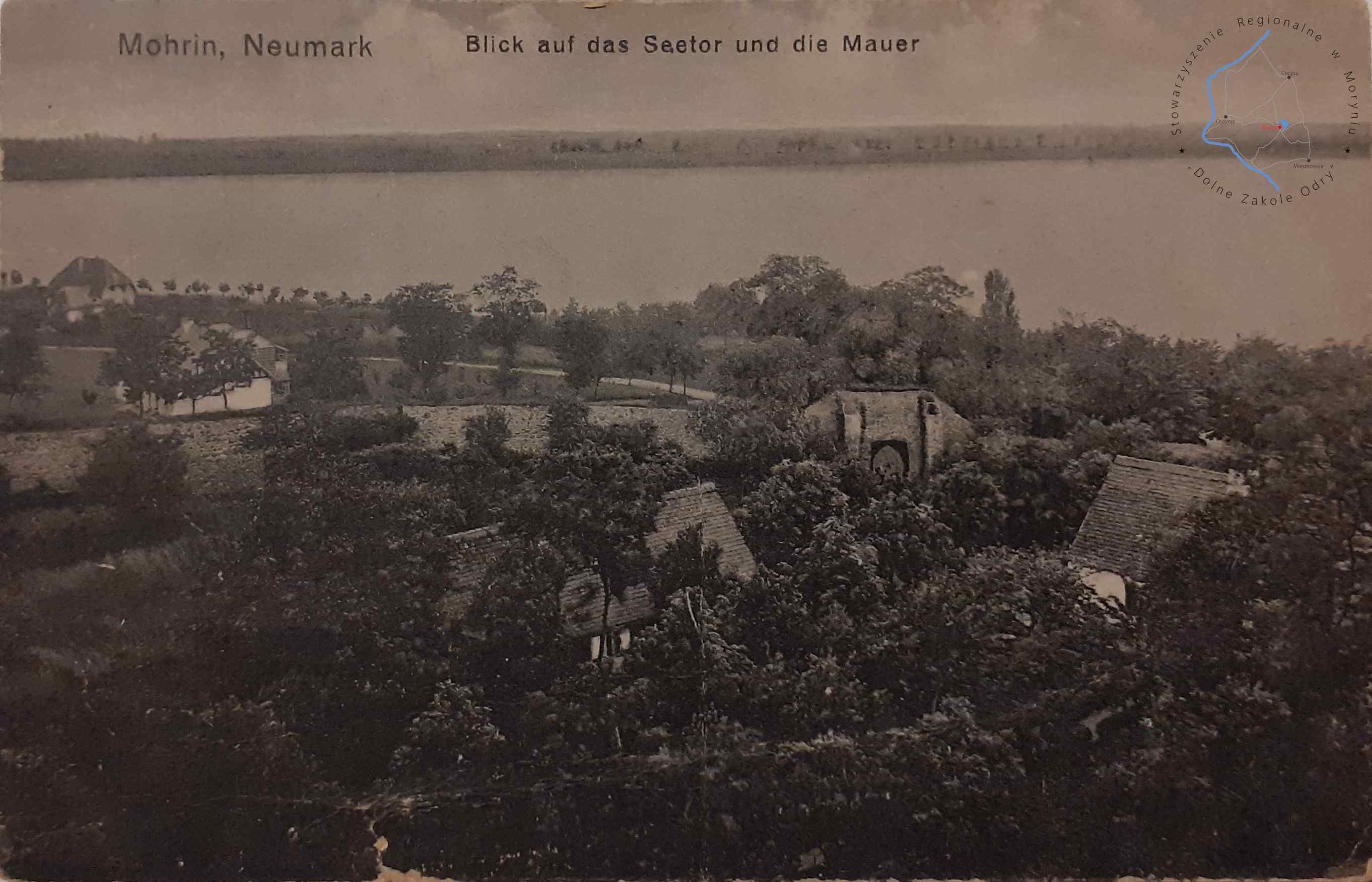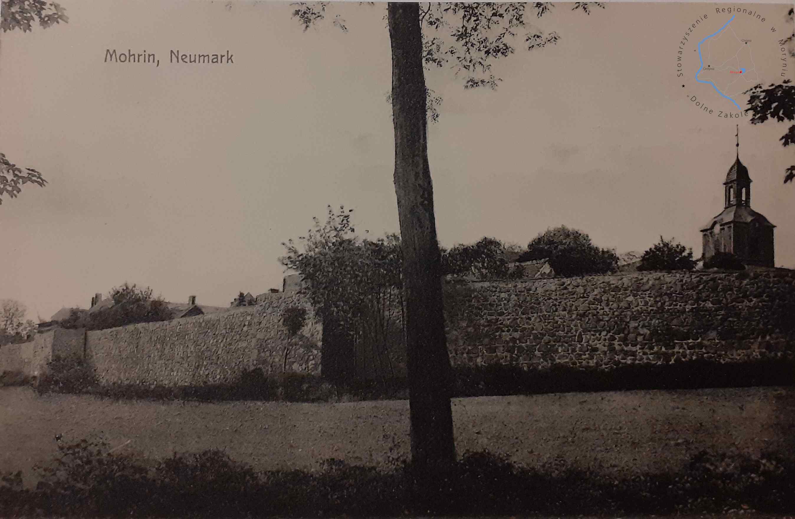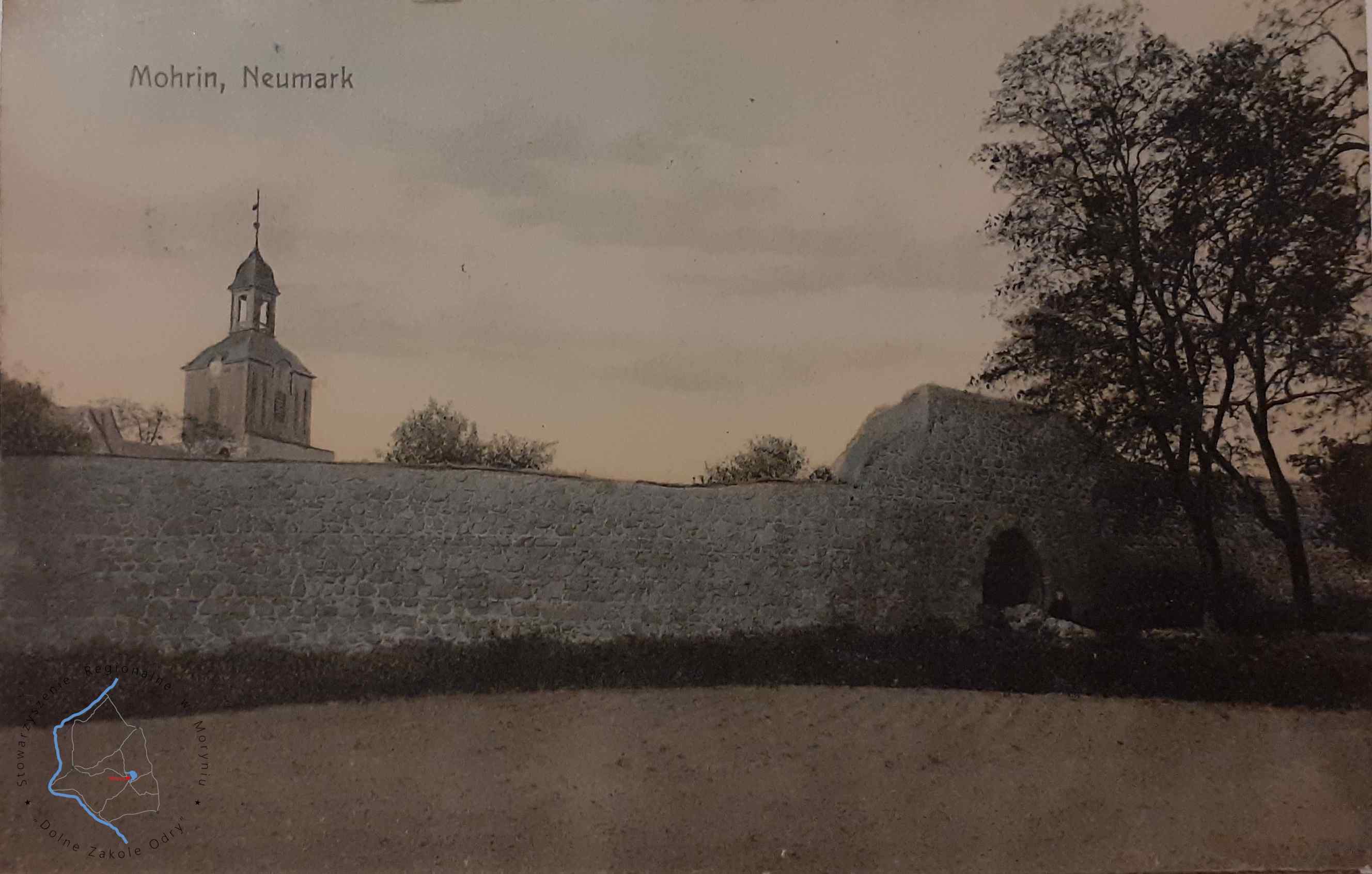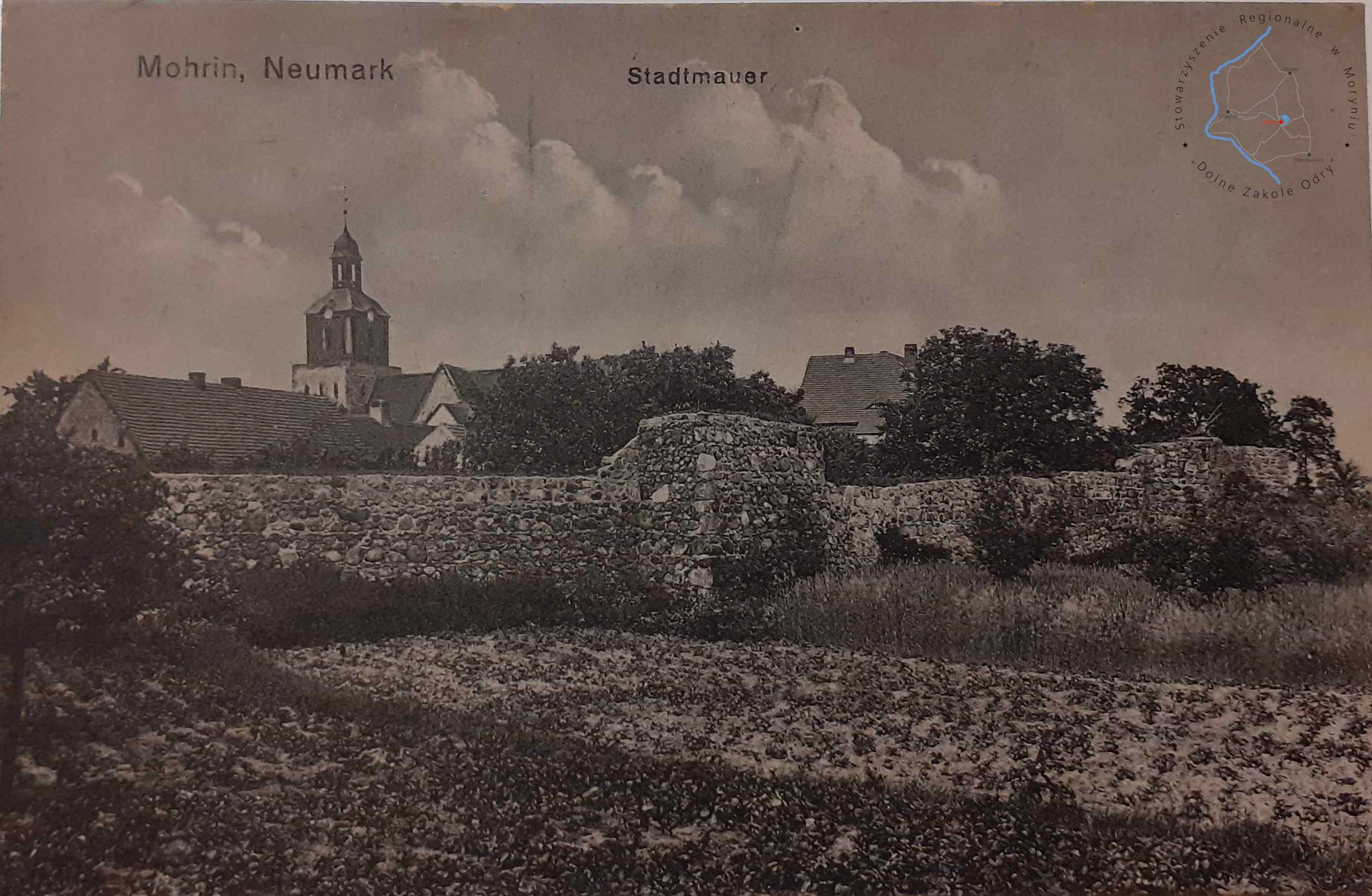 Pocztówka bez obieguWydawca: Johann Lindenberg, RathenowMORYŃ Fragment murów miejskich i kościół Świętego Duch