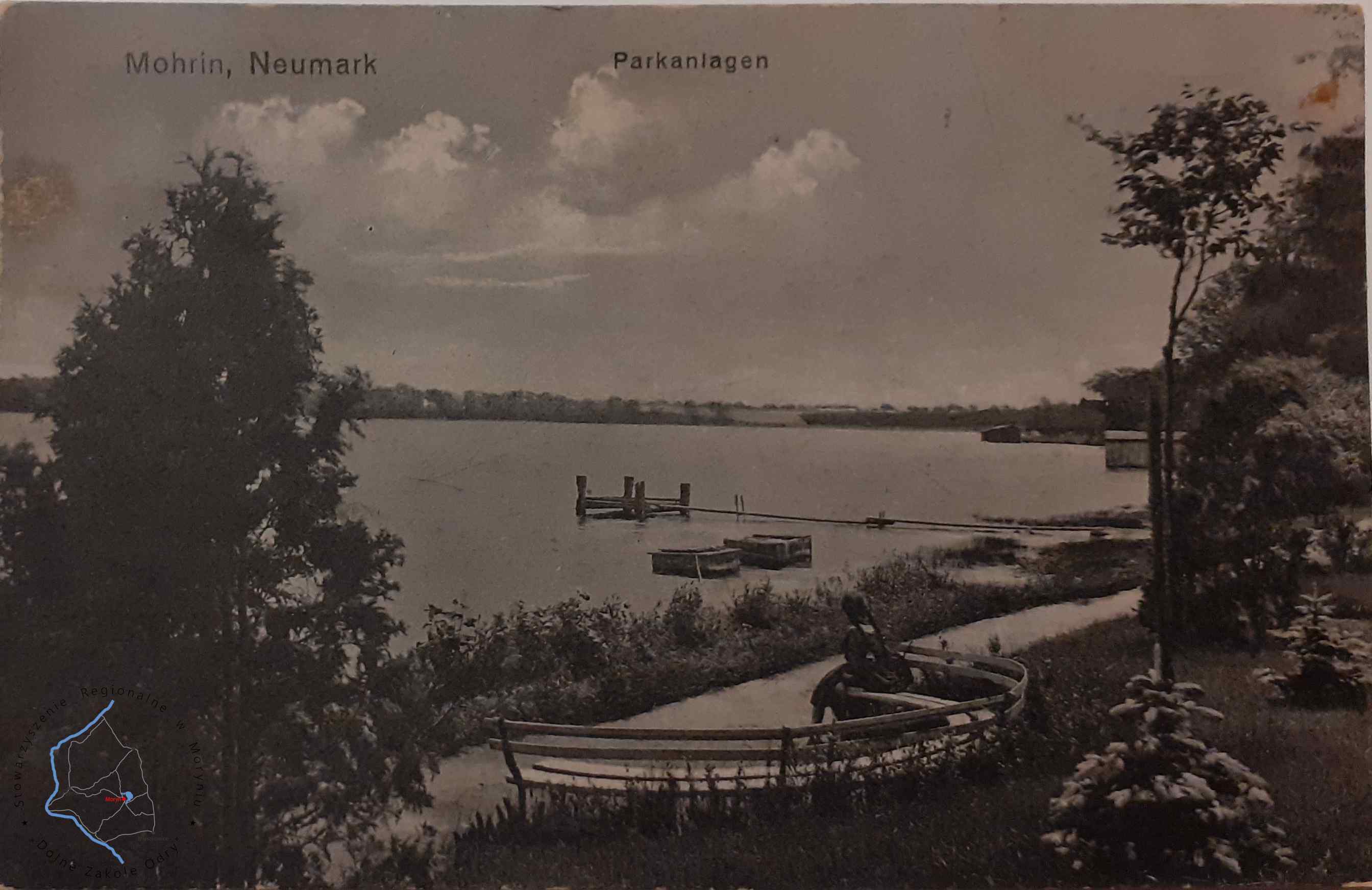 Pocztówka z obiegu, poczta Moryń 20. ?. 1921Wydawca: J. L. R.MORYŃ Fragment promenady nad jeziorem Morzycko