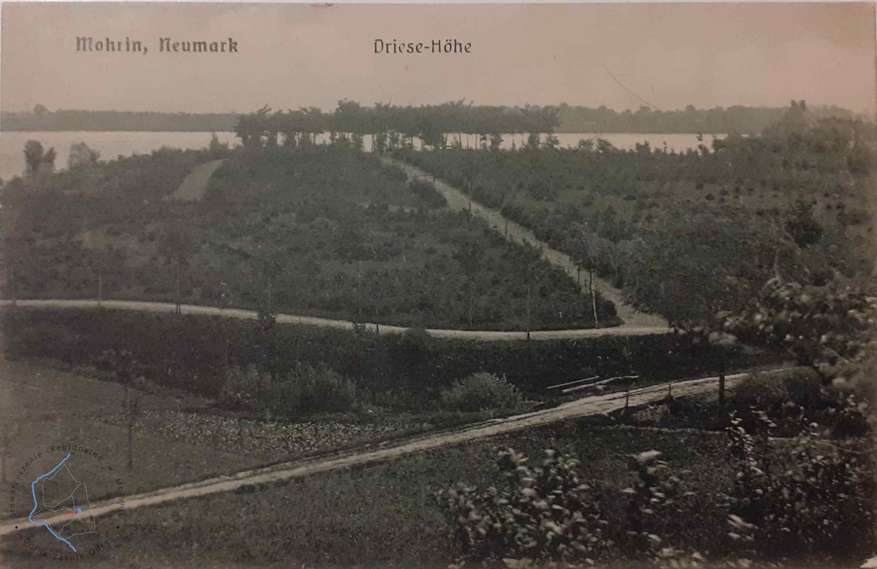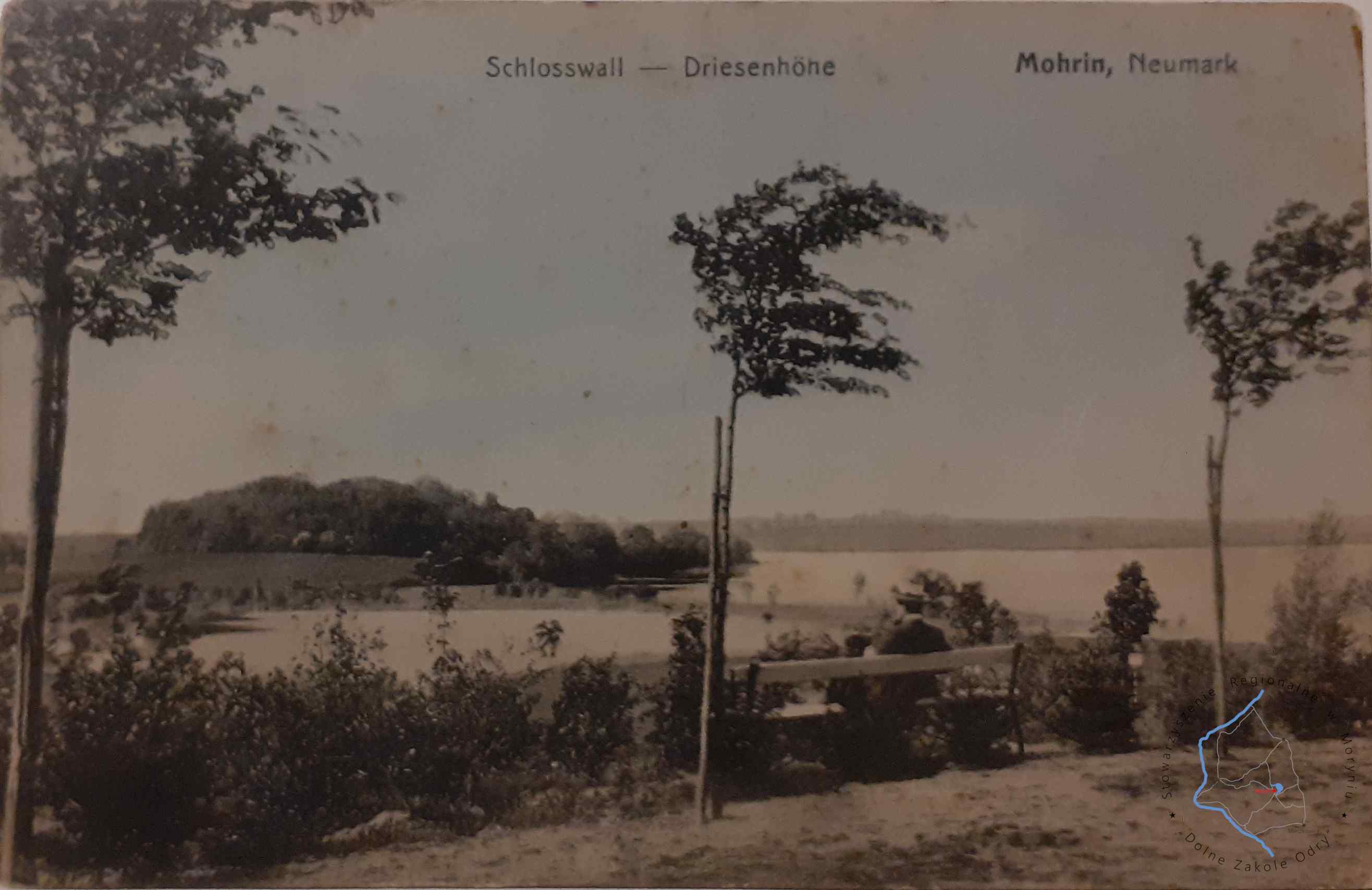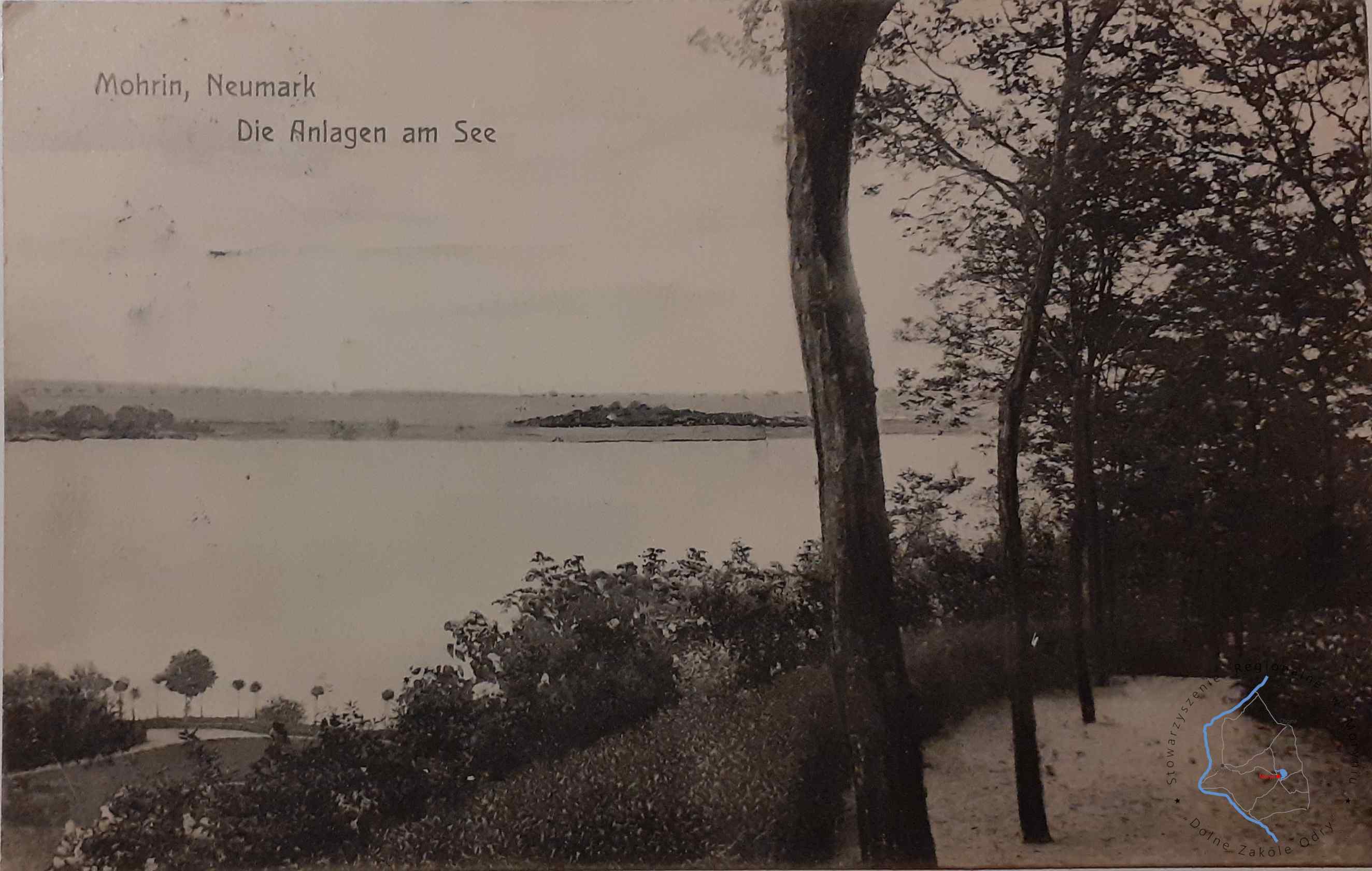Pocztówka z obiegu, poczta Moryń 8. 8. 1915Wydawca: Johann Lindenberg, RathenowMORYŃ Widok z parku na półwysep z r...
