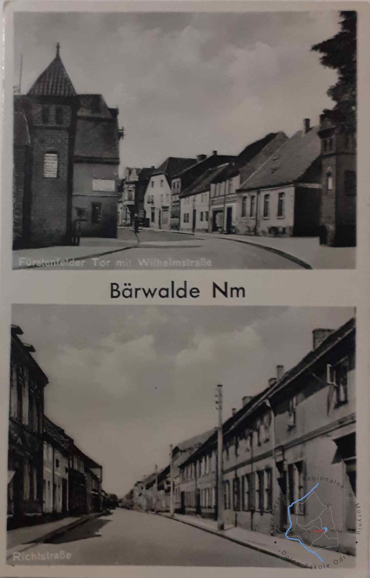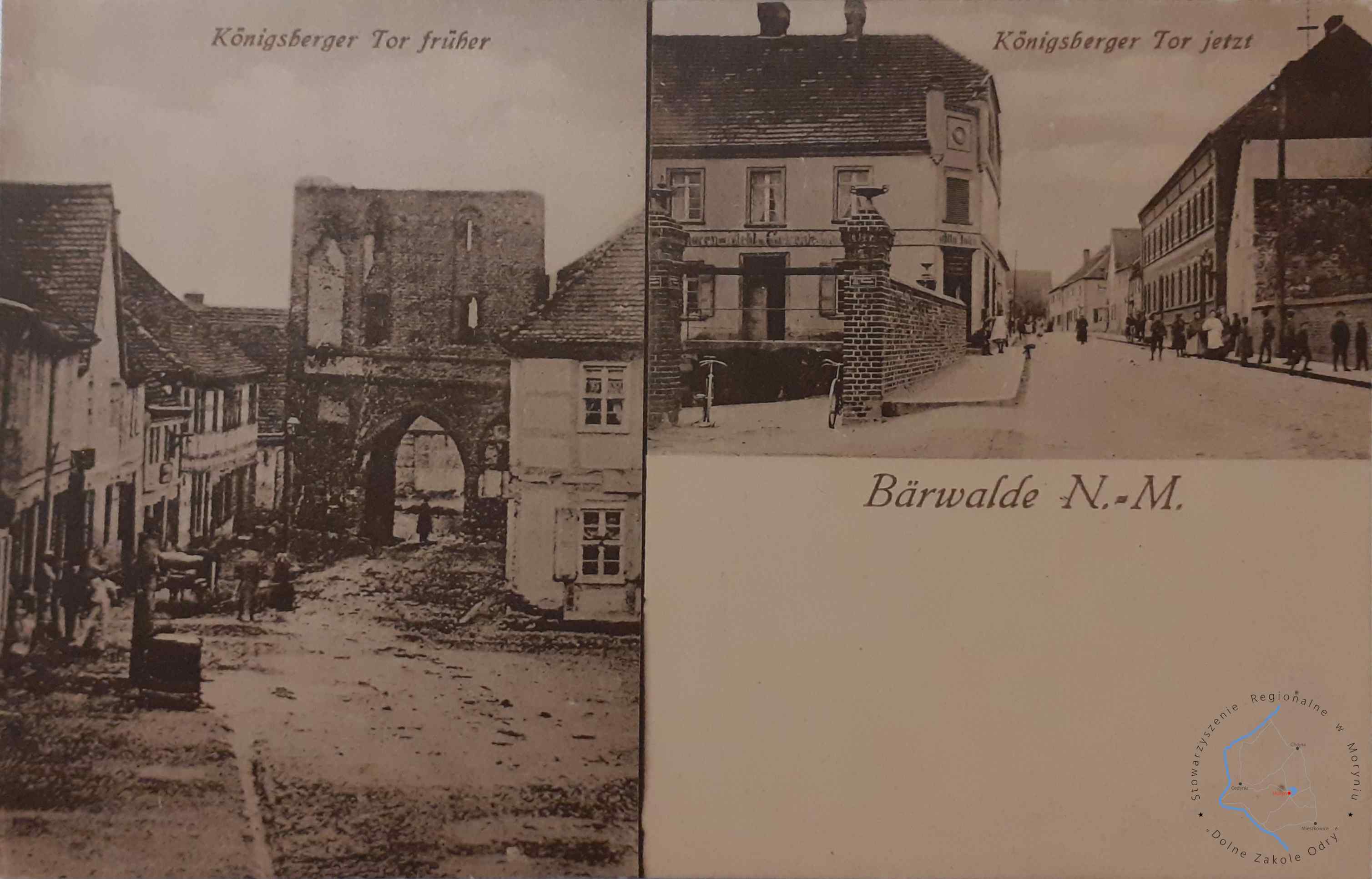 Pocztówka bez obieguWydawca: Gorner Verlag, Barwalde N.M.MIESZKOWICE Ulica Słowackiego, Brama Chojeńska dawniej i (dziś).
