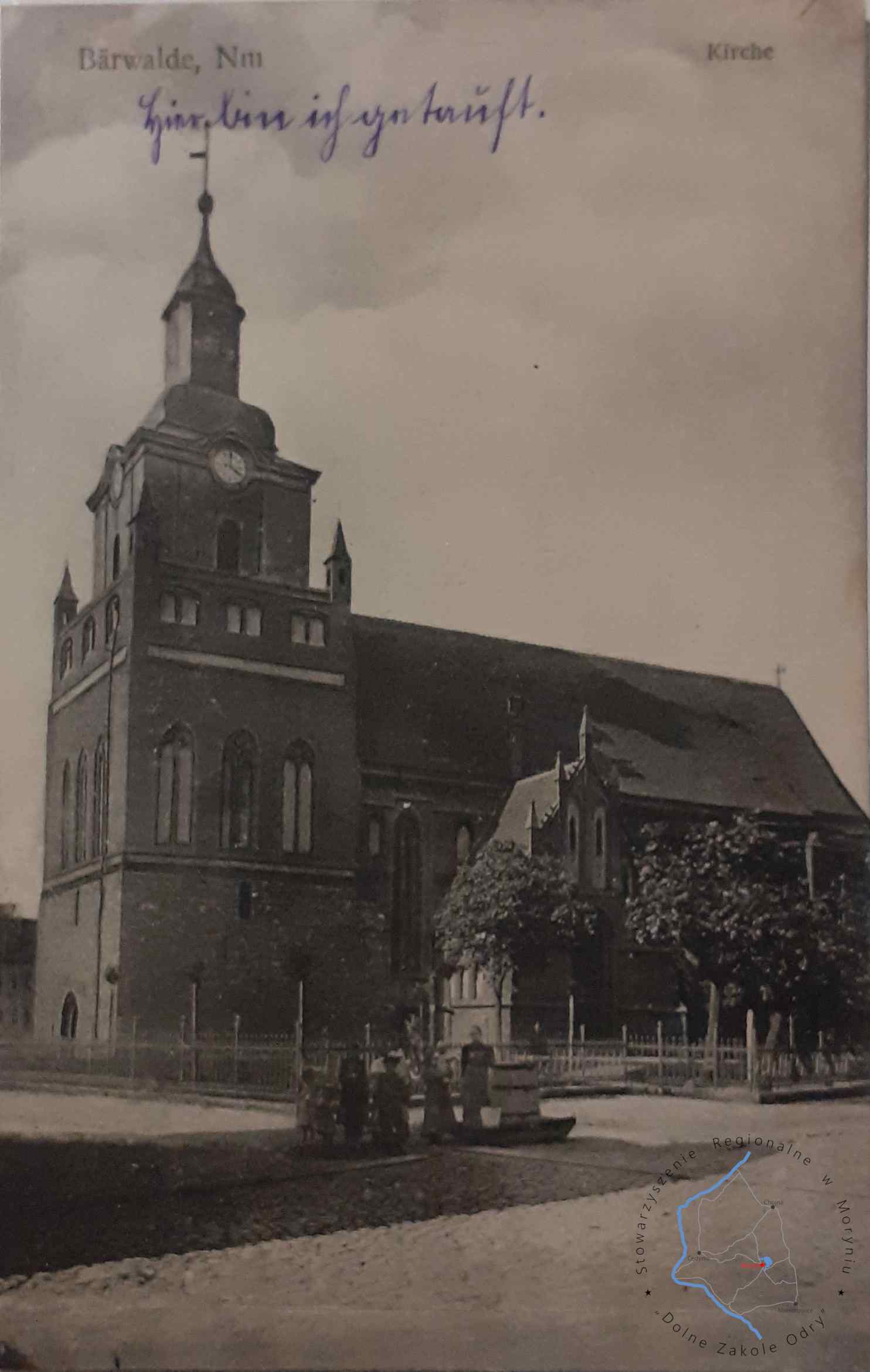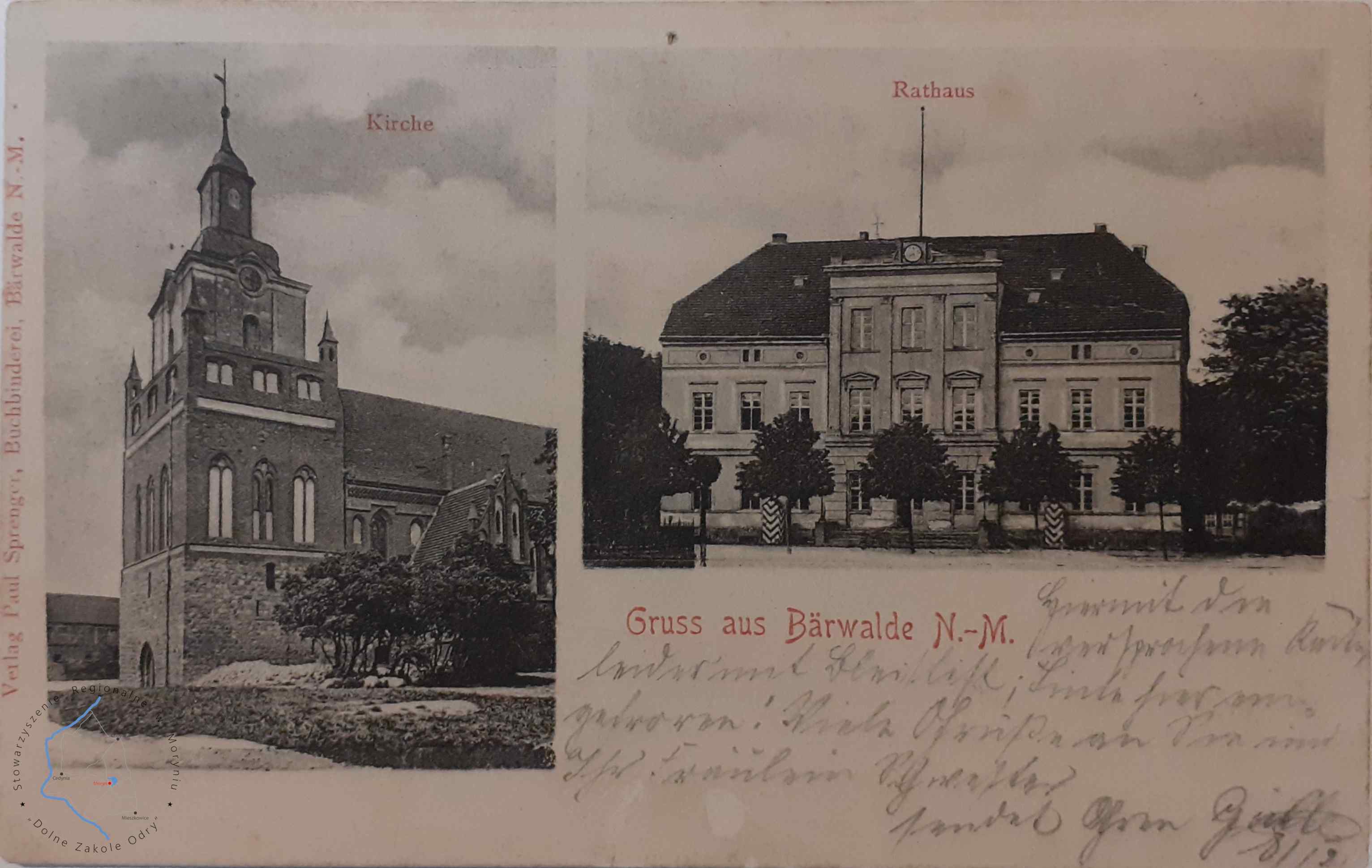 Pocztówka z obiegu, poczta Mieszkowice 16. 9. 1904Wydawca: Paul Sprenger, Buchbinderei, Barwalde N.-M.Kościół i rat...