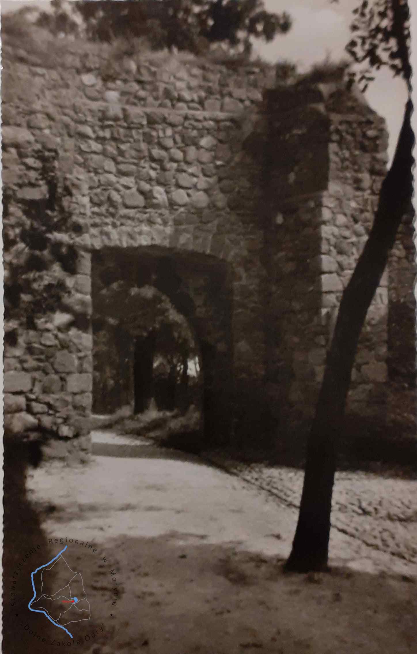 Pocztówka z obiegu, poczta Mieszkowice 25. 5. 1931Wydawca: Josef Reckziegel, Barwalde N. M.MIESZKOWICE Fragment Baszty...