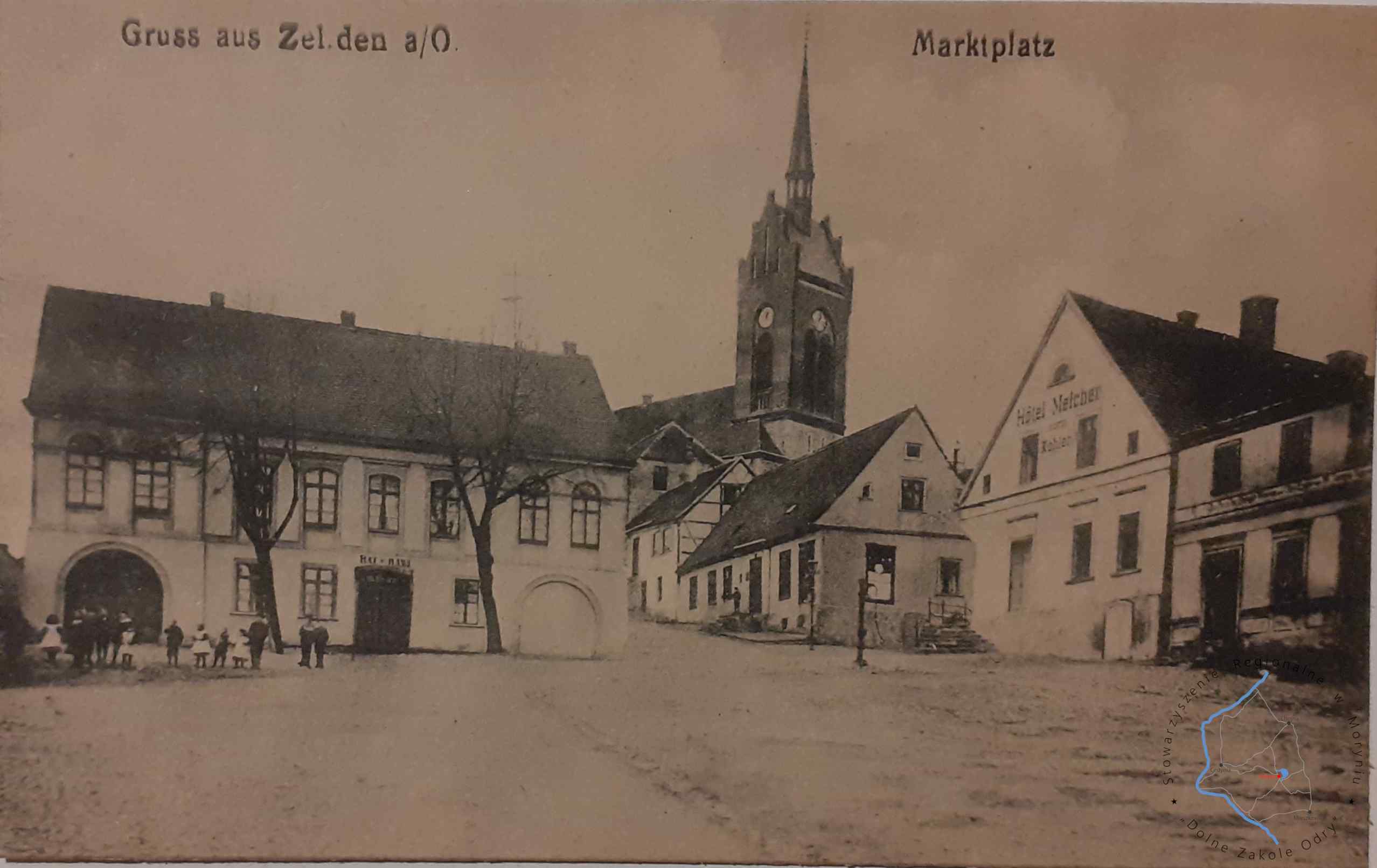 Pocztówka bez obieguWydawca: E. Rammin, Photogr. Zehden 1918 (Cedynia)CEDYNIA Fragment rynku z ratuszem i kościołem ...
