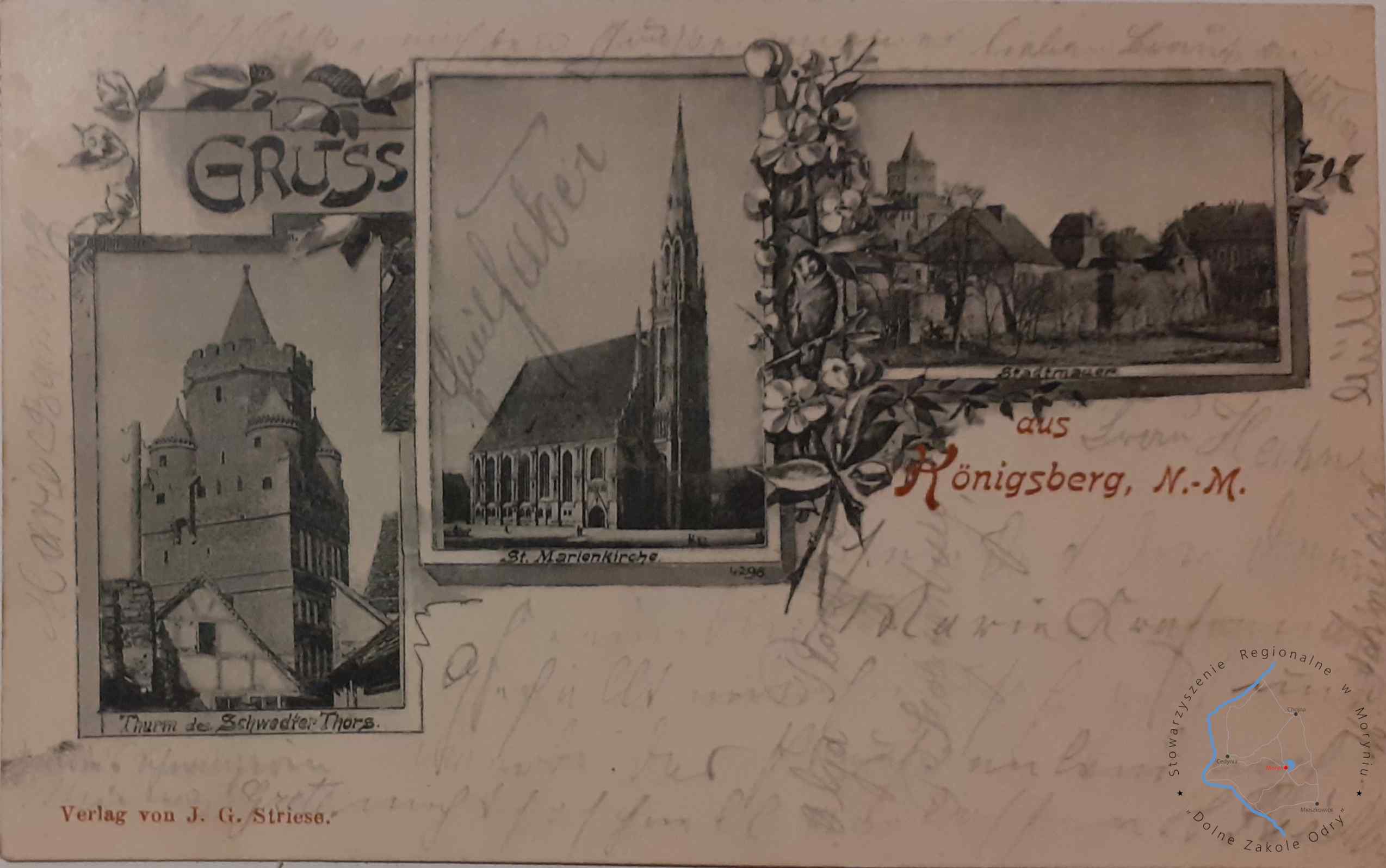Pocztówka z obiegu, poczta Chojna 19. 11. 1898Wydawca: J. G. Striese.Pocztówka wielowidokowa, Brama Świecka, Kości...