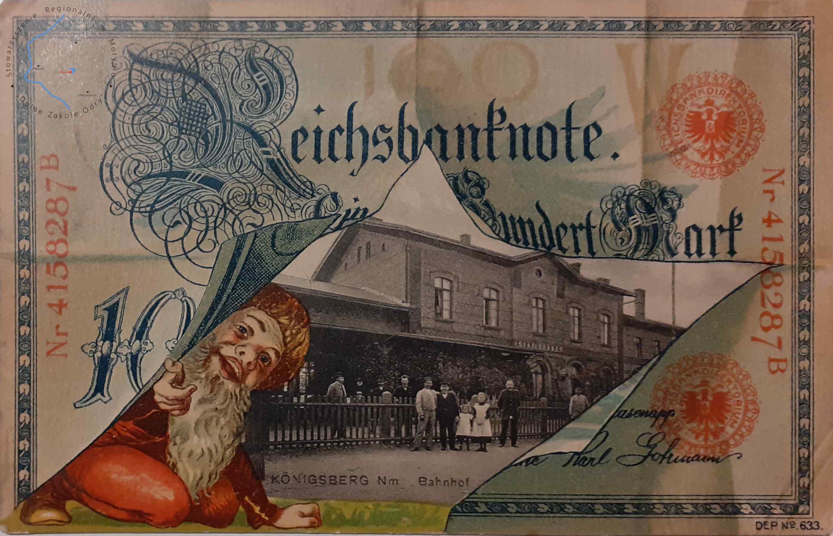 Pocztówka z obiegu, poczta Chojna 7. 9. 1909Wydawca: Charles Lehmann, BerlinBanknot z dworcem w Chojnie